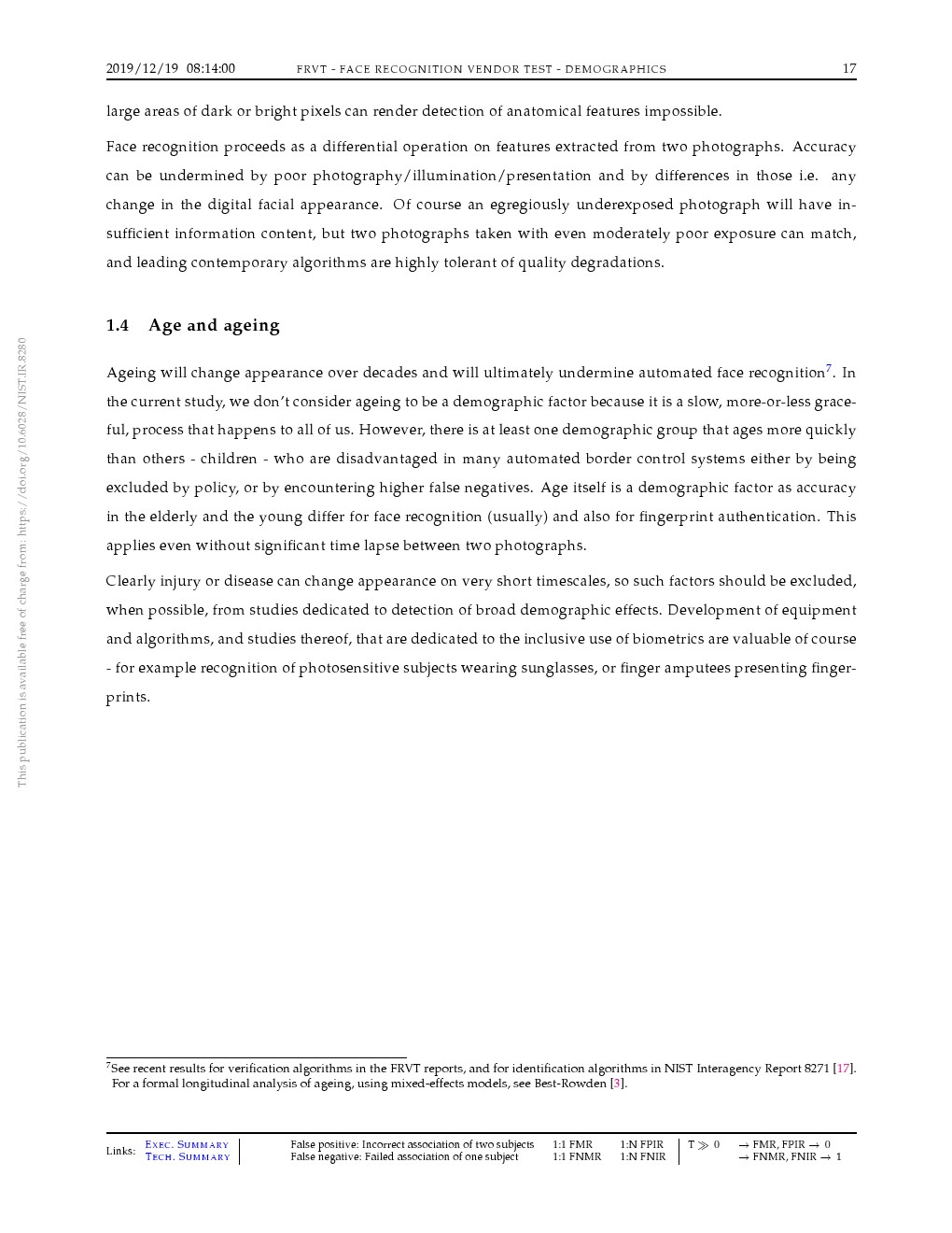 衰老将在几十年内改变容貌,最终将破坏自动人脸识别。年龄本身是人口统计因素,因为老年人和年轻人的准确性和指纹认证都不同,即使两张照片之间没有明显的时间间隔。