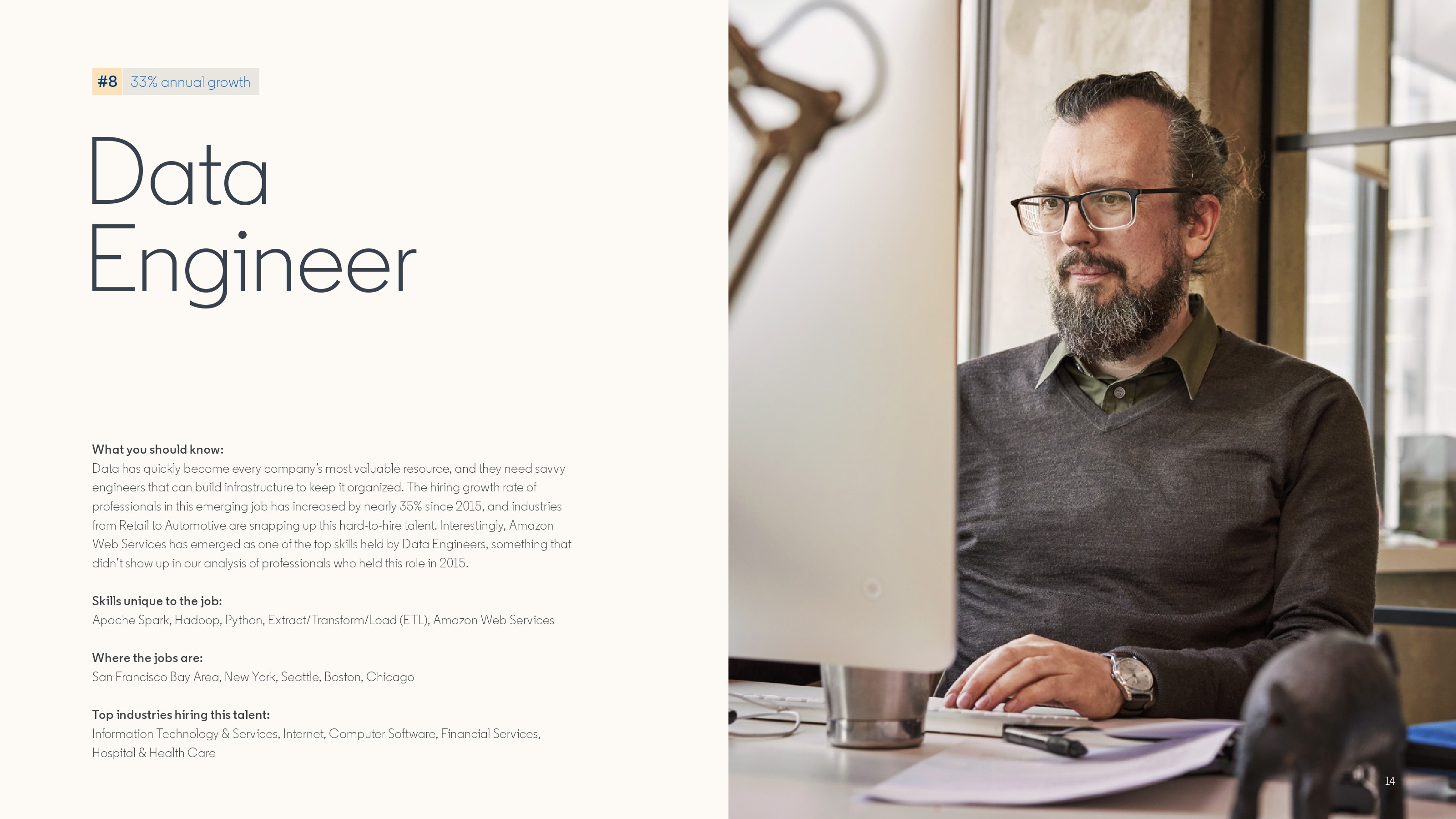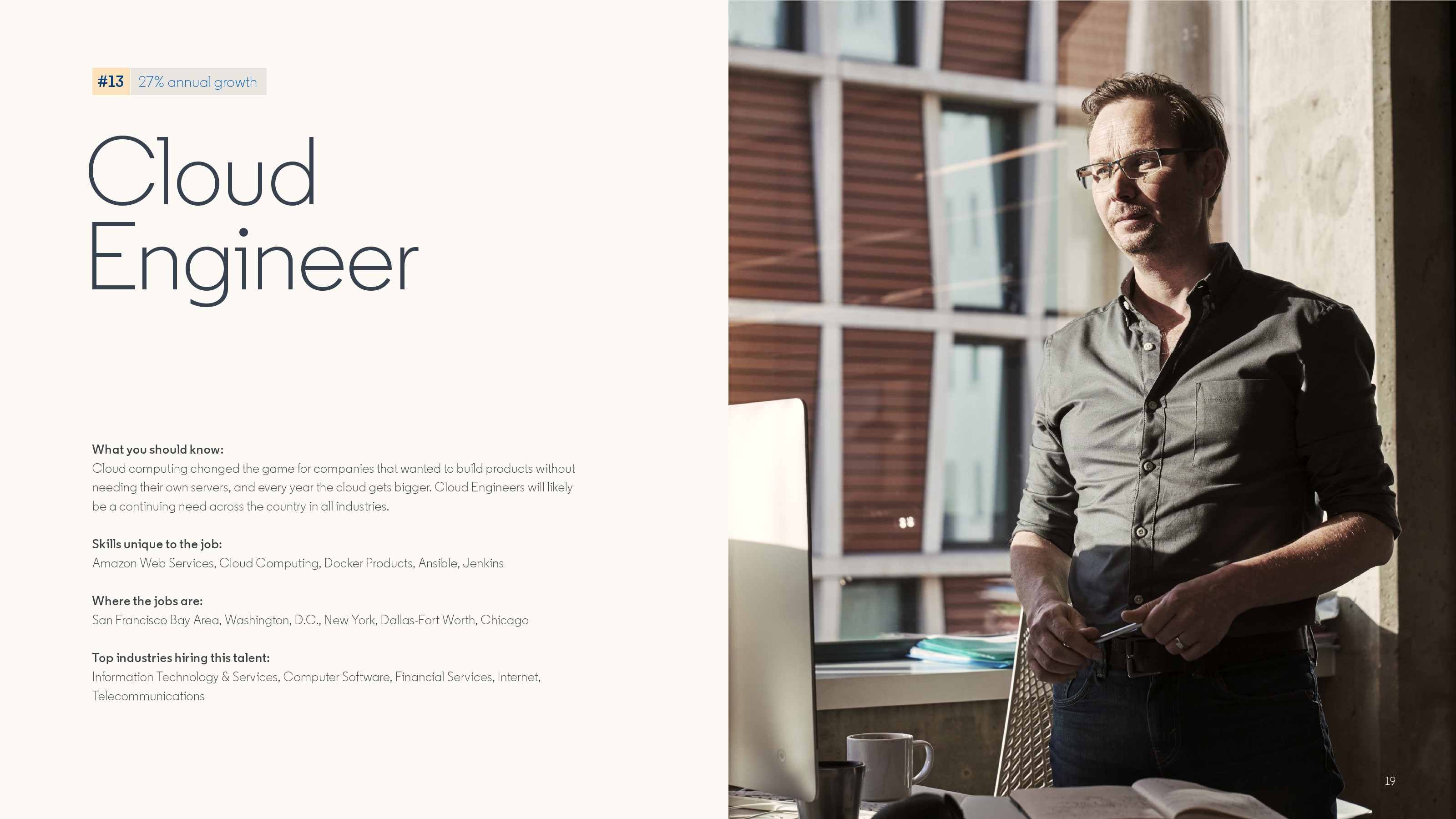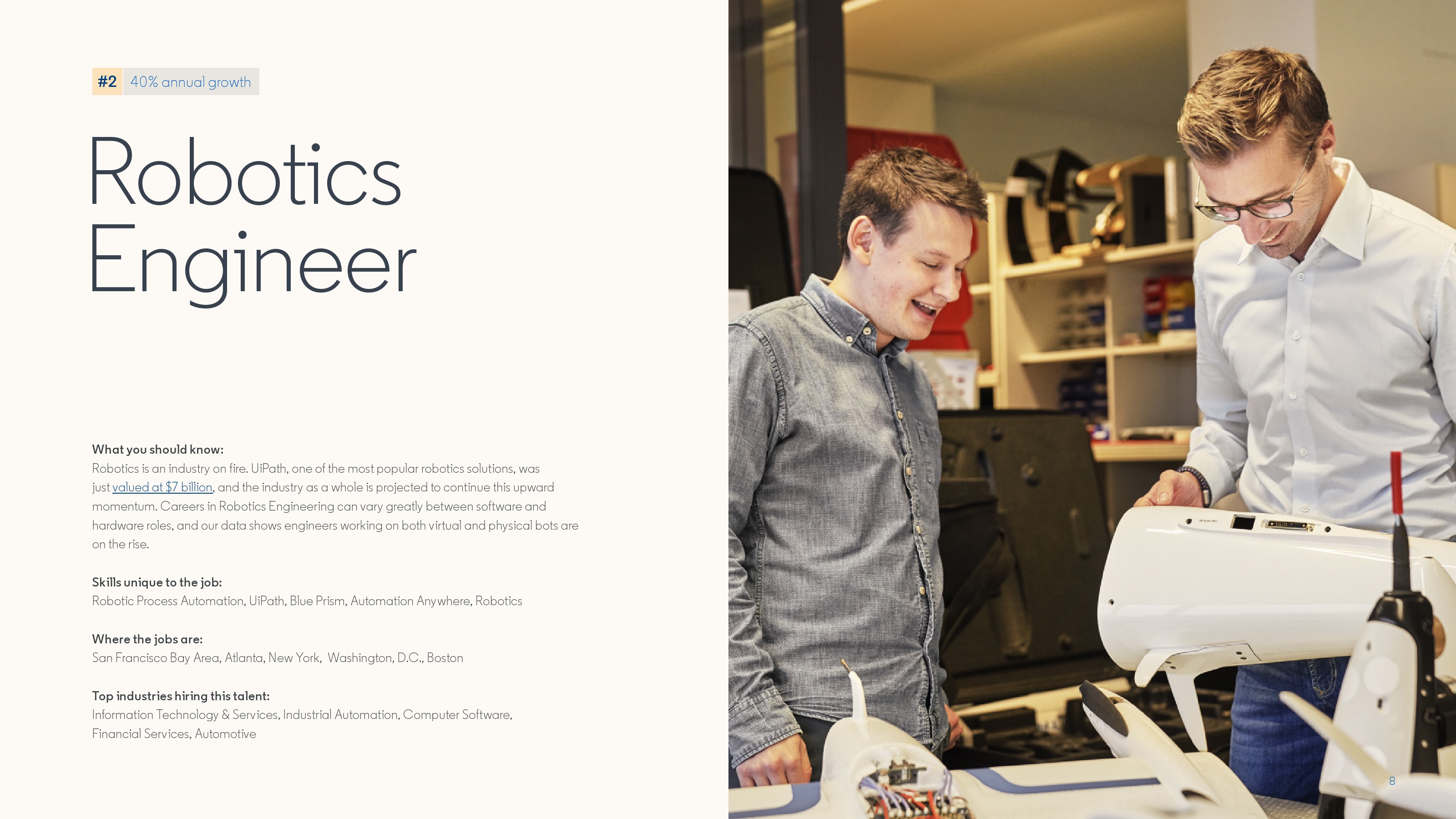 工程师:工程并不是一个新职业,但整个行业的工程职位仍在大幅增长。在今年的榜单中,超过50%的职位由与工程或开发相关的职位组成,新兴的机器人领域首次出现。