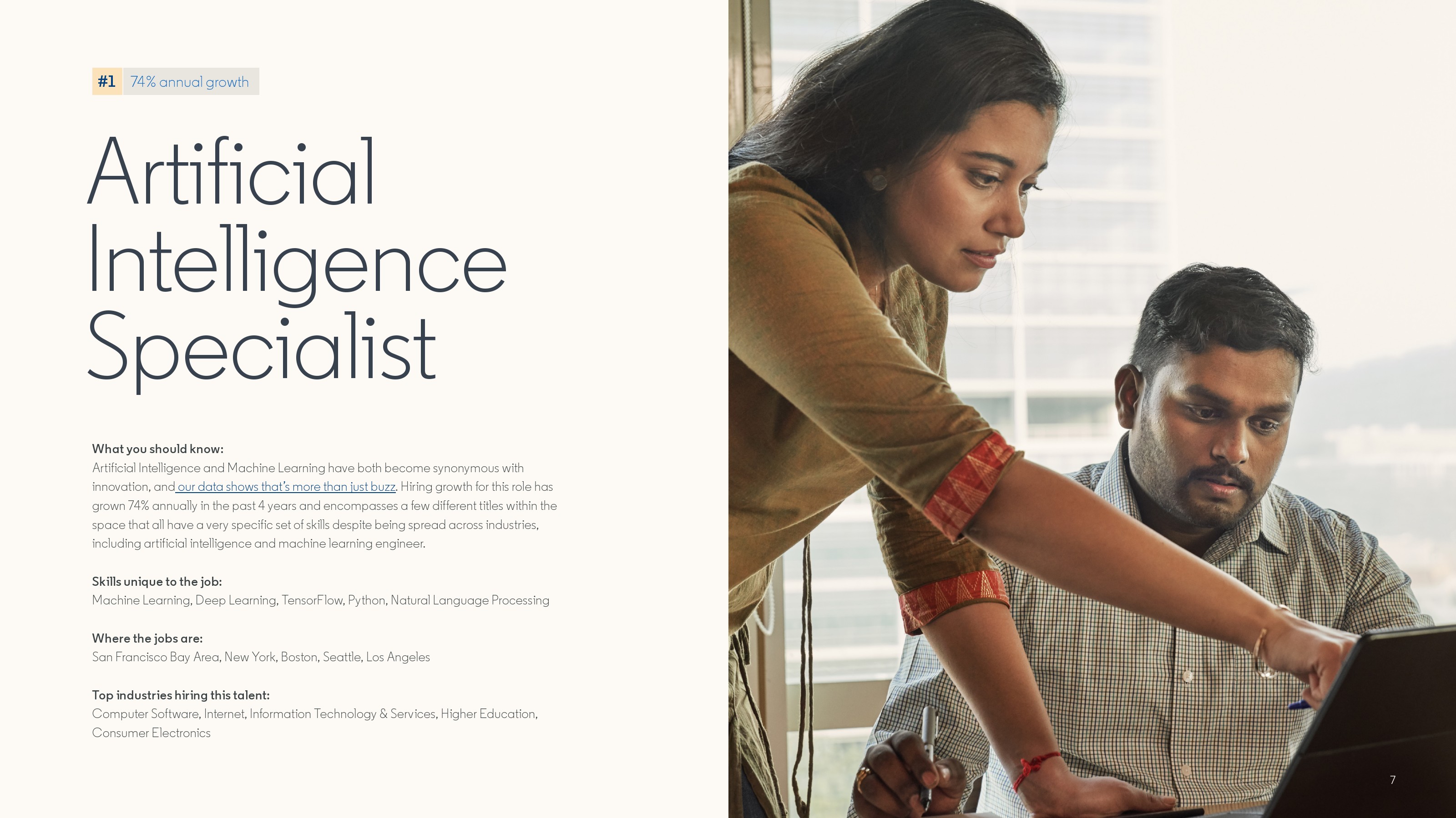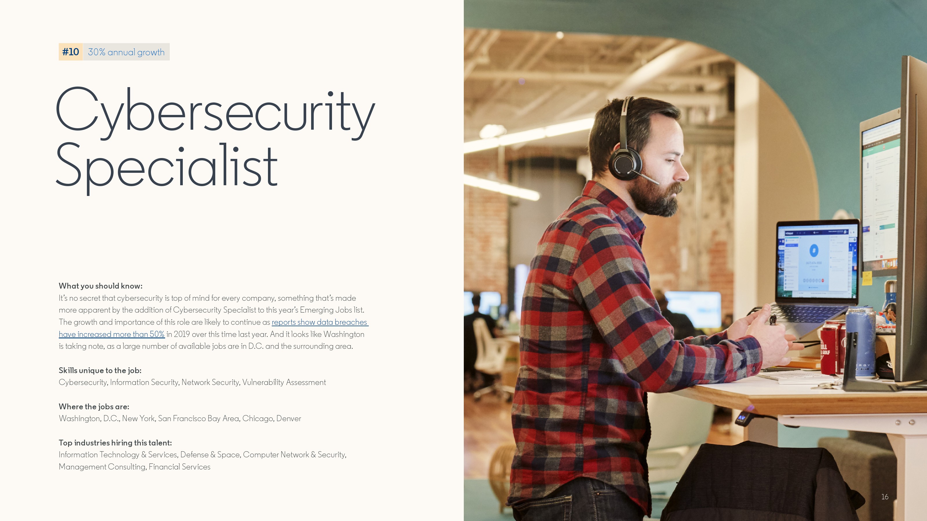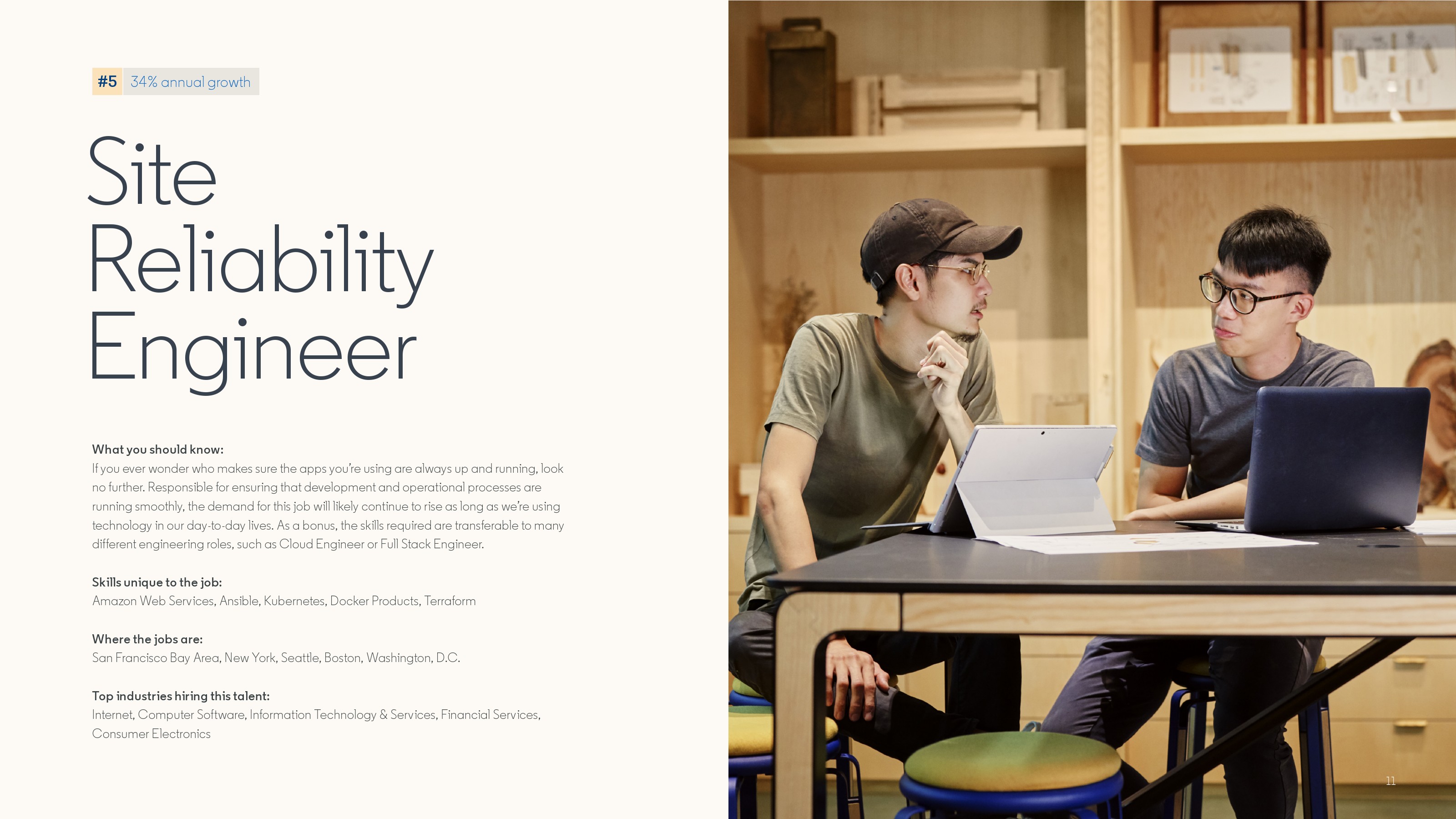 工程师:工程并不是一个新职业,但整个行业的工程职位仍在大幅增长。在今年的榜单中,超过50%的职位由与工程或开发相关的职位组成,新兴的机器人领域首次出现。