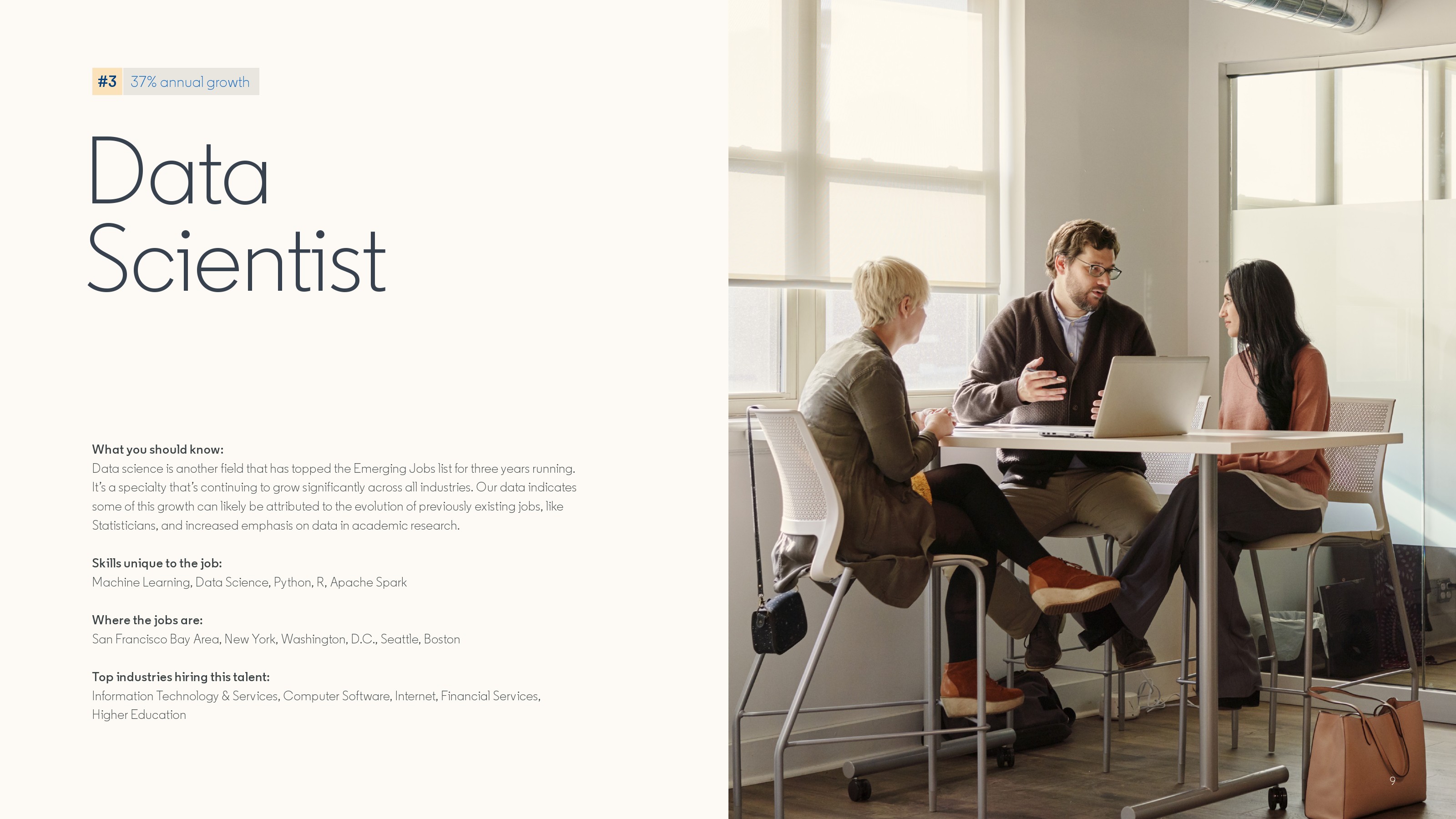 数据科学:正在蓬勃发展并开始取代传统角色。数据科学是一个正在经历巨大规模持续增长的领域,但领英的数据显示,随着保险等一些行业为未来做准备,数据科学家可能正在扩大传统上由统计学家承担的责任。