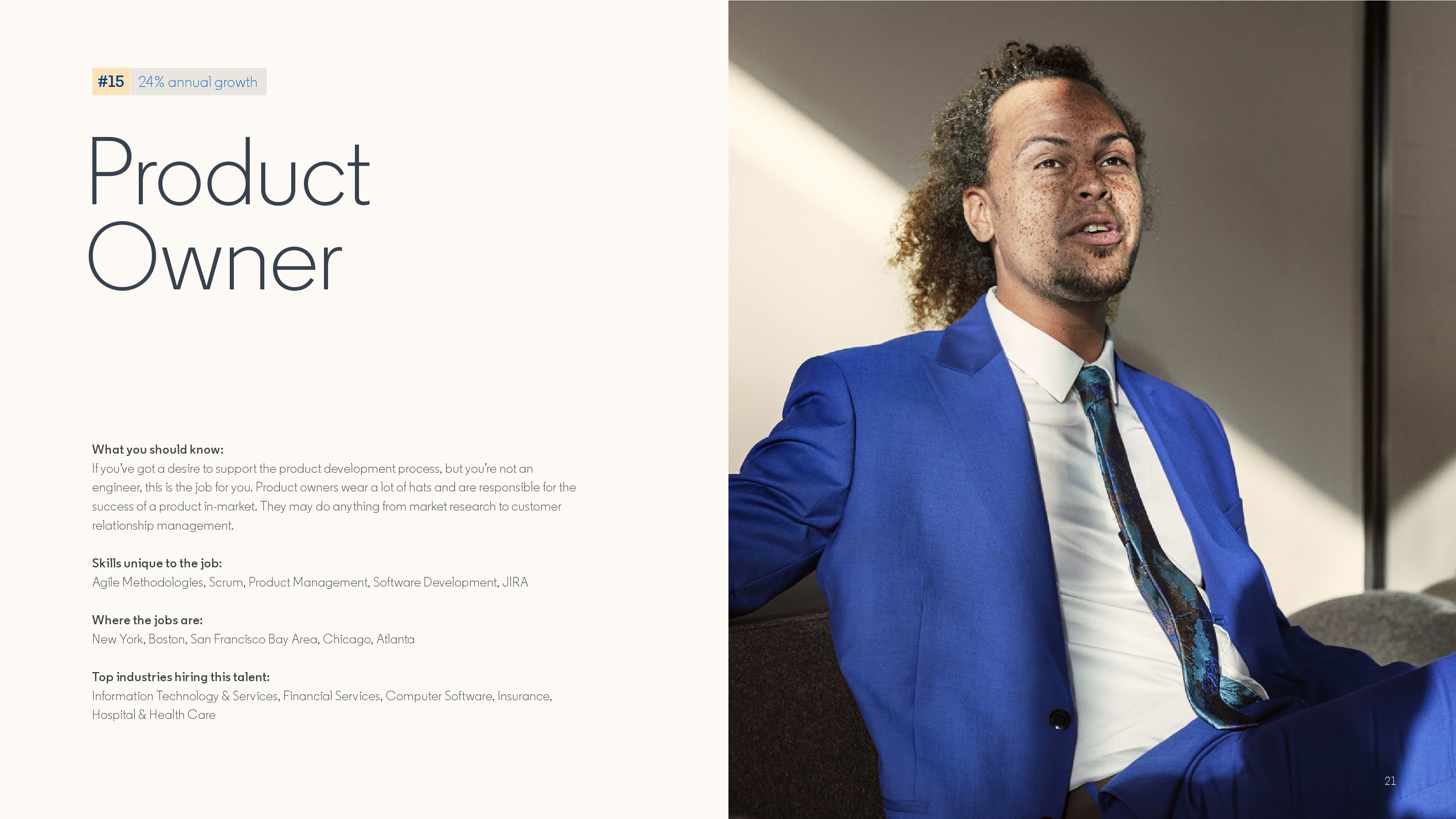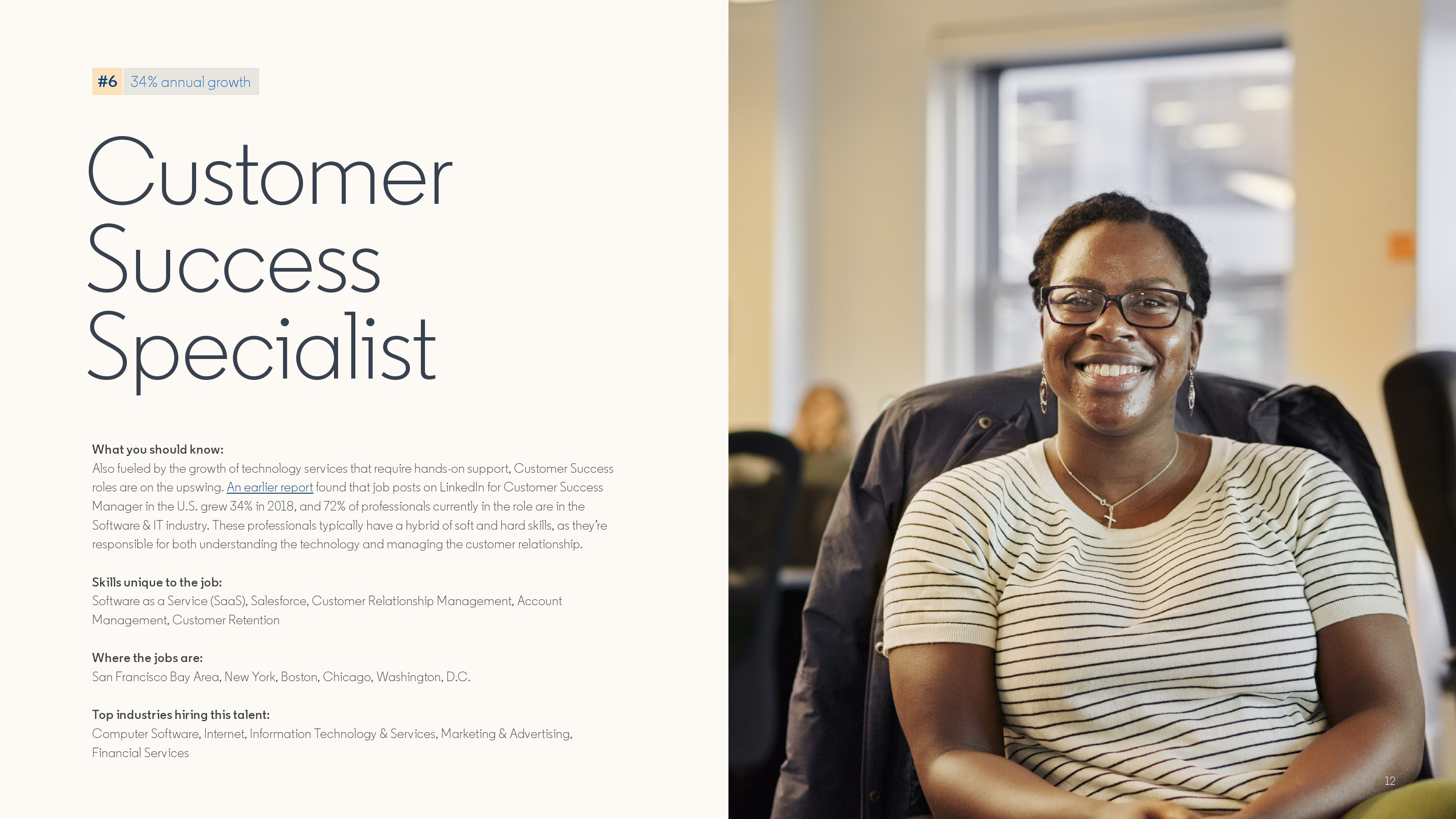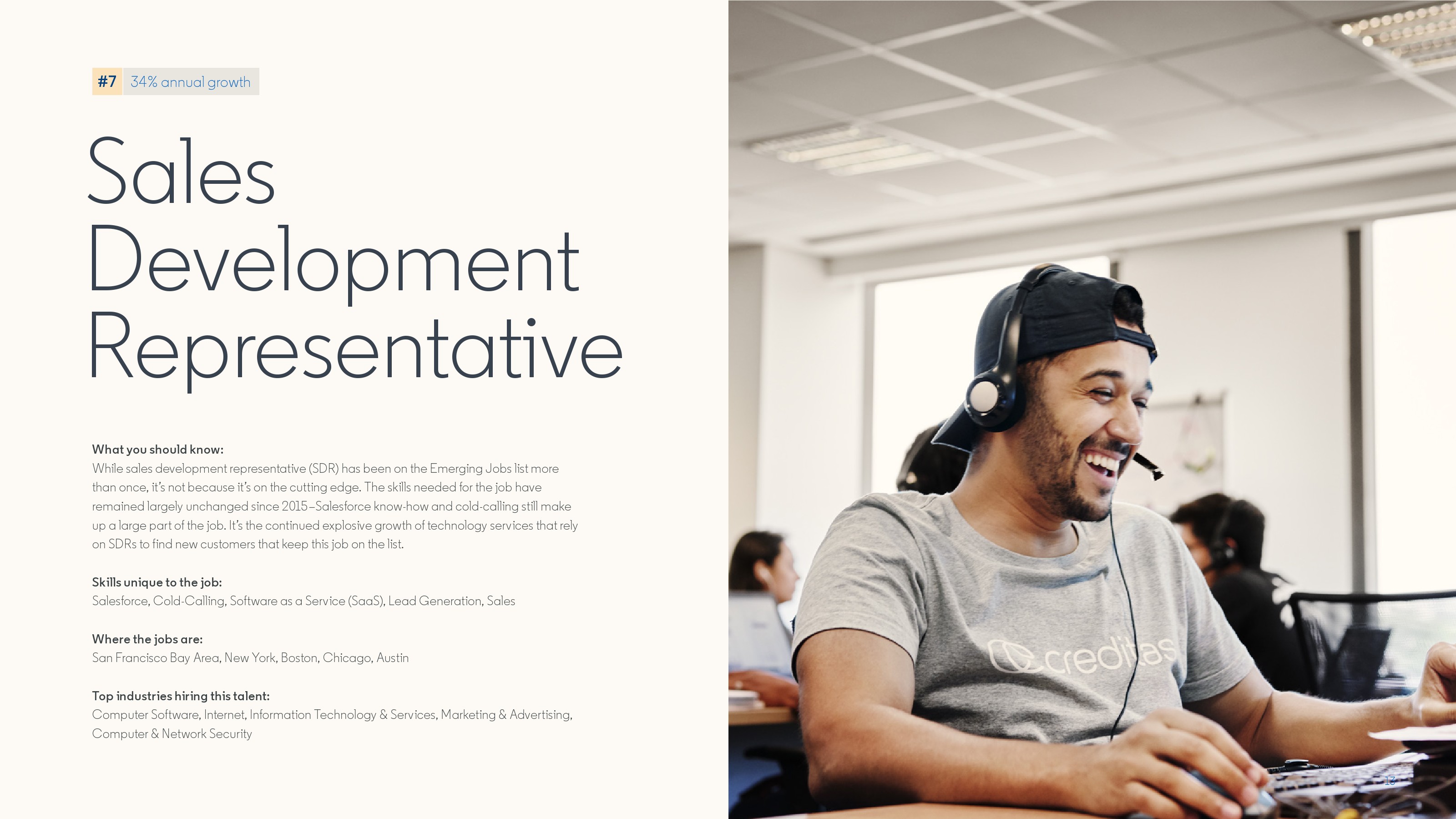科技行业:产品负责人、客户成功专家和销售开发代表在技术行业内需求很高。像软件即服务(SaaS)这样价值2780亿美元的行业的未来将依赖于成功补充新人才的技能。