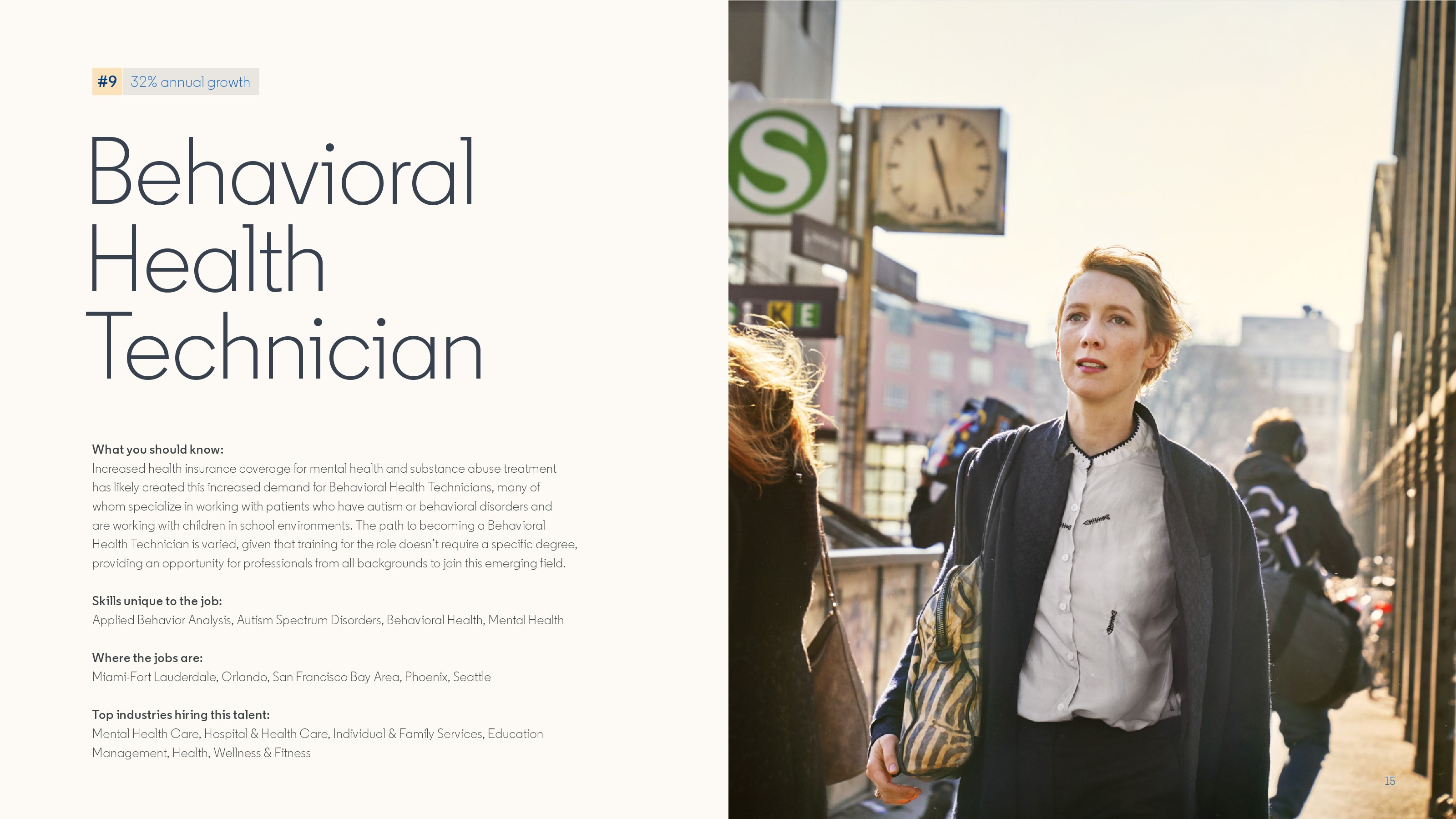 医疗保健:心理健康保险的普及正在推动对行为健康专业人员的需求。自2015年以来,行为健康技术人员的招聘平均每年增长32%。这也是今年榜单上仅有的几个不需要4年学位的工作之一。