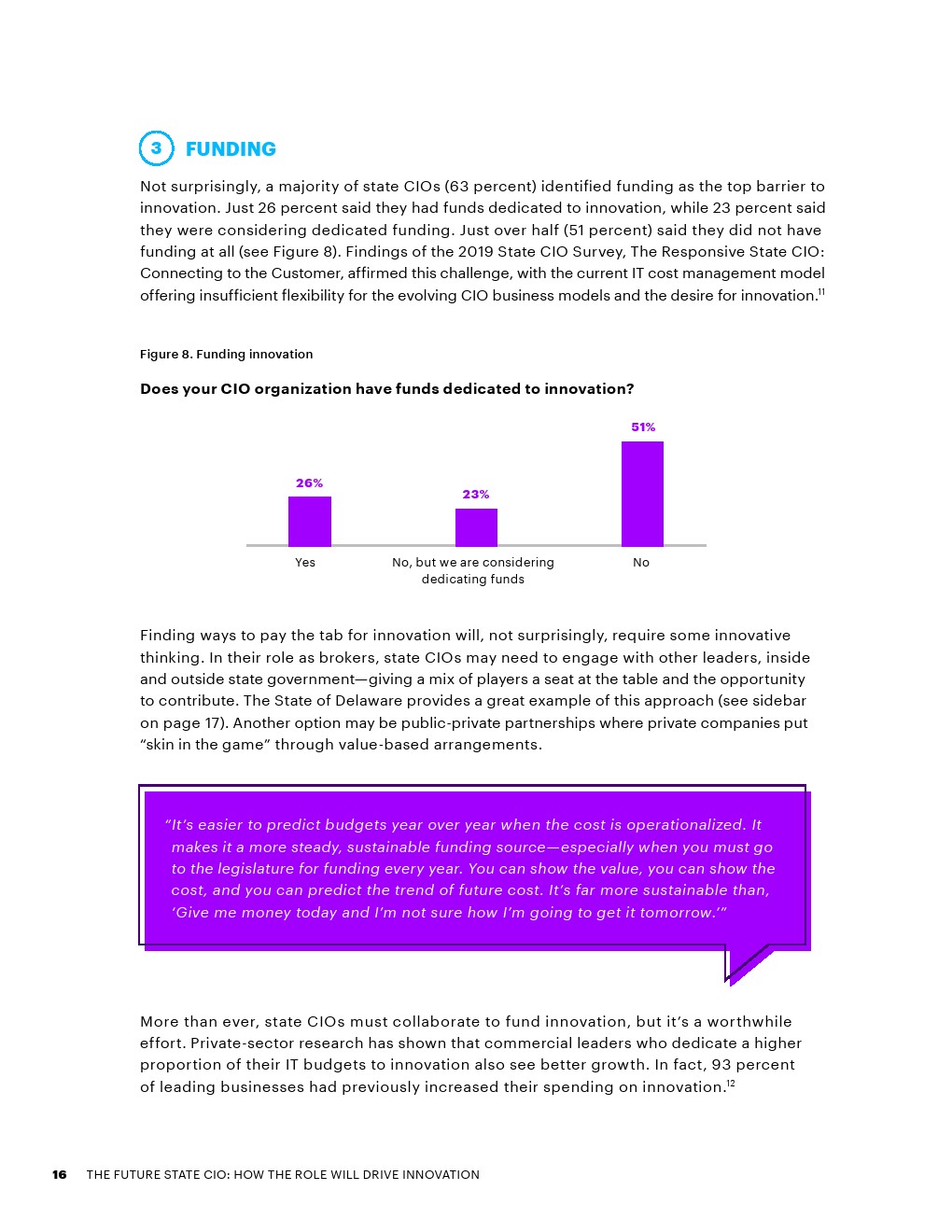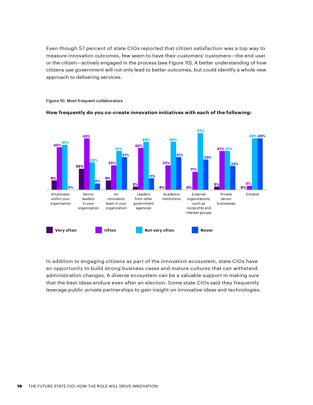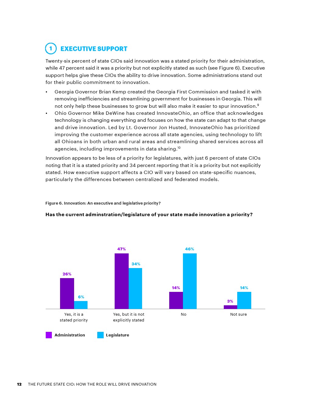 行政部门对创新的支持程度很低:26%的受访者表示,他们的州行政领导已经将创新作为一项既定的优先事项,6%的受访者表示州立法机构已经这样做了。