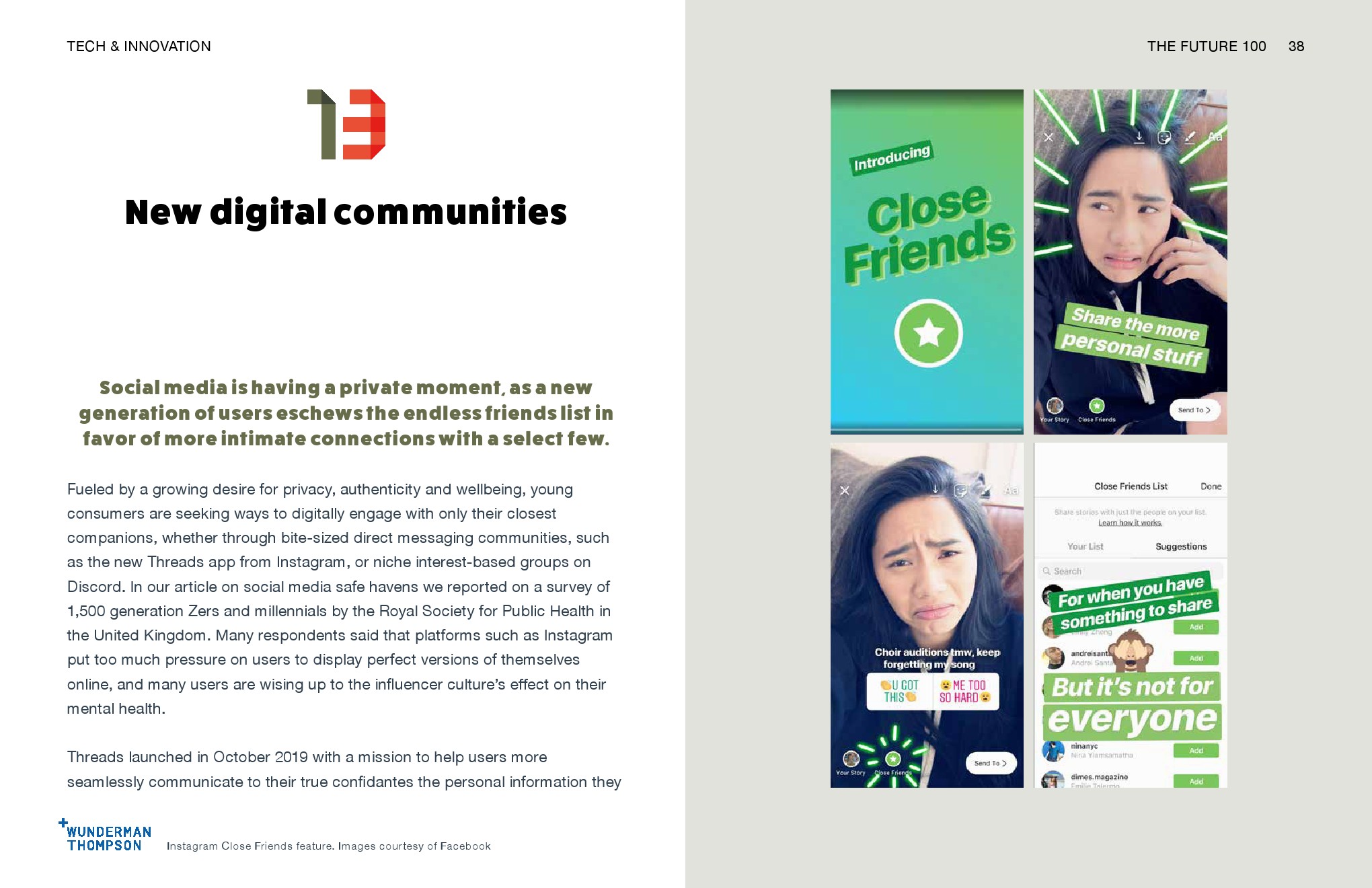 公司还注意到了人类互联互通对健康的积极影响,通过产品和服务来建立有意义的联系,以解决持续人口和寿命延长的问题。孤独感正在作为一个社会和公共卫生问题,人们正在设想在特大城市建立新的社区来促进社会福祉,甚至社交媒体也开始促进有意义的联系,而不是多重联系。