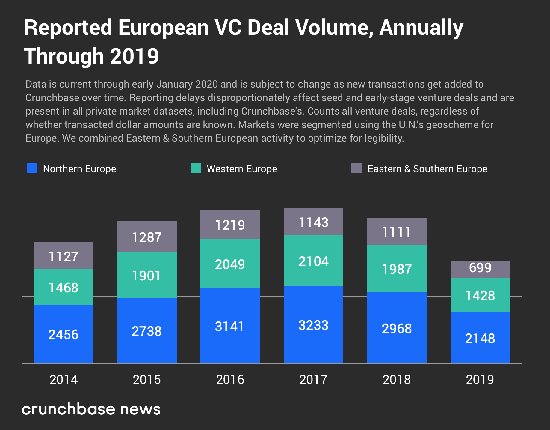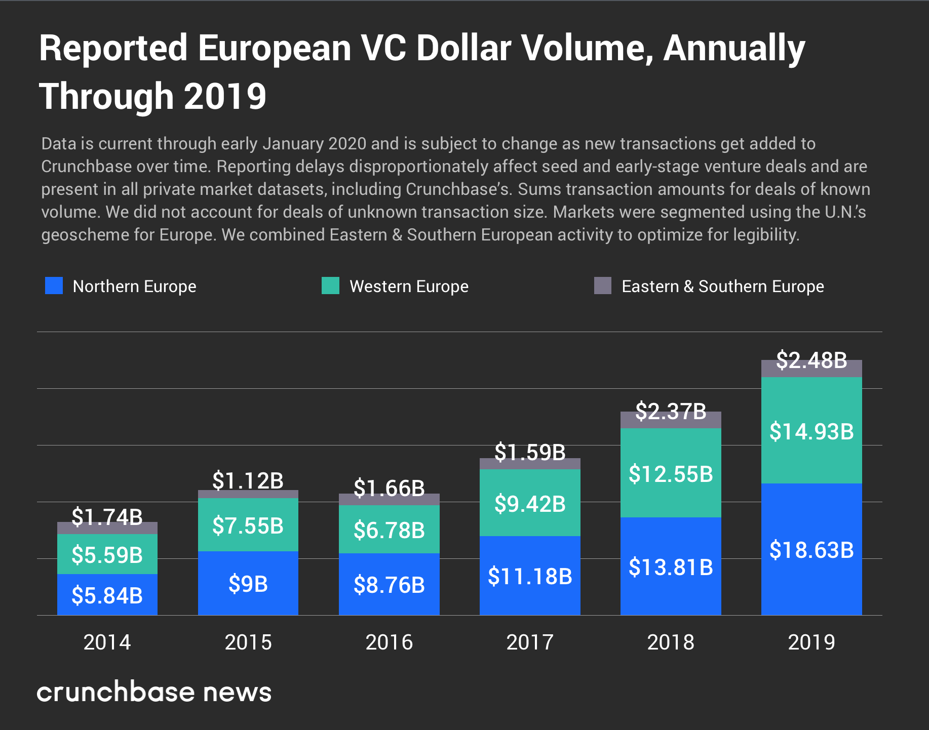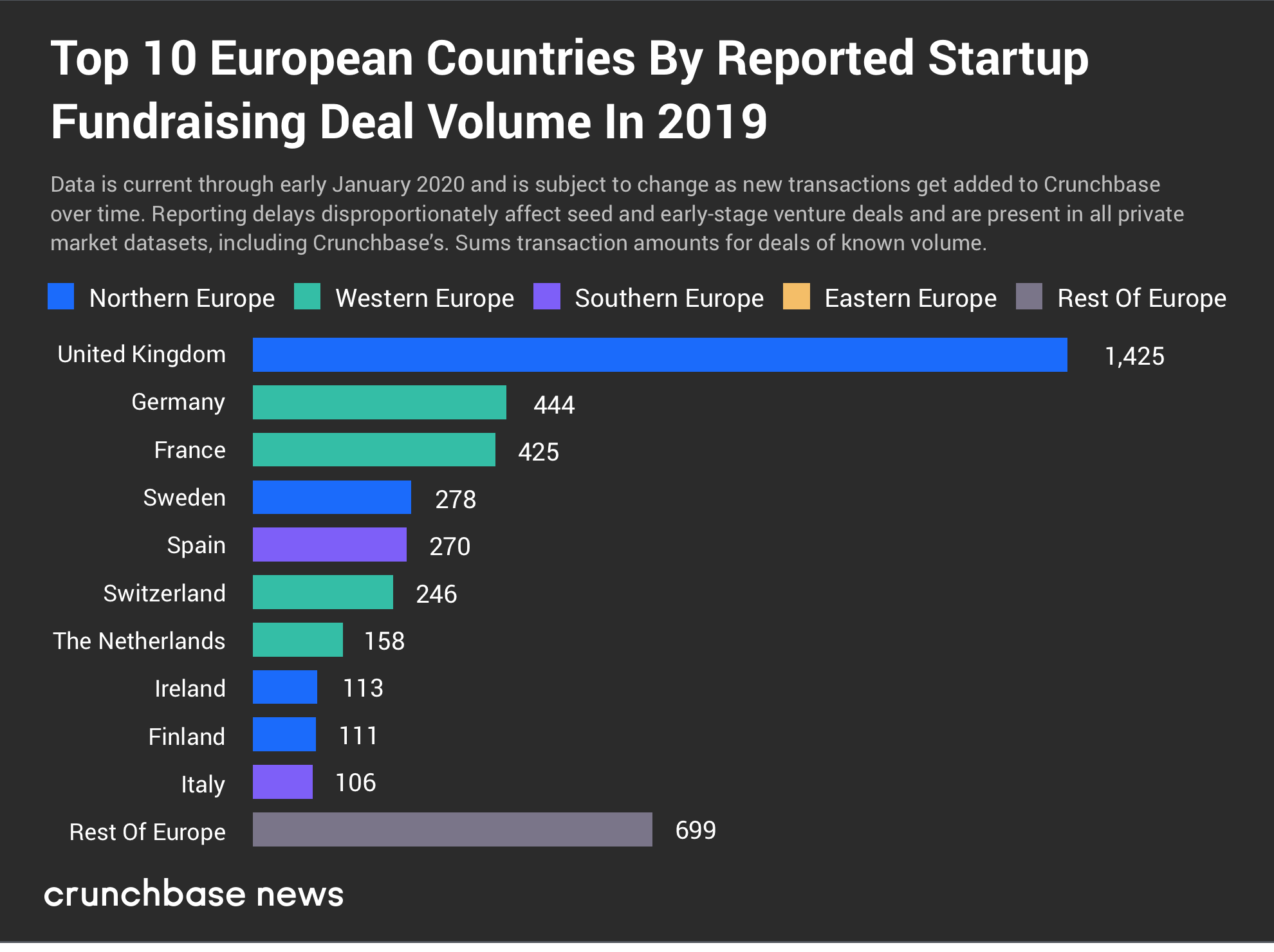 北欧吸引了186.3亿美元。这可以归功于英国,因为它在过去一年的交易量和交易额上都处于该地区的领先地位。瑞典也是北欧的一部分,是2019年欧洲第四大市场(投资额)。