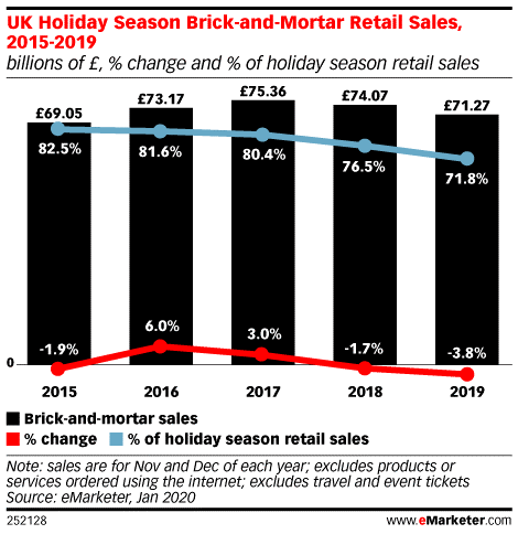 电子商务的成功是以实体零售为代价的。在2019年假日购物季期间,实体零售额下降了3.8%,降至712.7亿英镑(950.2亿美元)。这是自2010年以来英国零售支出下降最多的一年。