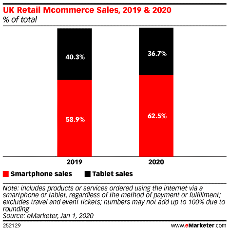 电子商务在英国零售额中所占的比重越来越高,今年将增长8.9%,达到1142.6亿英镑(1523.3亿美元)。英国今年将经历电子商务的另一个里程碑,因为移动电子商务将首次为在线销售贡献一半。2020年,移动电子商务将增长15.3%,达到580.5亿英镑(773.8亿美元)。毫不奇怪,智能手机将继续成为移动电子商务的主导设备,占今年移动电子商务销售额的62.5%,而平板电脑为36.7%。