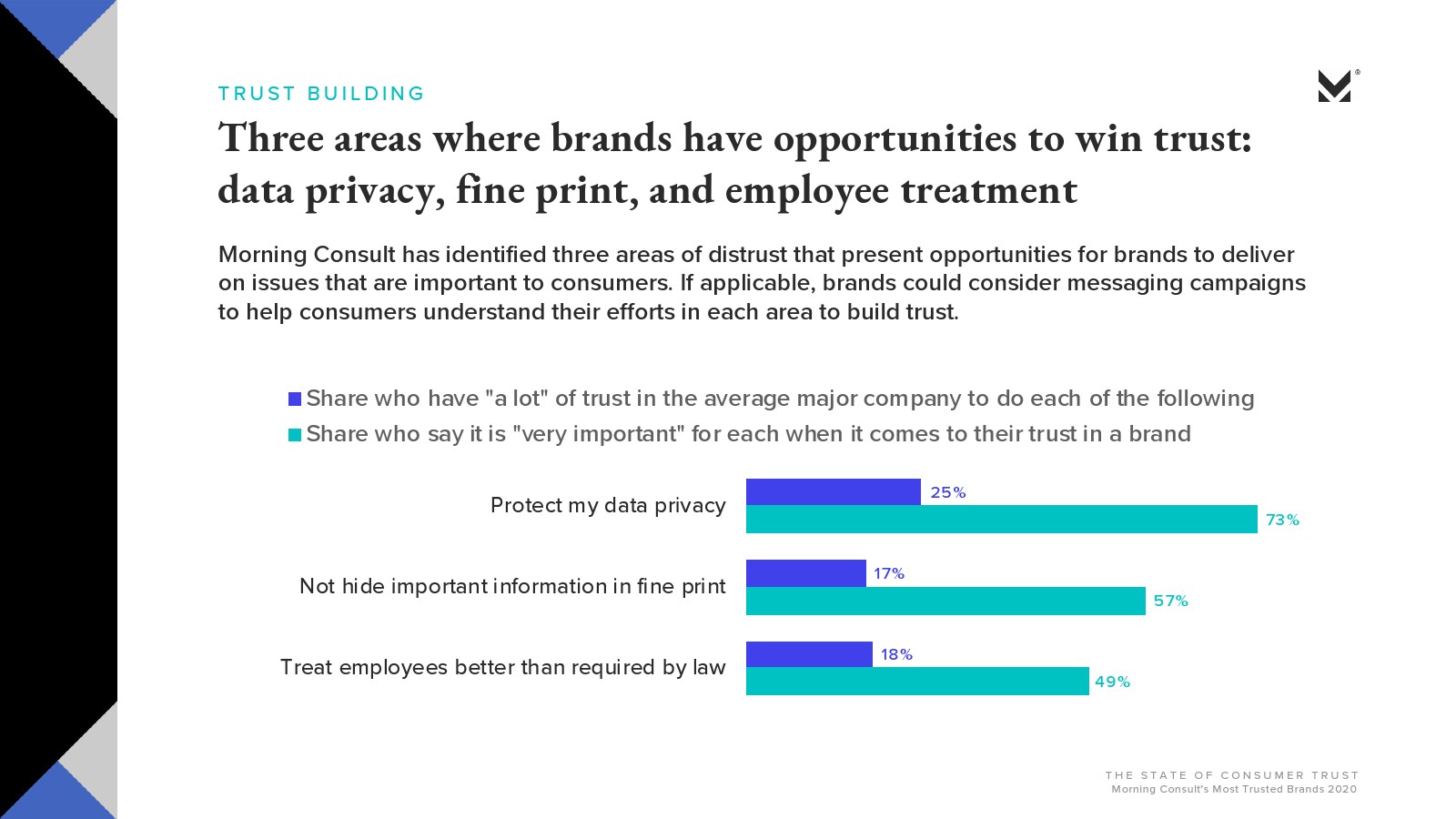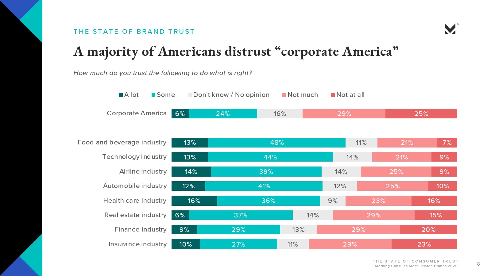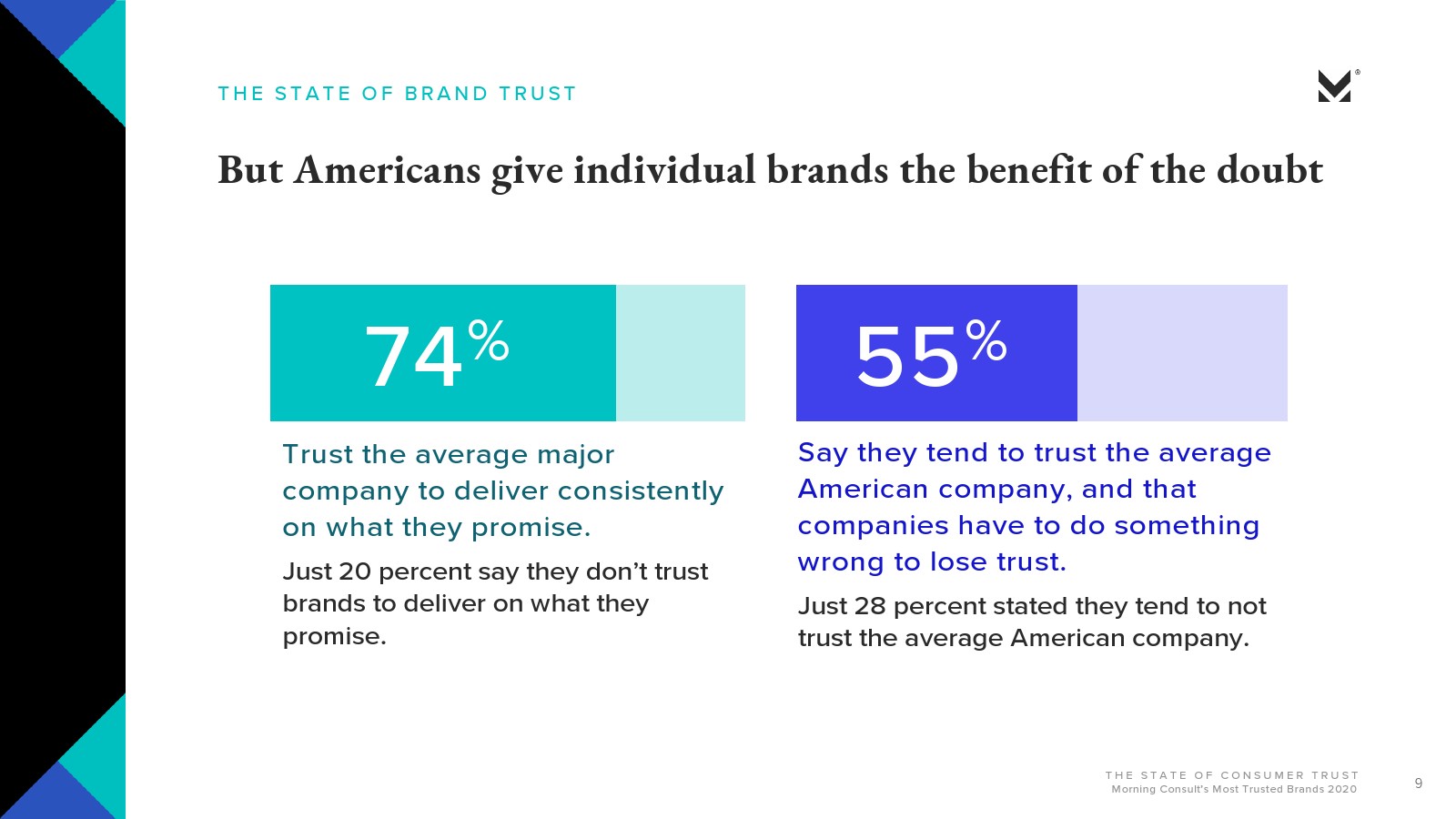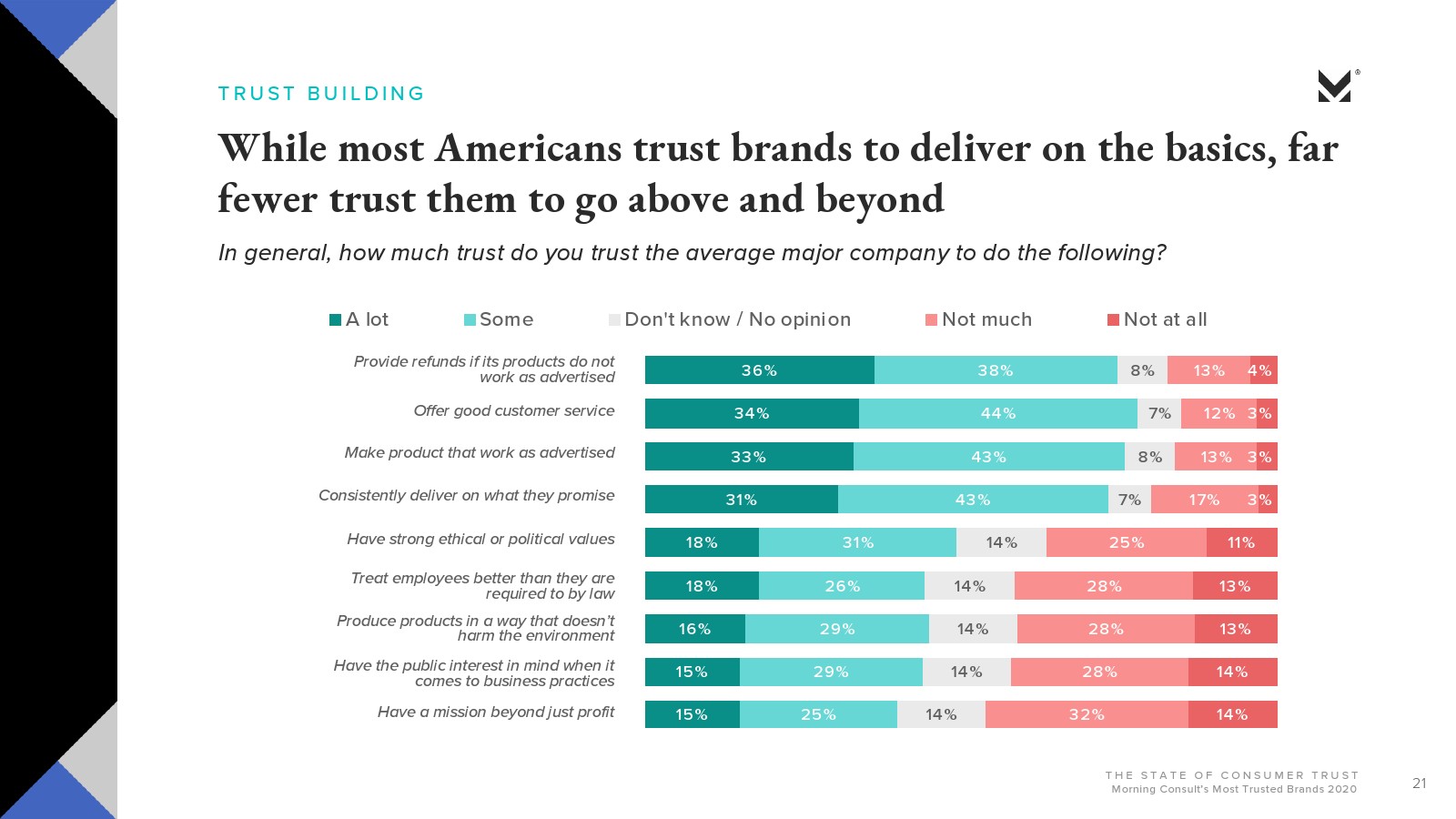 Morning Consult发布了新报告“消费者的信任”。大多数美国人对美国公司会做正确的事情并不抱有太大的信心(29%)或完全不信任(25%)。约有3/4的受访者(74%)信任品牌能够始终如一地兑现其承诺;超过一半的人表示,品牌做错事情就会失去信任。