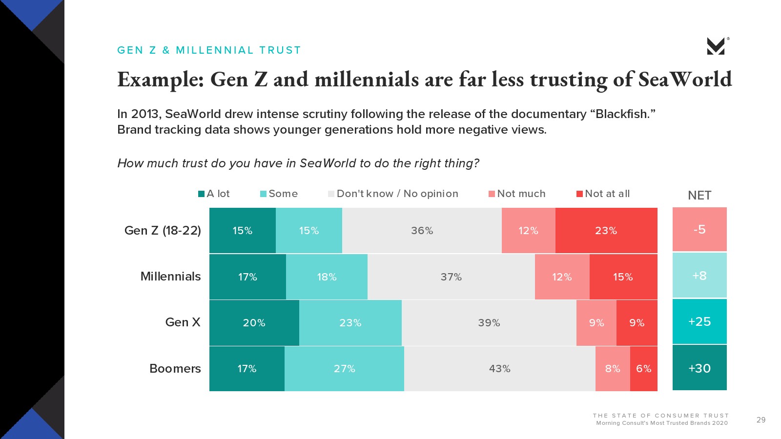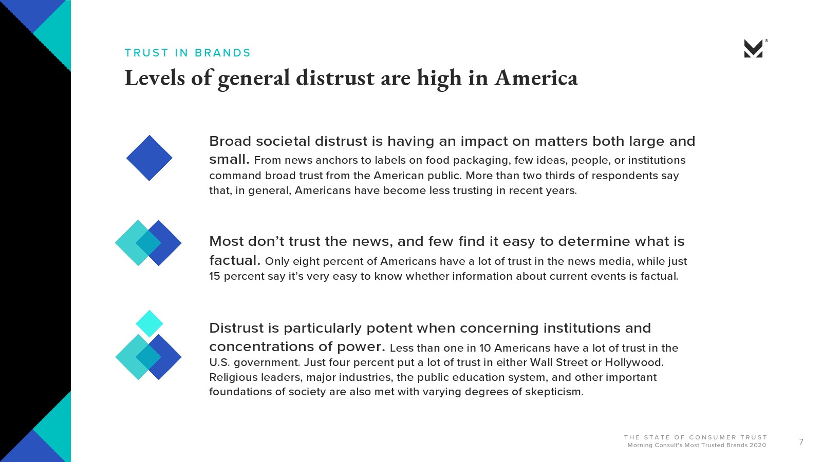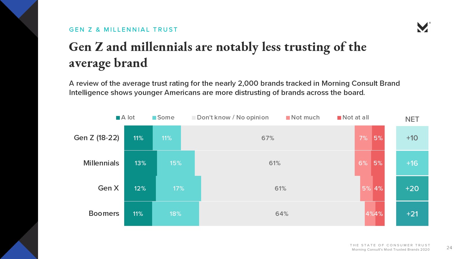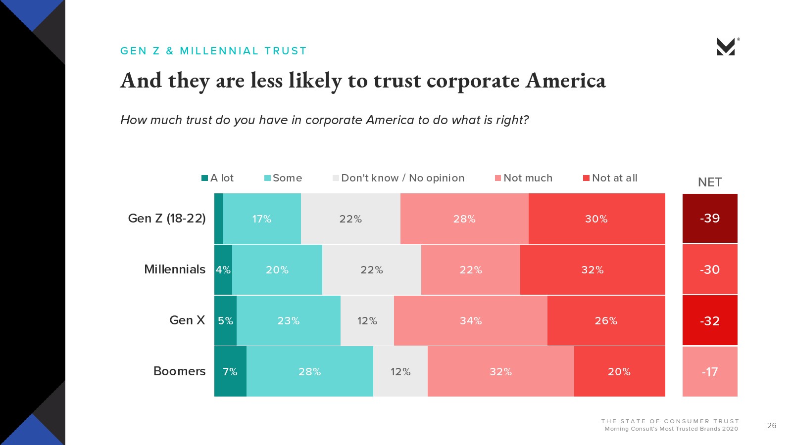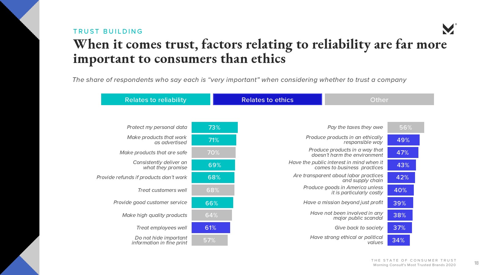 Morning Consult发布了新报告“消费者的信任”。大多数美国人对美国公司会做正确的事情并不抱有太大的信心(29%)或完全不信任(25%)。约有3/4的受访者(74%)信任品牌能够始终如一地兑现其承诺;超过一半的人表示,品牌做错事情就会失去信任。