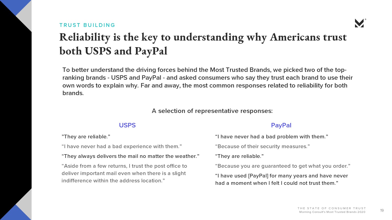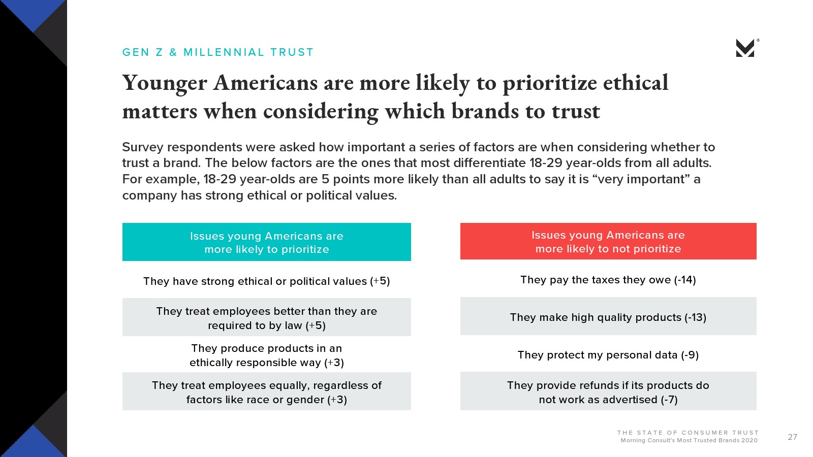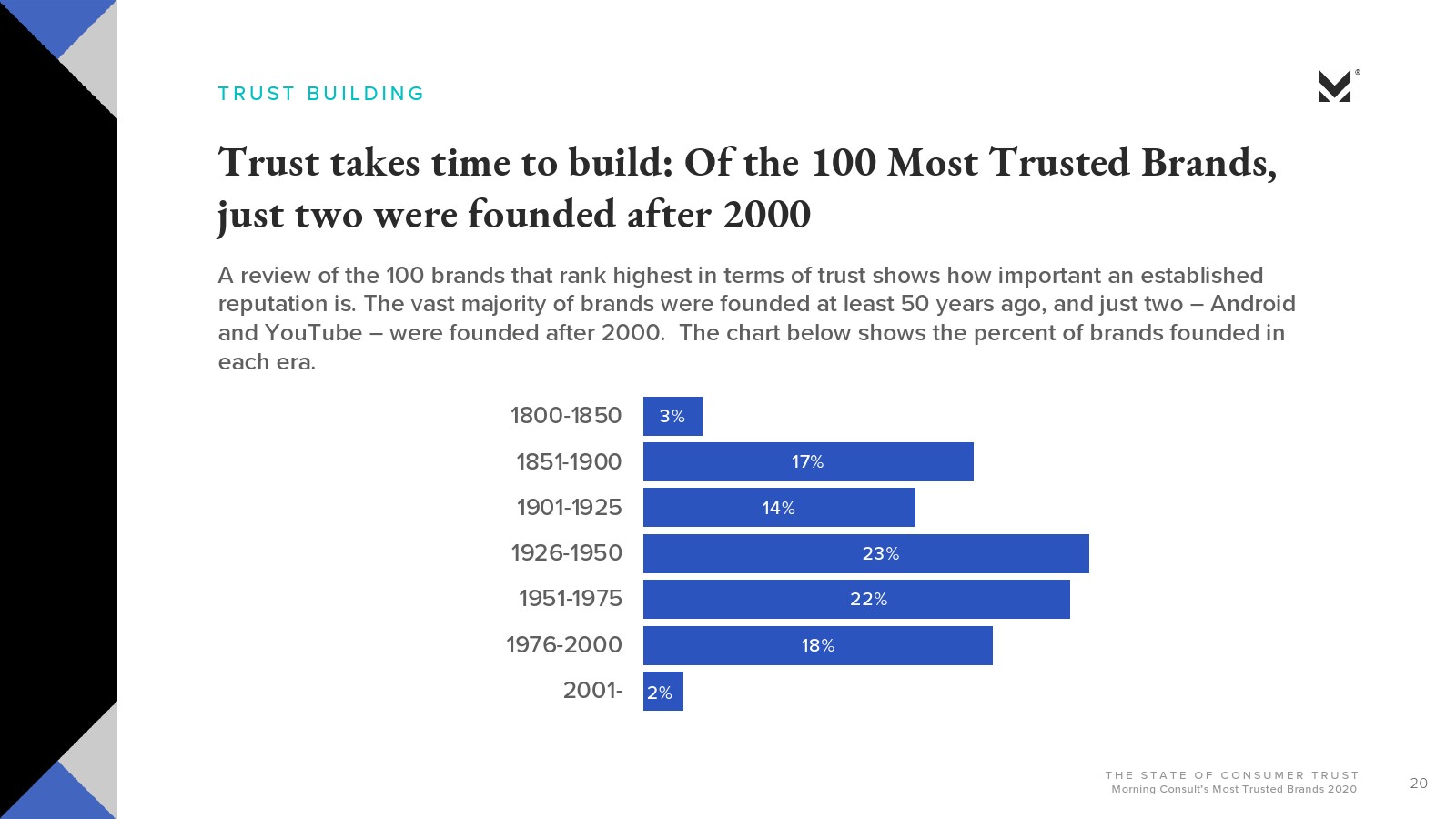 长寿是影响信任度的另一个因素。大多数美国消费者表示,他们更有可能信任已经存在很长时间的品牌。Morning Consult的信任排行榜100强中只有两个是在2000年之后成立的。