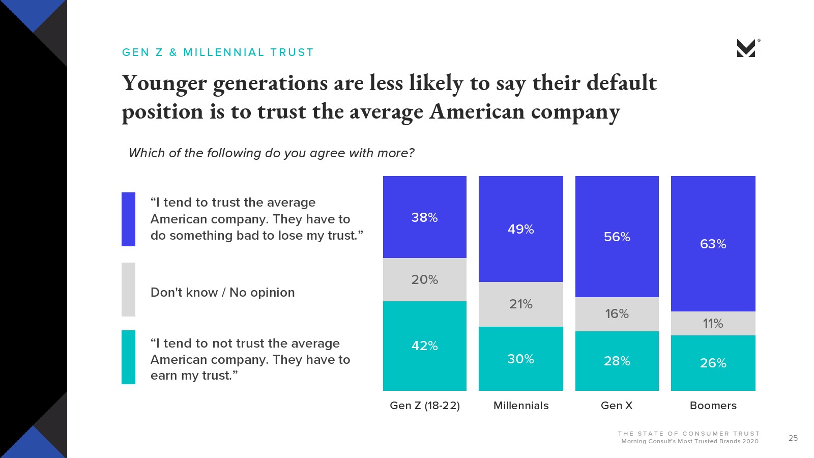 Z世代(18至22岁)成年人中有超过2/5(42%)不信任美国公司。千禧一代(30%)、X世代(28%)和婴儿潮一代(26%)也有可能不信任美国公司,但是,大多数婴儿潮一代(63%)持相反观点,即他们倾向于信任美国公司,直到他们做了让人失去信任的坏事。
