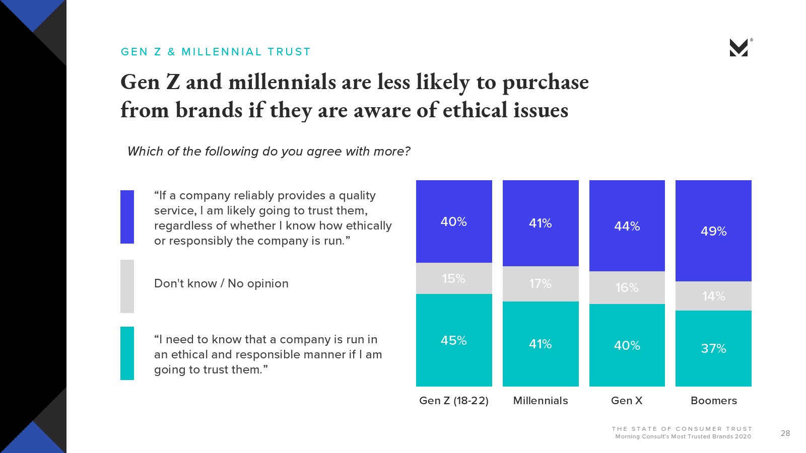 20%的Z世代和24%的千禧一代对美国公司做正确的事有一定的信心。这两代人倾向于考虑道德问题,例如:公司的道德或政治价值观。如果其对待员工的待遇优于法律要求,并且无论其种族或性别,他们更有可能信任这样的企业。实际上,将近一半的Z世代受访者(45%)表示,如果他们要信任一家公司,他们需要知道这家公司以道德和负责任的方式运营。