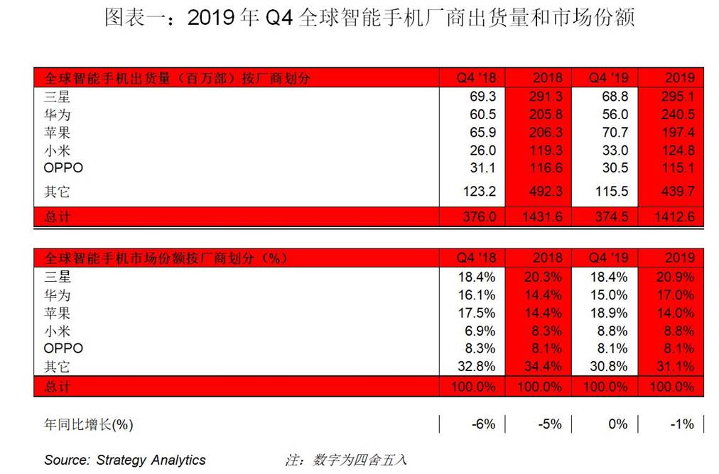 Strategy Analytics最新发布的研究报告指出,2019年Q4全球智能手机出货量为3.75亿,与去年同期持稳。苹果以19%的全球智能手机市场份额位居第一,三星名列第二,而华为则以15%的市场份额跌至第三。 2019年全年智能手机出货量总计14亿部。