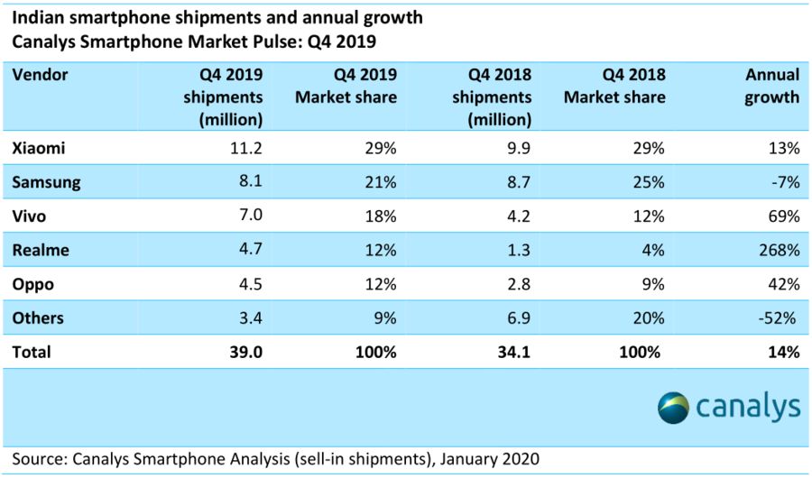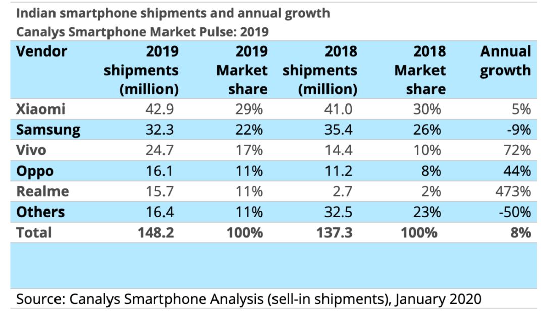 市场调研机构Canalys日前发布印度手机市场报告,报告显示,2019年第四季度印度智能手机市场增长14%,总出货量为3,900万台。印度智能手机全年出货量增长8%,达到1.48亿部。其中小米市场占有率达到29%,出货量1120万台,增长13%。同时小米连续10个季度雄踞印度市场榜首。全年出货量达到4290万部。