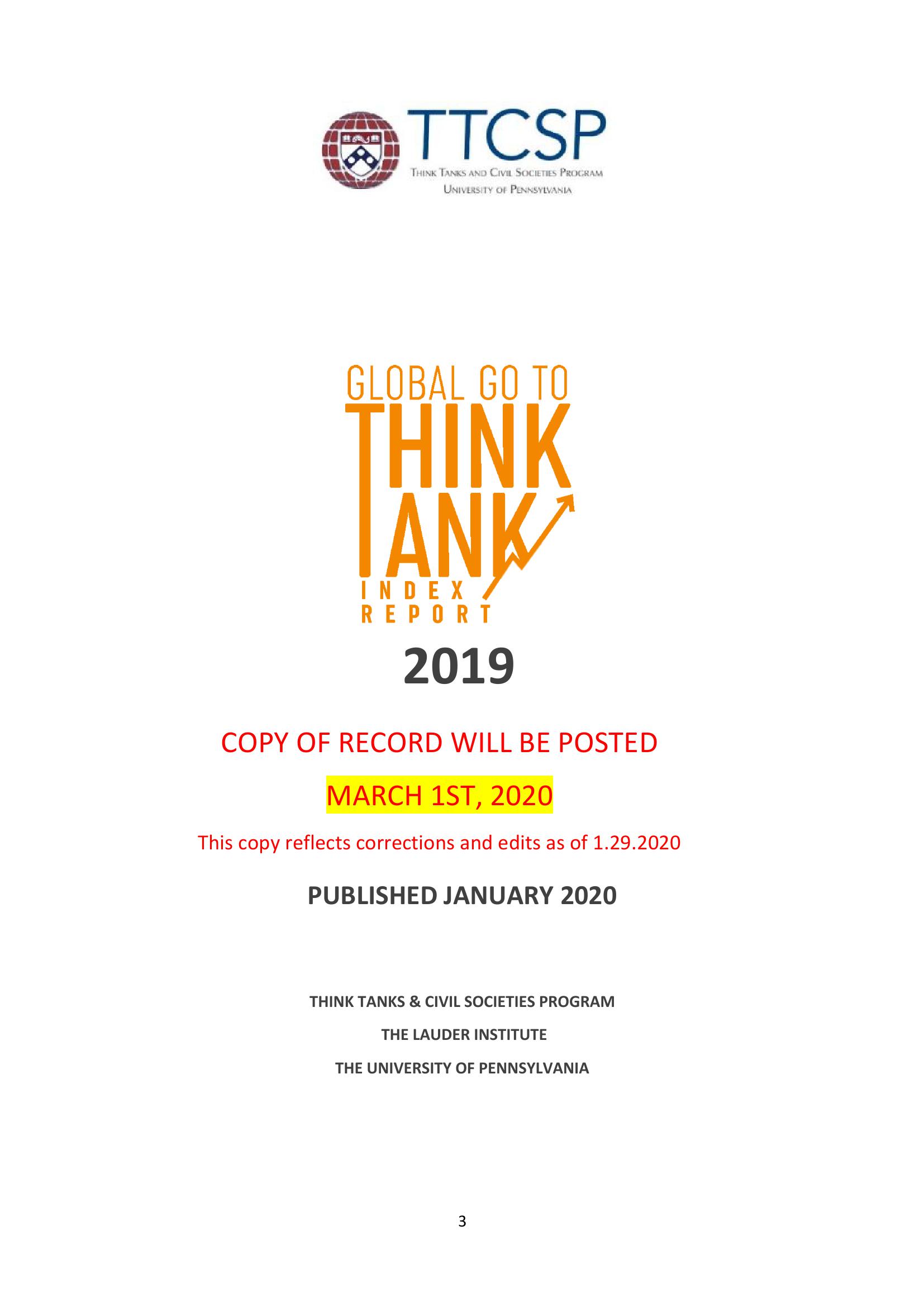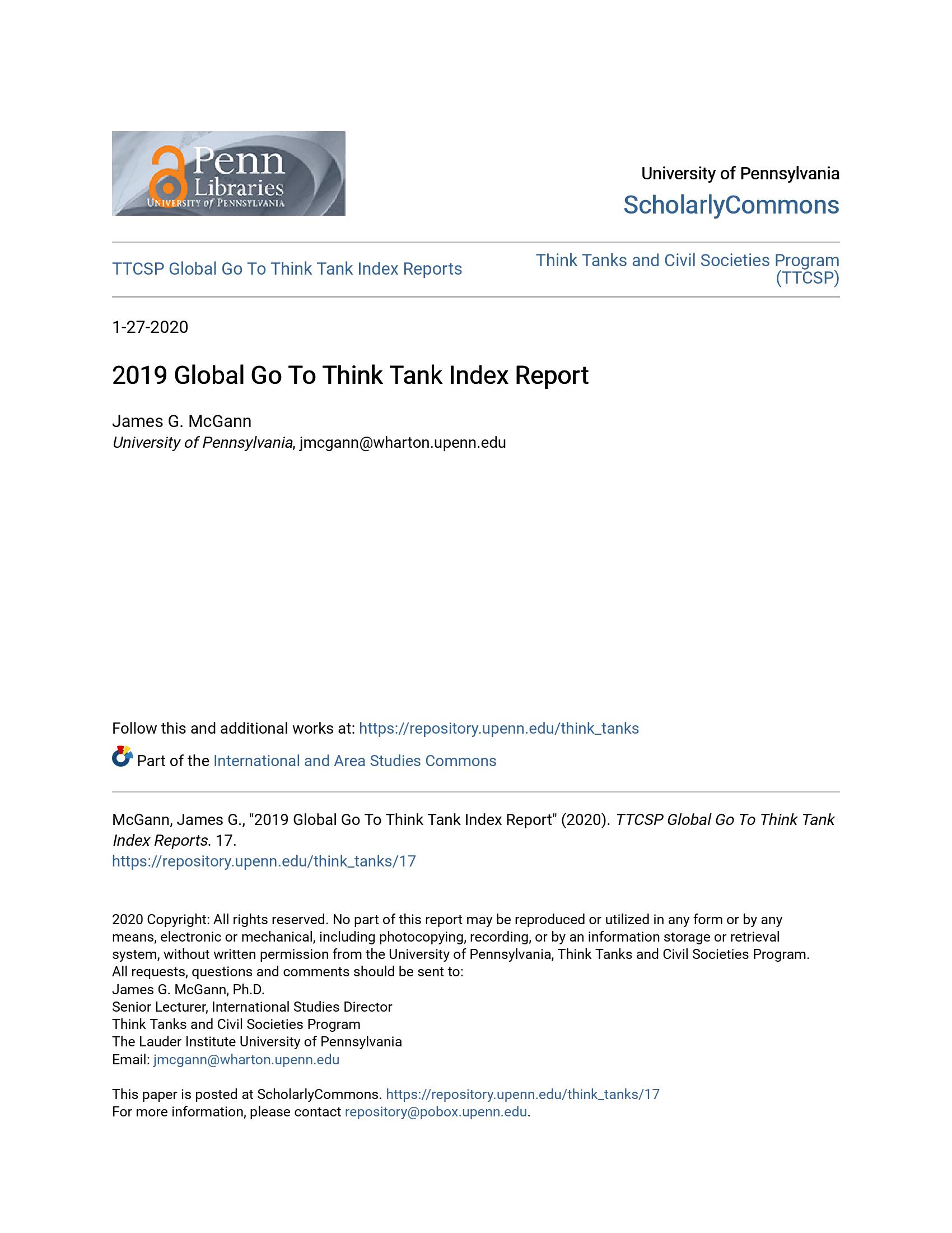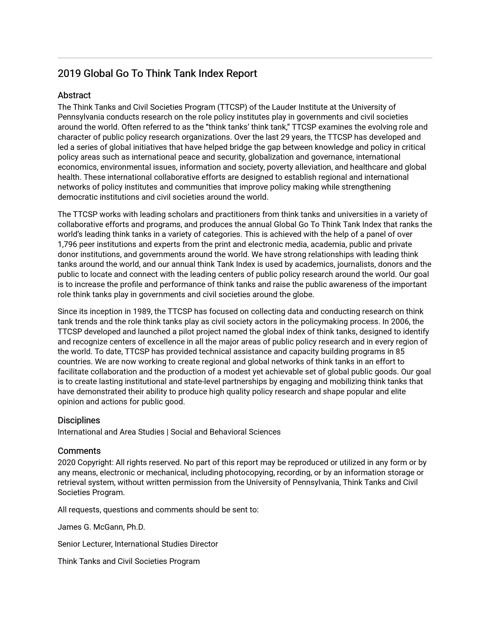 由美国宾夕法尼亚大学“智库研究项目”(TTCSP)研究编写的《全球智库报告2019》在纽约、华盛顿、伦敦、巴黎等全球近150个城市发布。