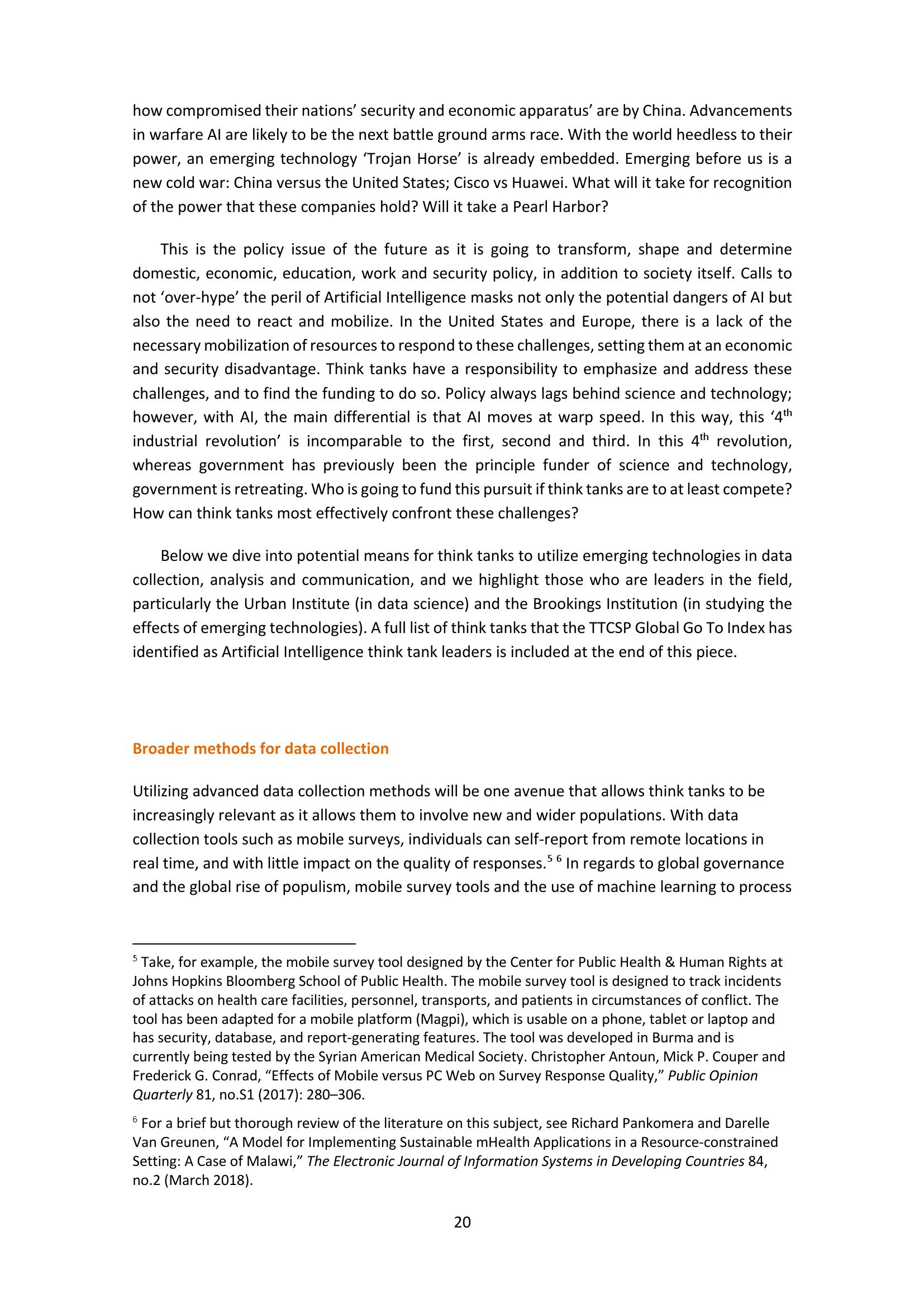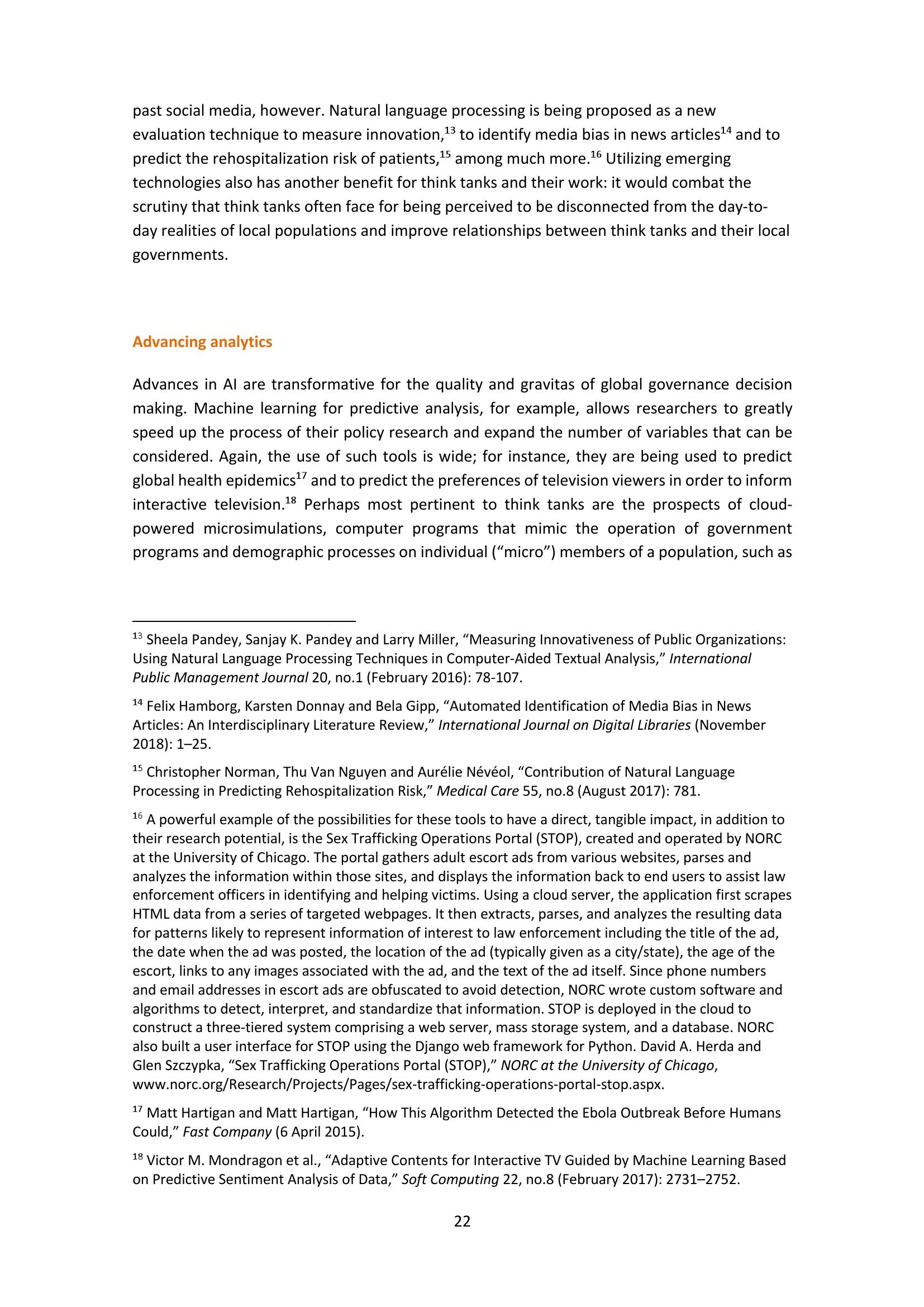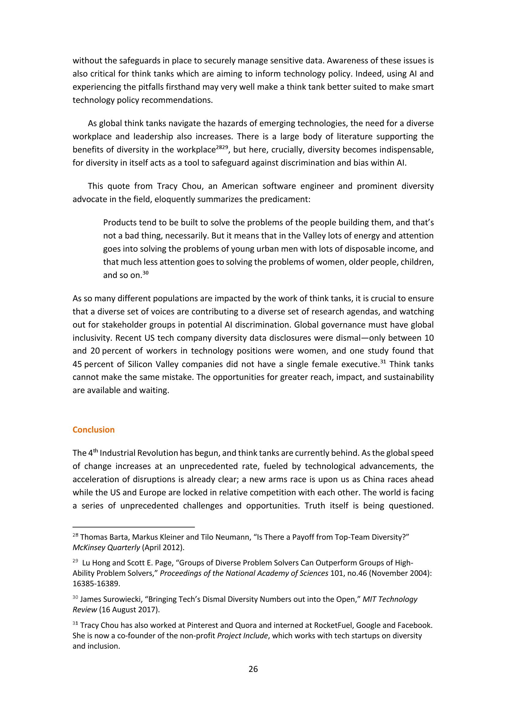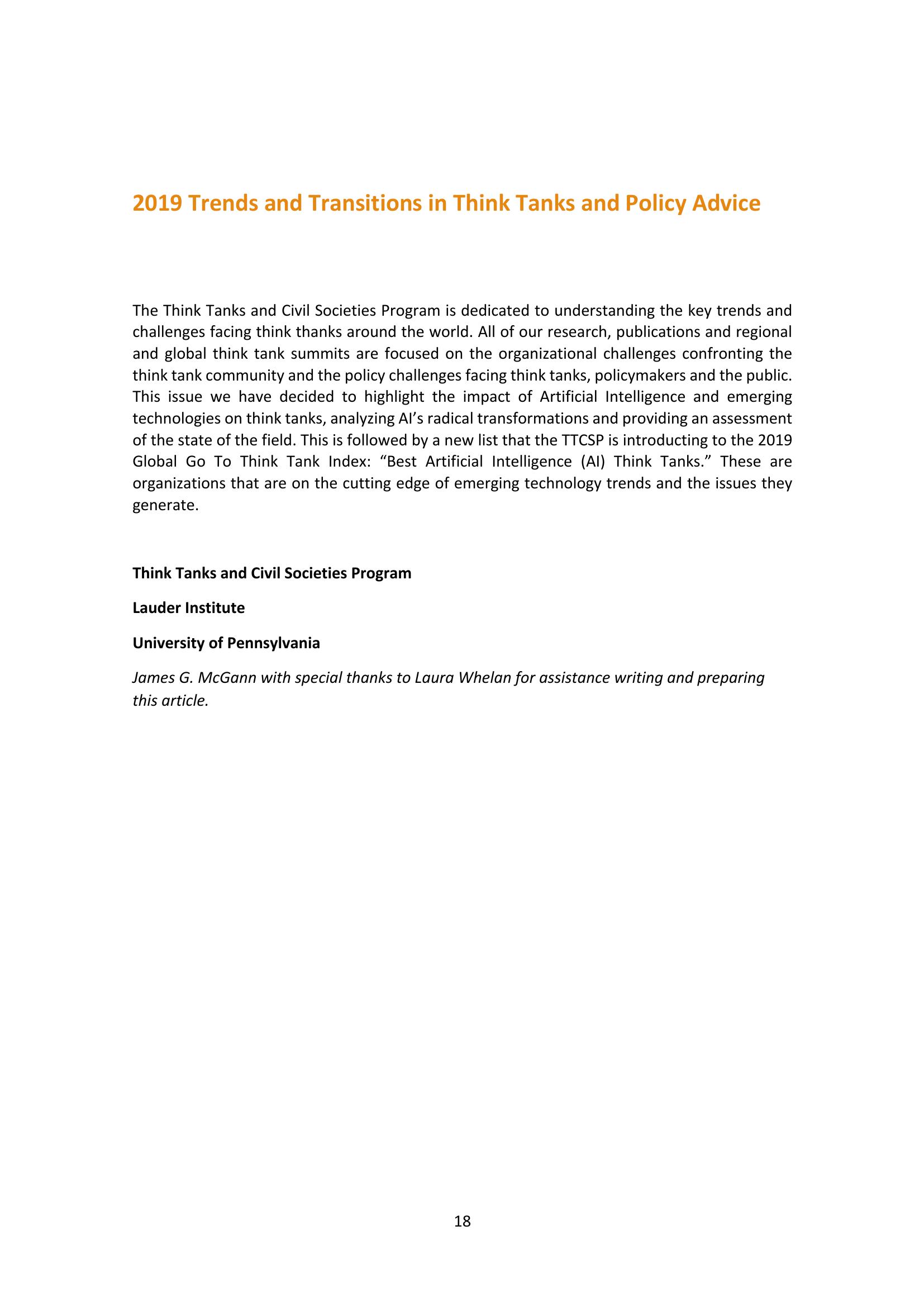 因此,《报告》建议:智库必须经历一场商业模式的演变,利用好智库的研究成果;智库在利用大数据、机器学习以及其他新兴技术工具进行预测分析的同时必须要兼顾其技术能力、多样性以及偏见意识等方面;要注意存在潜在的“AI歧视 ”下的利益相关群体,保证更多声音被听到;人工智能没有国界,因此智库间需要合作。