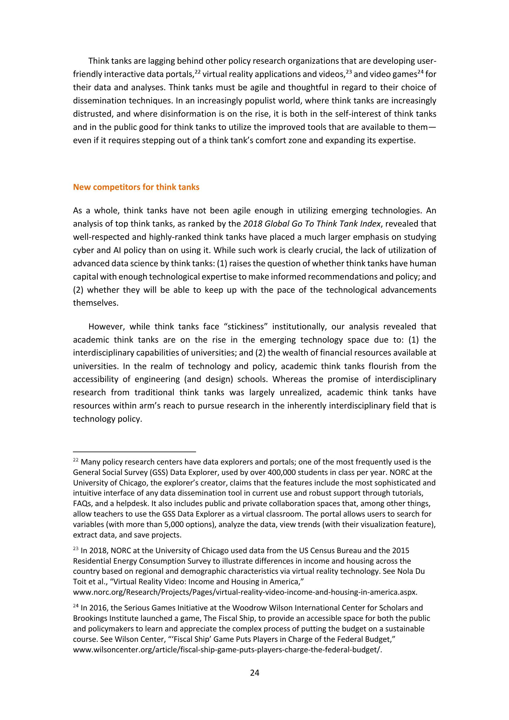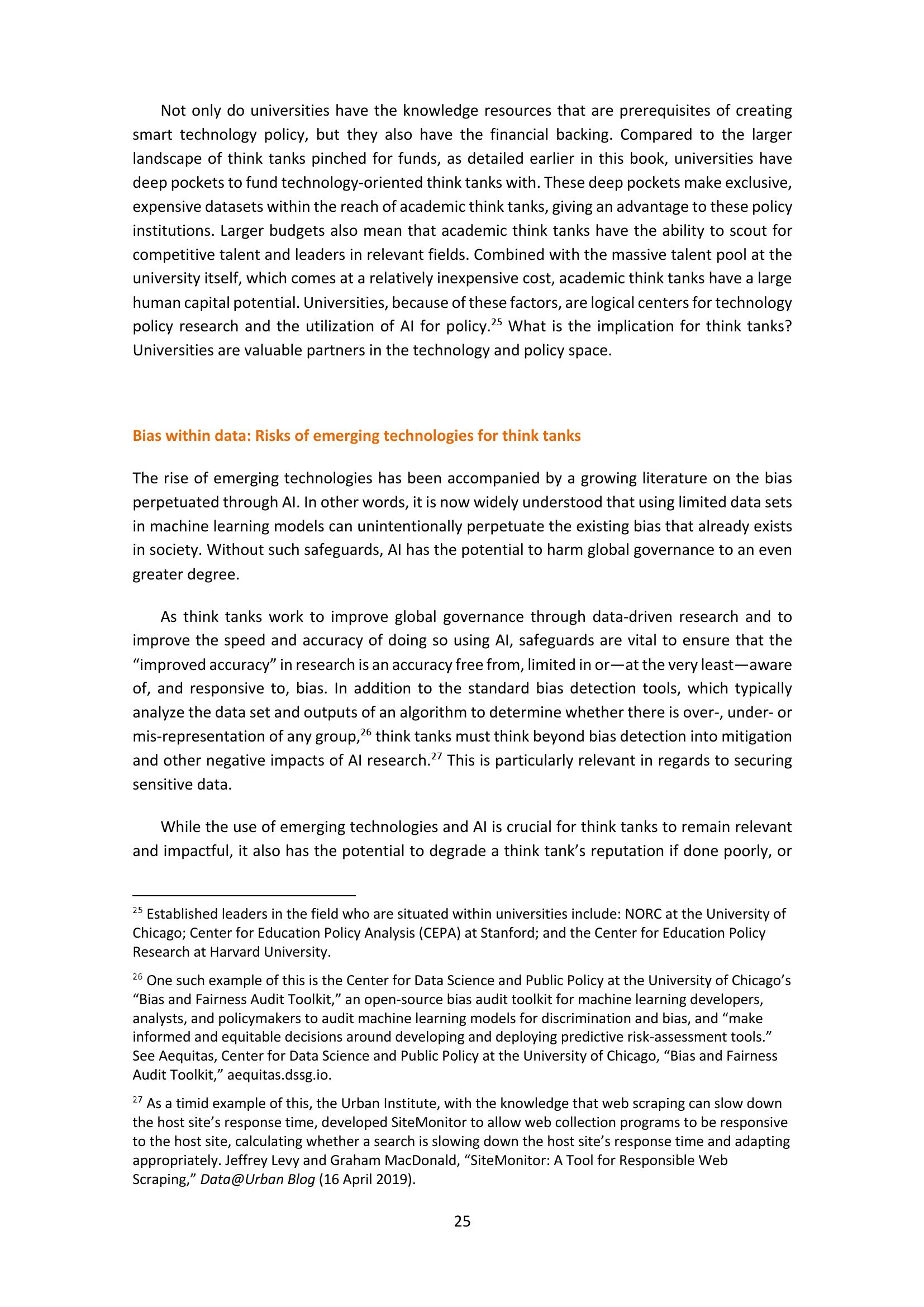 新兴技术既可能有利于革新和增强世界范围的研究工作,亦可能会边缘化智库的作用,智库面临新兴科技带来的挑战或风险有:AI造成的偏见问题会使智库通过数据驱动型研究来改善全球治理的方式受阻;敏感数据处理不当会使智库名誉受损;新兴技术对工作场所和领导能力多样化的需求在增加等。