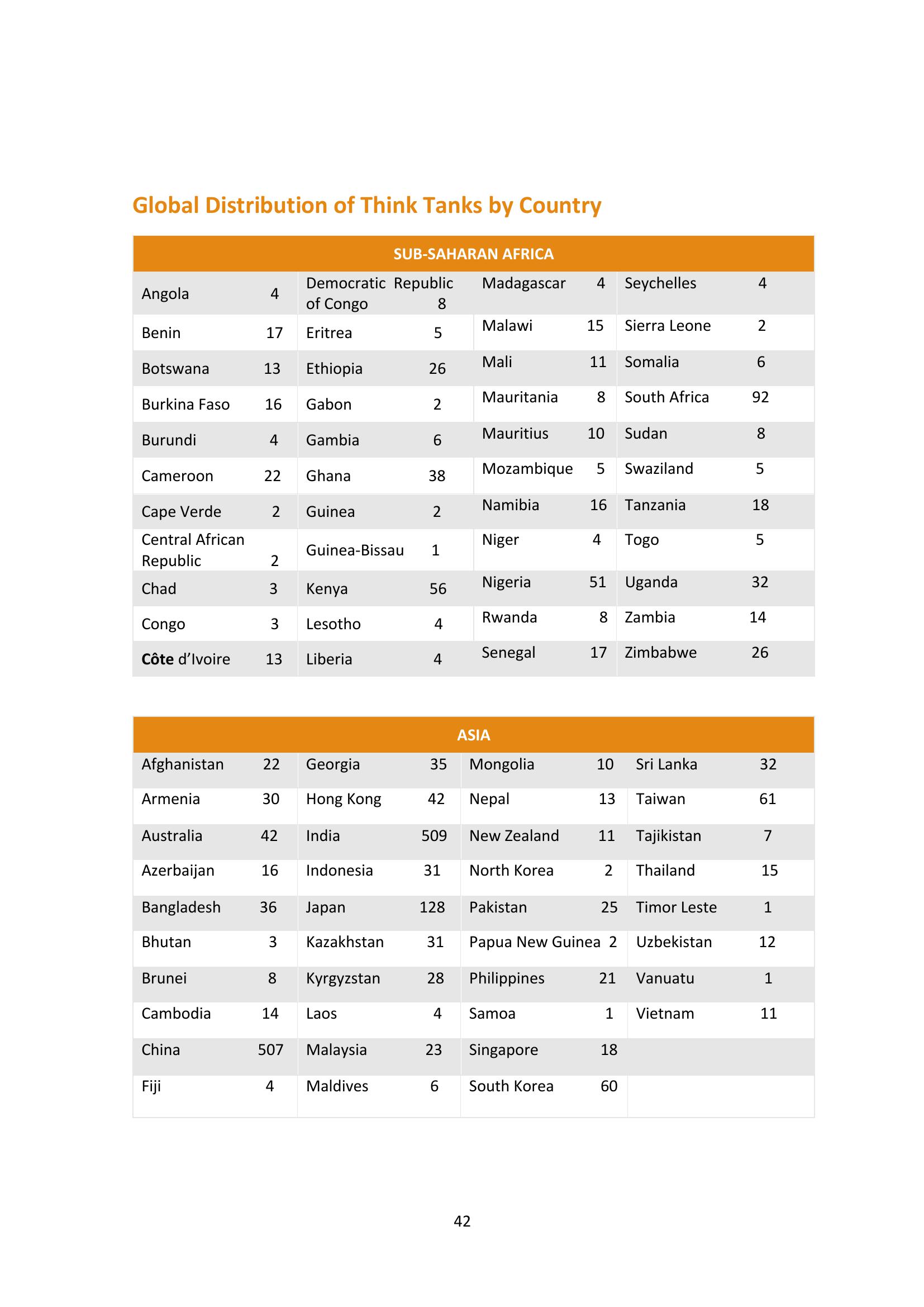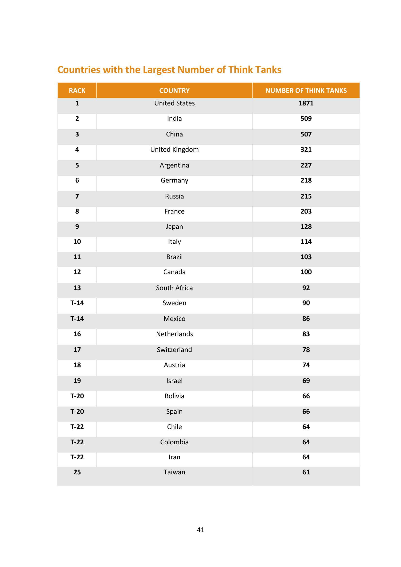 《报告》显示,全球智库整体增长,欧洲和北美仍为全球智库最多聚集地,TTCSP全球智库数据库中列出的所有8248家智库中,美国仍以1871家的数量遥遥领先,是全球拥有智库机构最多的国家。印度智库数量为509家,中国有507家,位居第三。中国多家智库入选全球顶级智库分类排名,中国智库国际影响力逐步提升,在 “亚洲大国(中国、印度、日本、韩国)智库百强榜单”中,共有27家中国智库上榜。