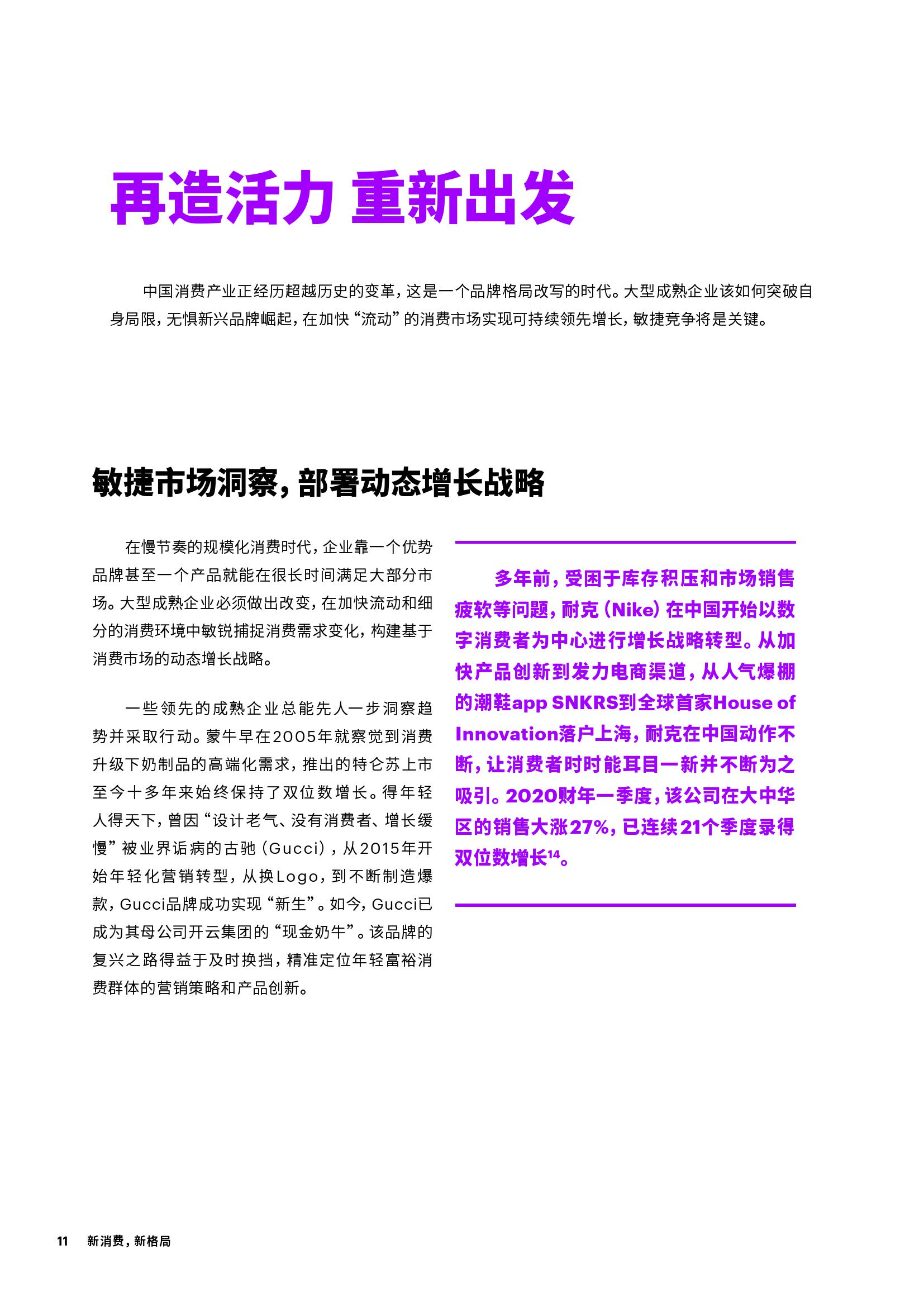在慢节奏的规模化消费时代,企业靠某一个优势品牌甚至某一个产品就能在很长时间占据大部分市场和消费者心智。但为了变快变活,大型成熟企业必须在流动和细分的消费环境中敏锐捕捉消费需求变化,制定基于新消费趋势的动态增长战略。埃森哲认为,新消费趋势包括环保可持续、个性化情感诉求、文化IP和品牌立场等。