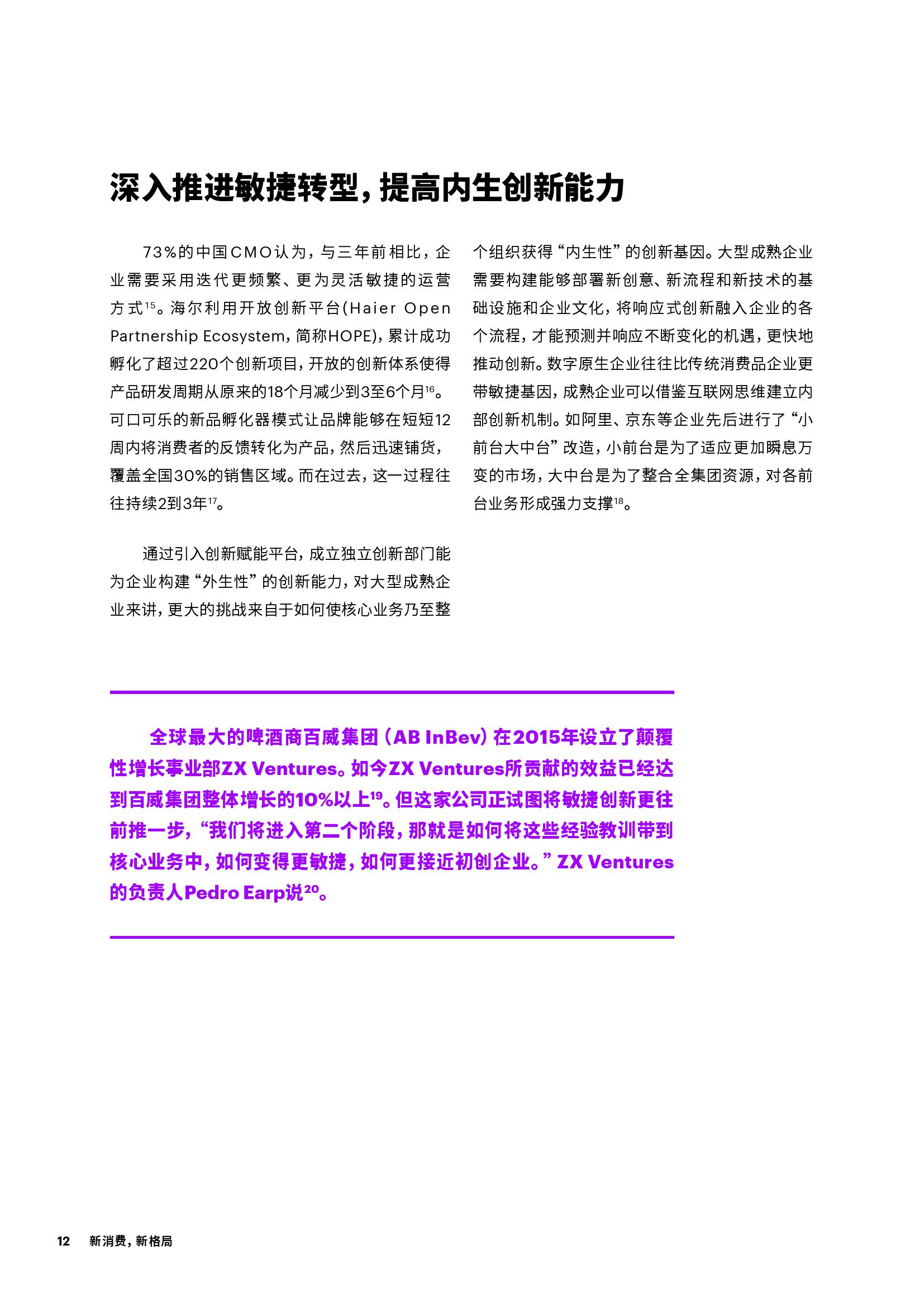 73%的中国CMO告诉我们,与三年前相比,他们认为企业需要采用迭代更频繁、更为灵活敏捷的运营方式,但采取实际行动的比例却不高。在行之有效的案例中,成熟企业也可以部署新创意、新流程和新技术的数字化基础设施,以“响应式创新”更快地捕获鲜活的顾客需求。互联网巨头“小前台大中台”的改造经验值得借鉴。
