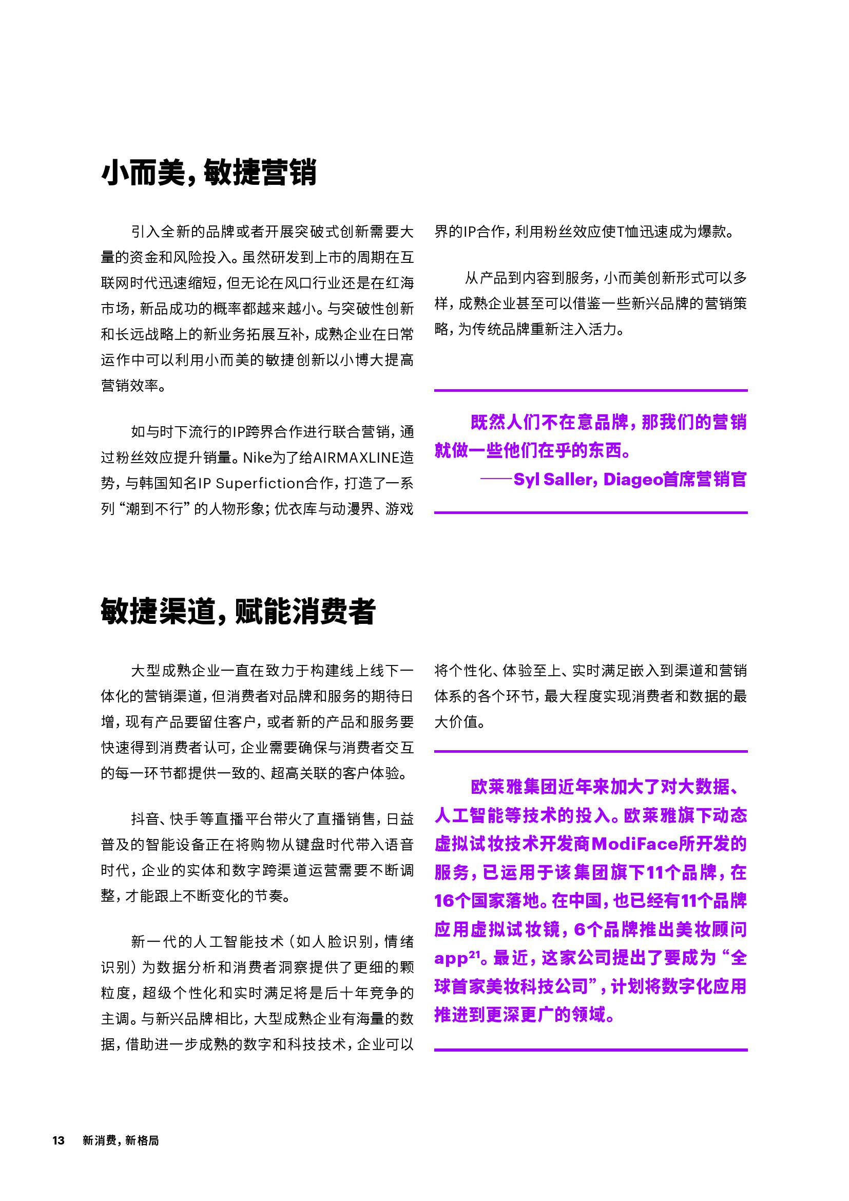 大品牌的现有产品要留住客户,或者让新的产品和服务快速得到消费者认可,需要确保与消费者互动的每一环节都提供全渠道一致、超高关联的顾客体验。新一代的人工智能技术(如人脸识别、情绪识别等)为消费者洞察提供了更细的颗粒度,超级个性化和实时满足将是今后十年竞争的基调。大型成熟企业已有海量数据,但要努力将智能分析嵌入渠道和营销体系,既实现消费数据的价值,又呵护消费者对品牌的信任。