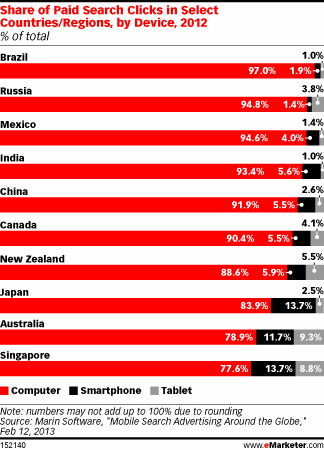 从Marin Software调研部分国家的数据显示,2012年新加坡超过四分之三的付费搜索点击来自PC端,剩下的全都来自智能手机和平板电脑,来自移动终端的搜索点击所占的比例是被调研国家中最高的。