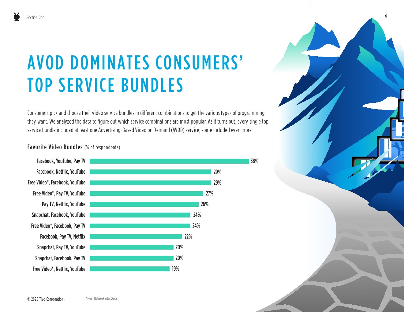 TiVo还发现,当观众选择他们喜欢的服务套餐时,排名前11位的套餐都包括一项AVOD服务。38%的受访者选择了最受欢迎的套餐,其中包括Facebook、YouTube和付费电视。其他受欢迎的套餐包括Facebook、Netflix和YouTube(29%),以及来自网站/应用、Facebook和YouTube的免费视频(29%)。