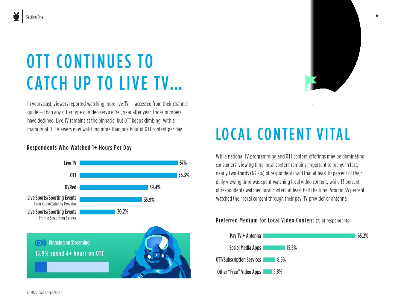 - OTT在观看时间上正在赶上直播电视:56%的OTT观众表示,他们每周至少观看一小时的OTT节目,相比之下,57%的直播电视观众表示他们每周至少观看一小时的OTT节目。