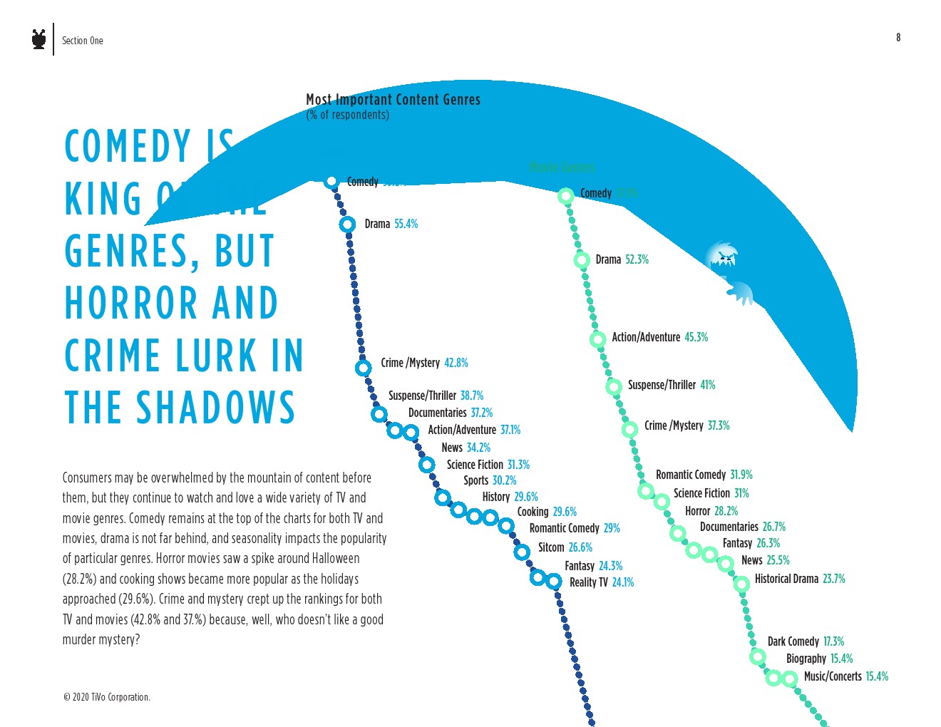 - 观众喜欢大笑:无论是电视(59.2%)还是电影(57.9%),喜剧都是最受欢迎的内容类型。
