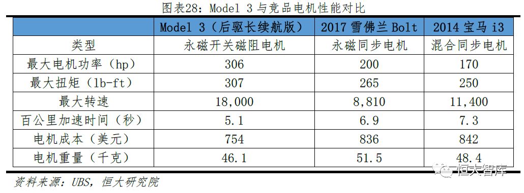 Model 3对传统开关磁阻电机做了一定的改良:在定子加入少量稀土,并设计了控制算法来平滑扭矩波动,最终提高了电机输出功率。Model 3的永磁开关磁阻电机具有体积小、成本低(稀土使用量非常少,而且无需使用铜芯,降低铸造成本)、功率高等优点。相比于Model S/X感应电机83%的能量转化效率,Model3的能量转化效率提升至89%,即89%的电能可以最终转化为驱动力,这样便进一步降低了电耗,提高了续航里程。