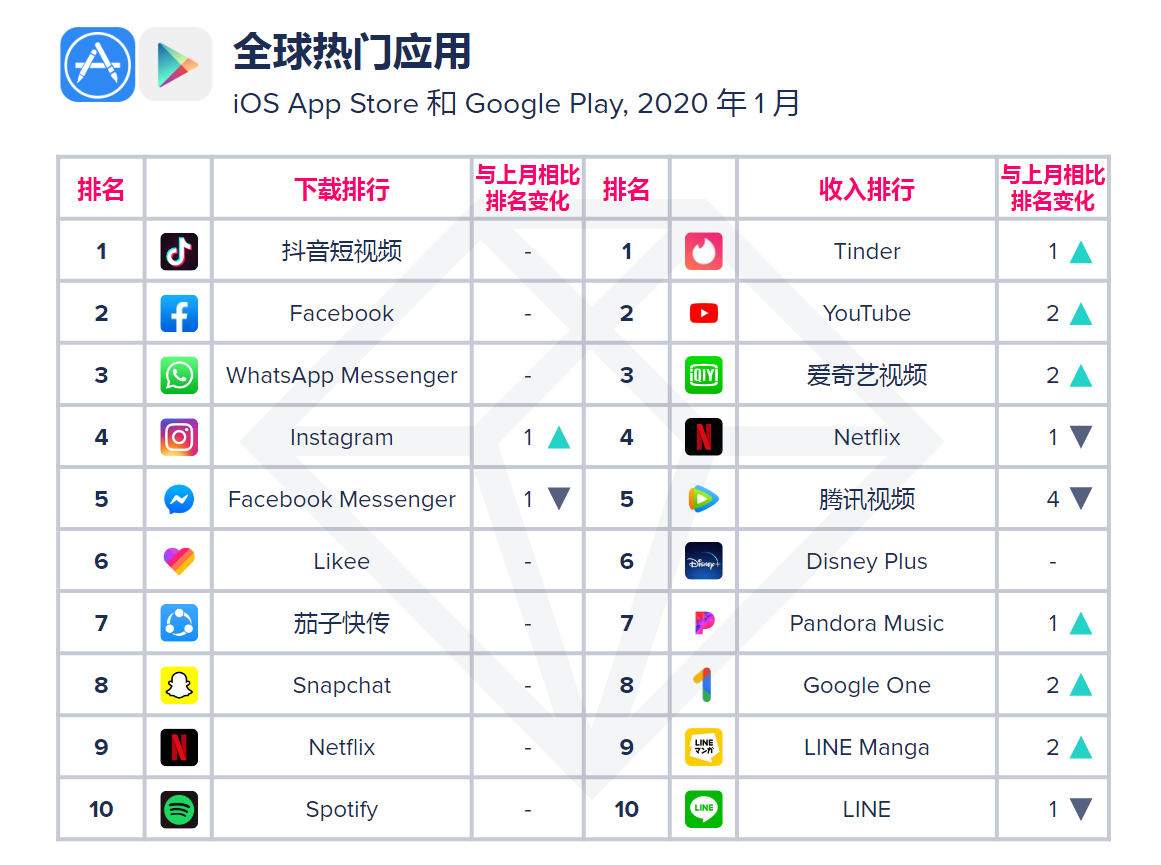 相比游戏,全球应用的下载与收入排行榜单与上月相比无较大排名上的波动,全球 App 市场整体趋于稳定。