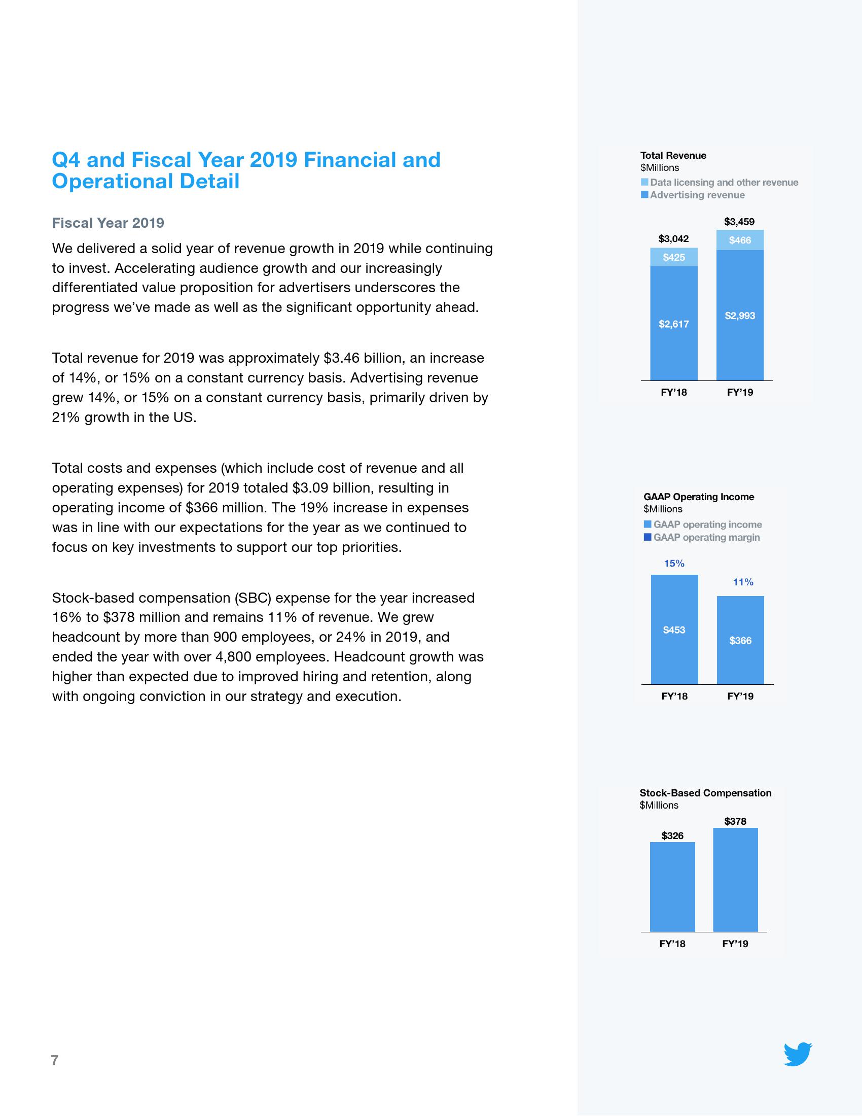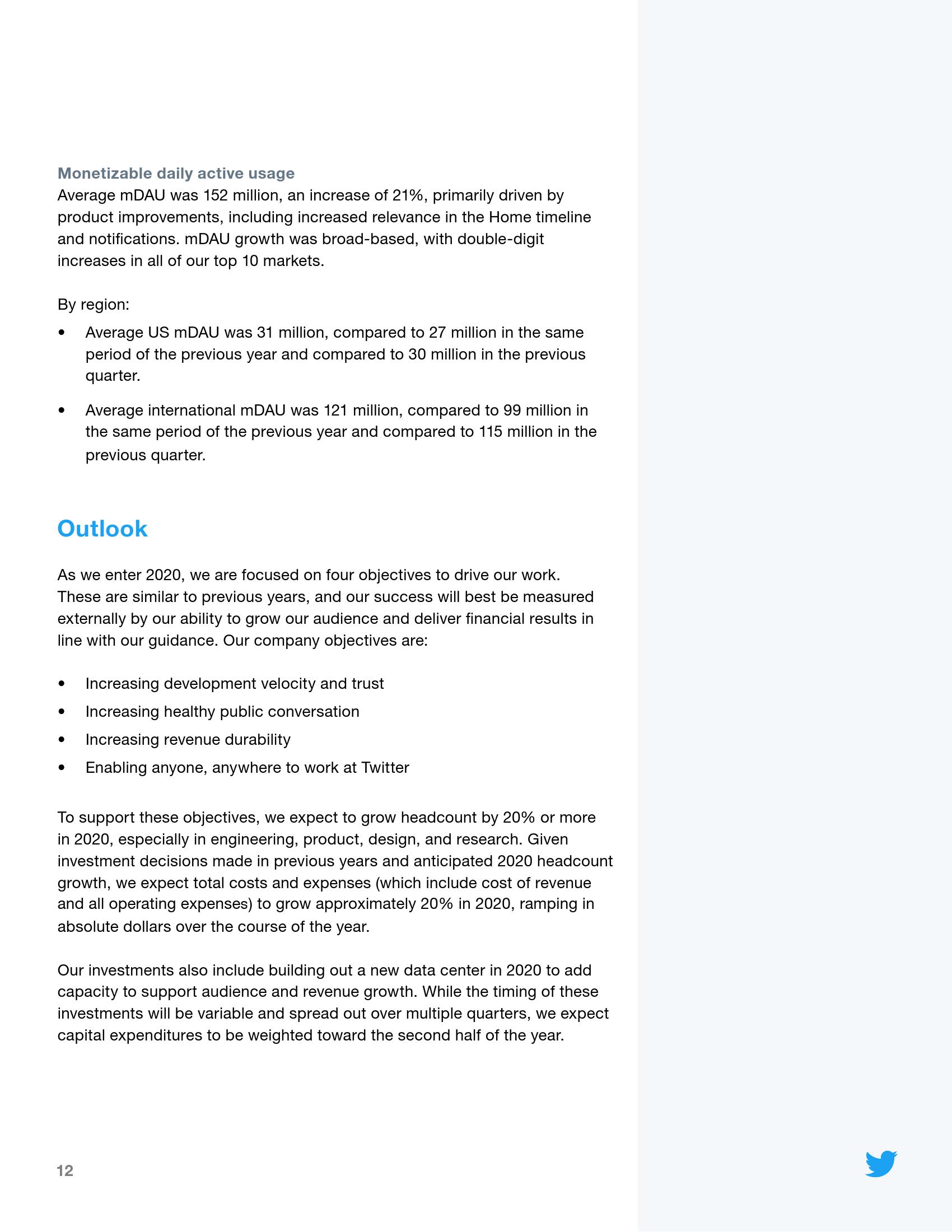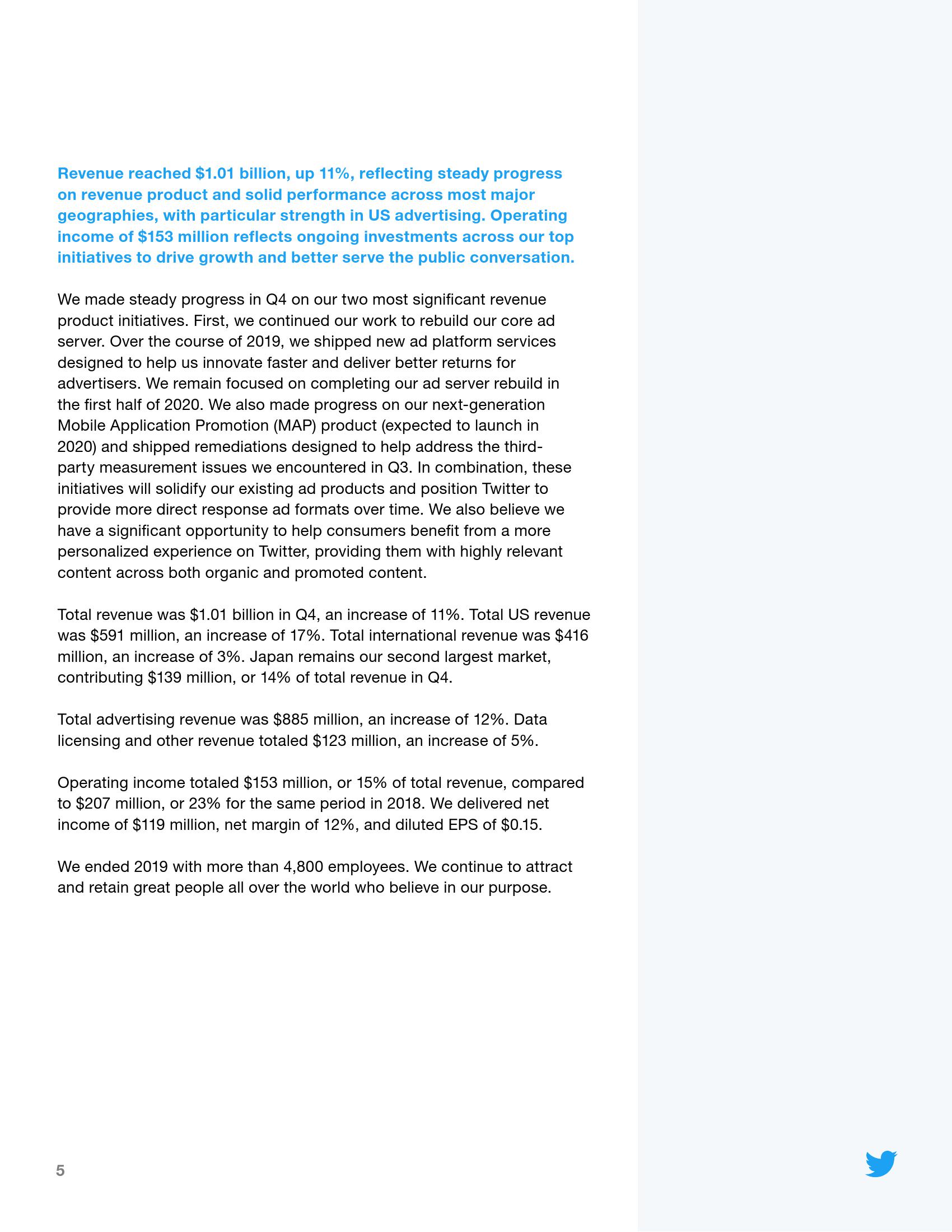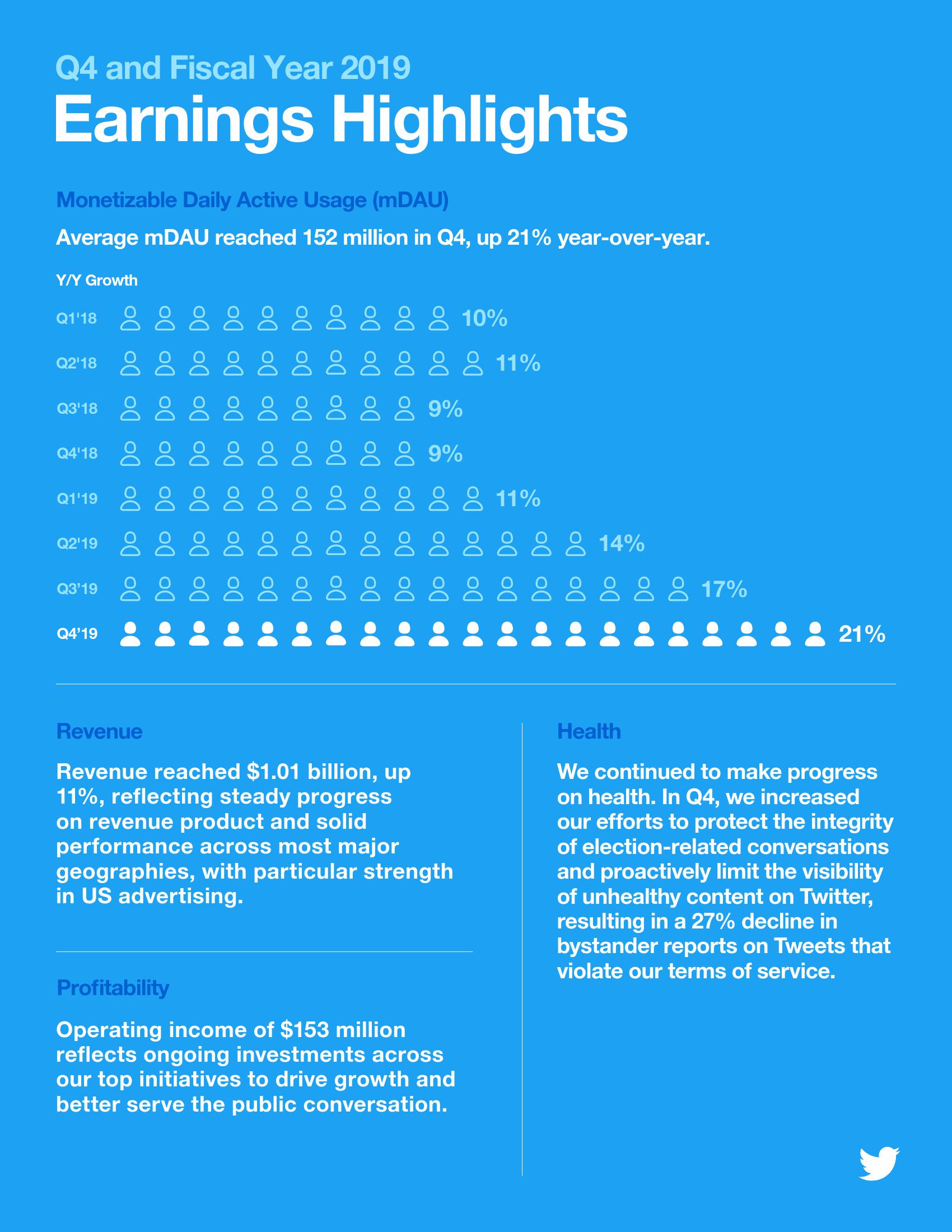 Twitter财报显示,该公司2019年第四季度营收10.1亿美元,同比增长11%;净利润为1.19亿美元,上年同期为2.55亿美元。2019年全年营收34.6亿美元,同比增长14%;净利润为14.7亿美元,上年为12.1亿美元。