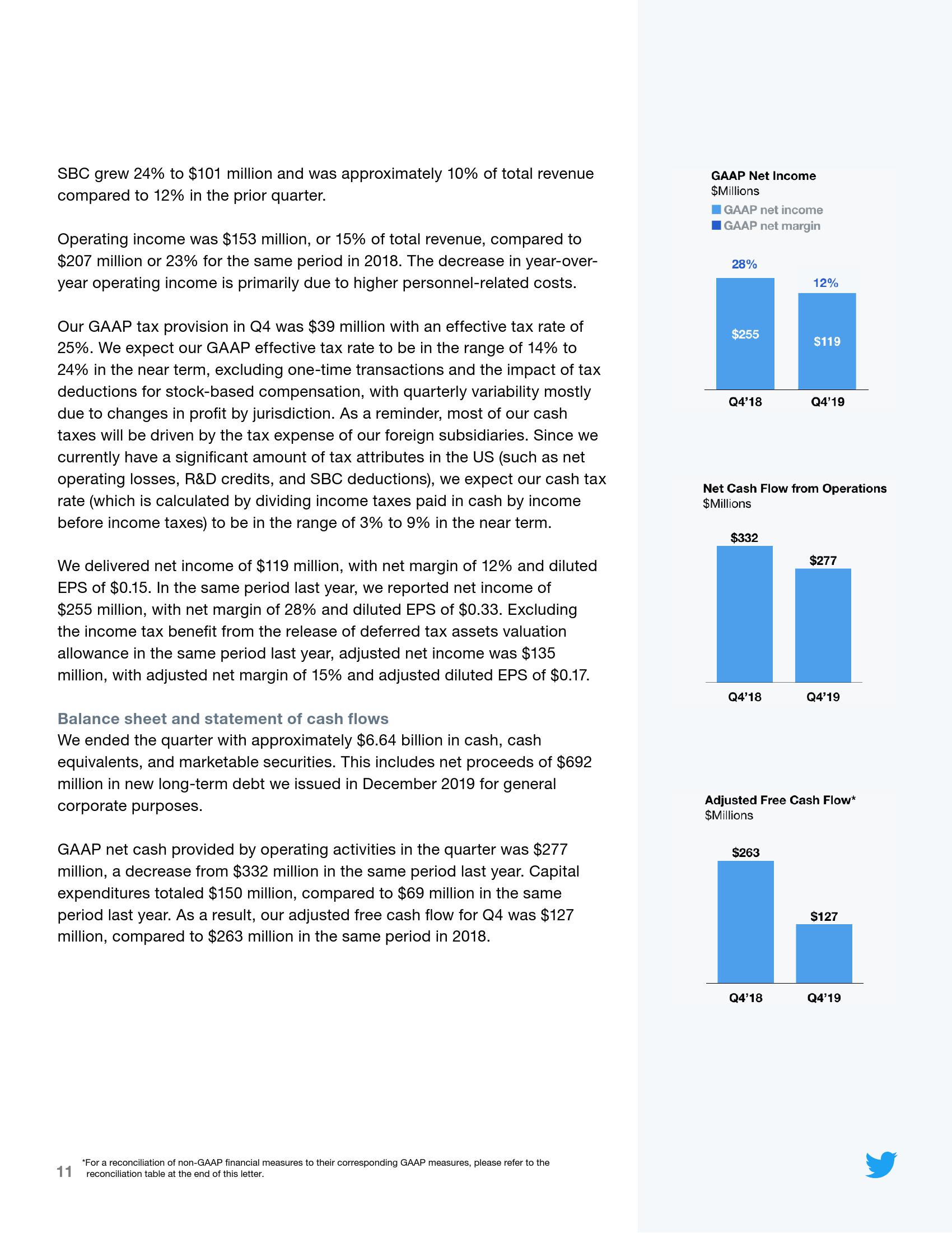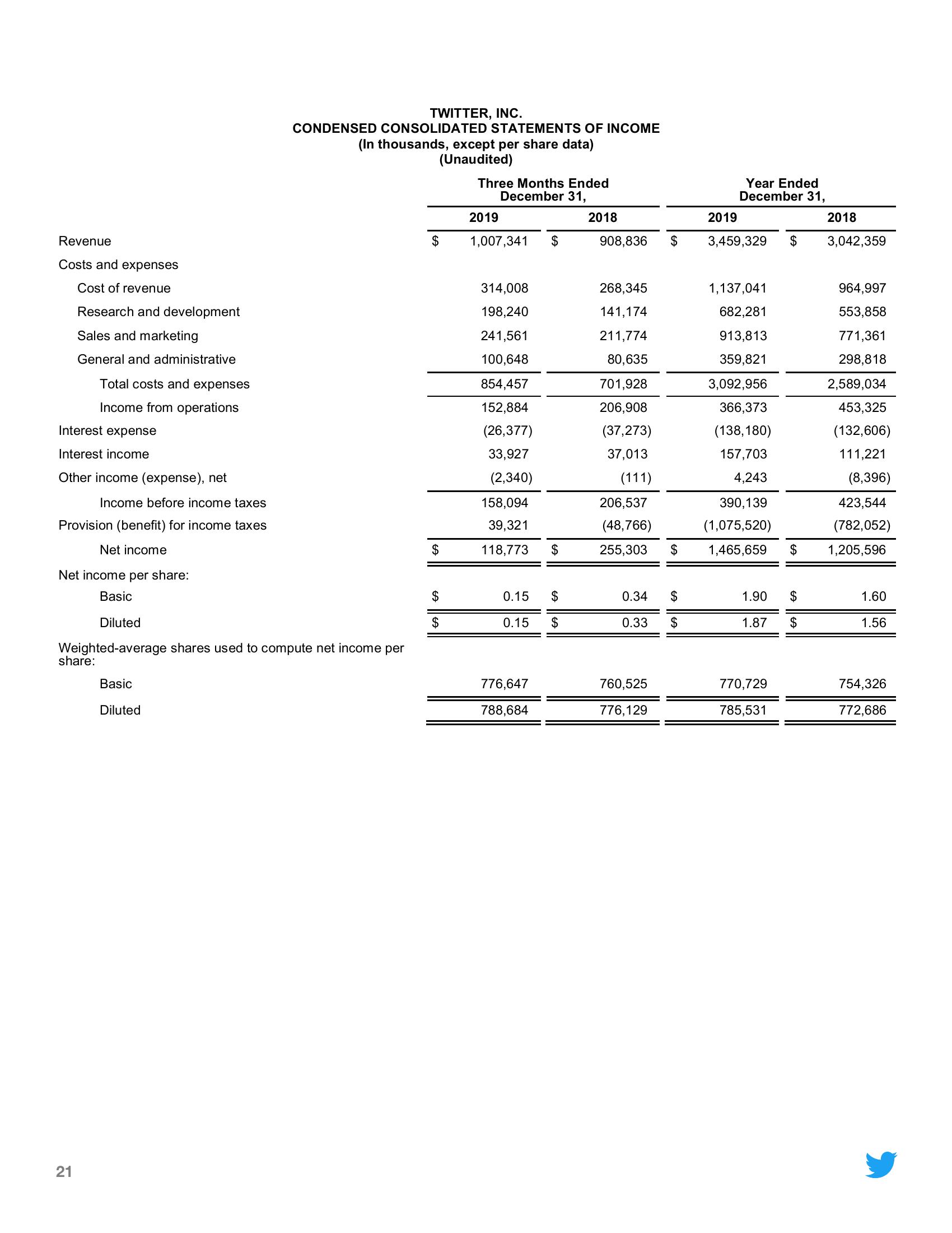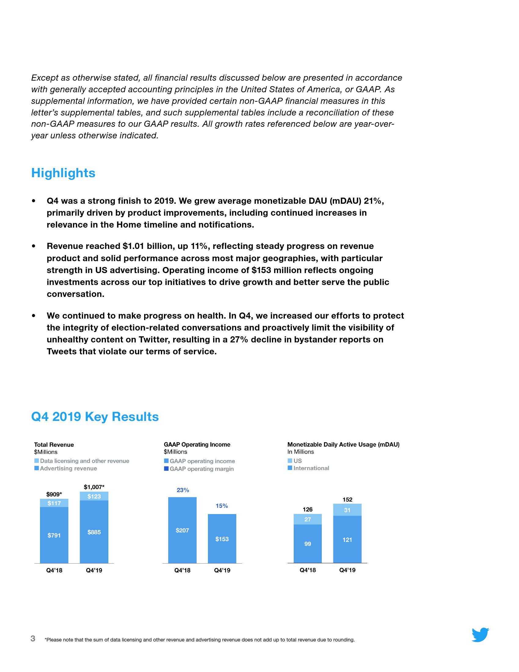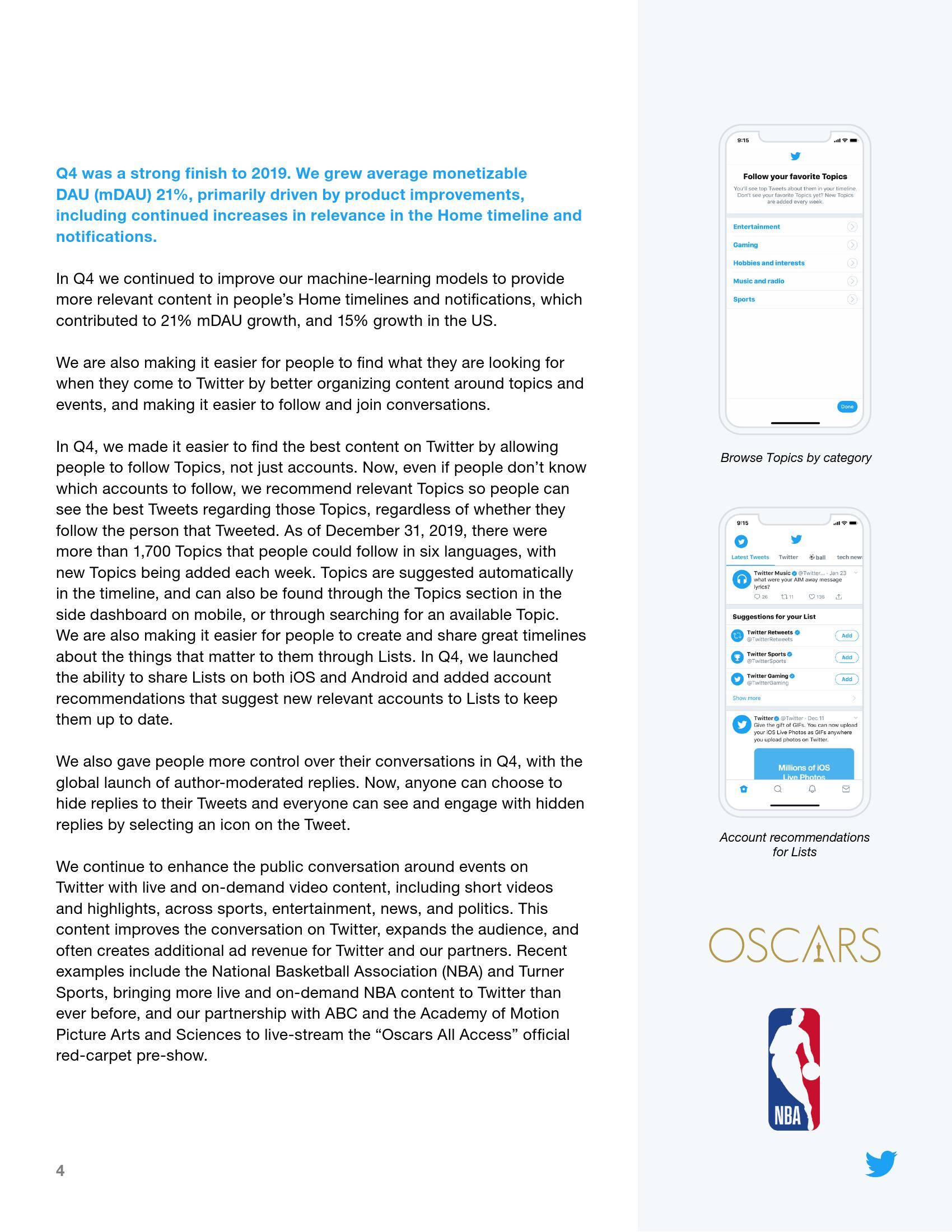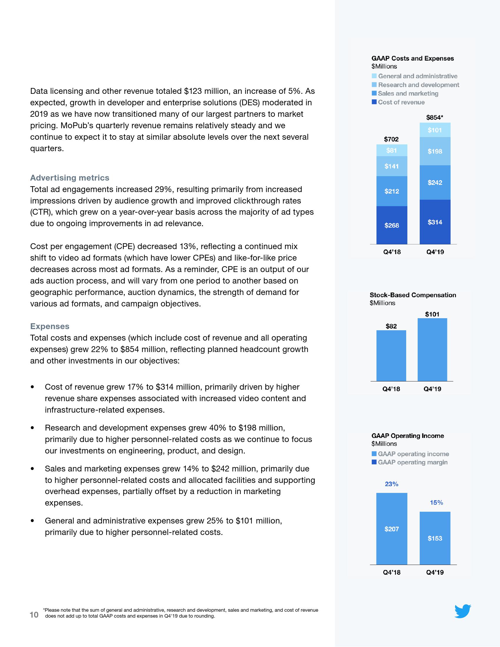 Twitter财报显示,该公司2019年第四季度营收10.1亿美元,同比增长11%;净利润为1.19亿美元,上年同期为2.55亿美元。2019年全年营收34.6亿美元,同比增长14%;净利润为14.7亿美元,上年为12.1亿美元。