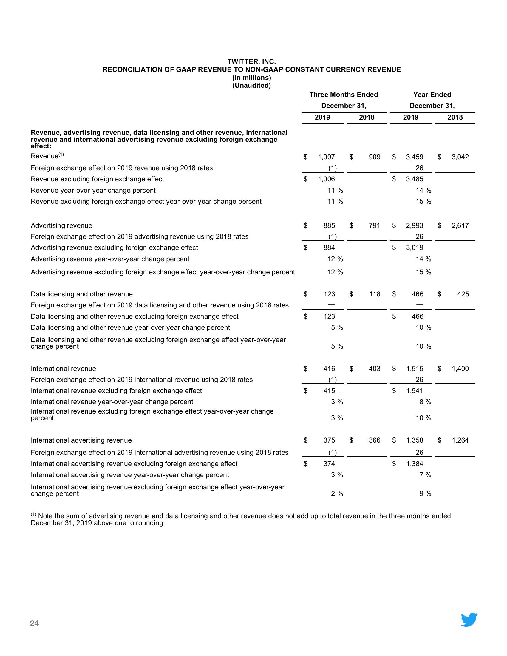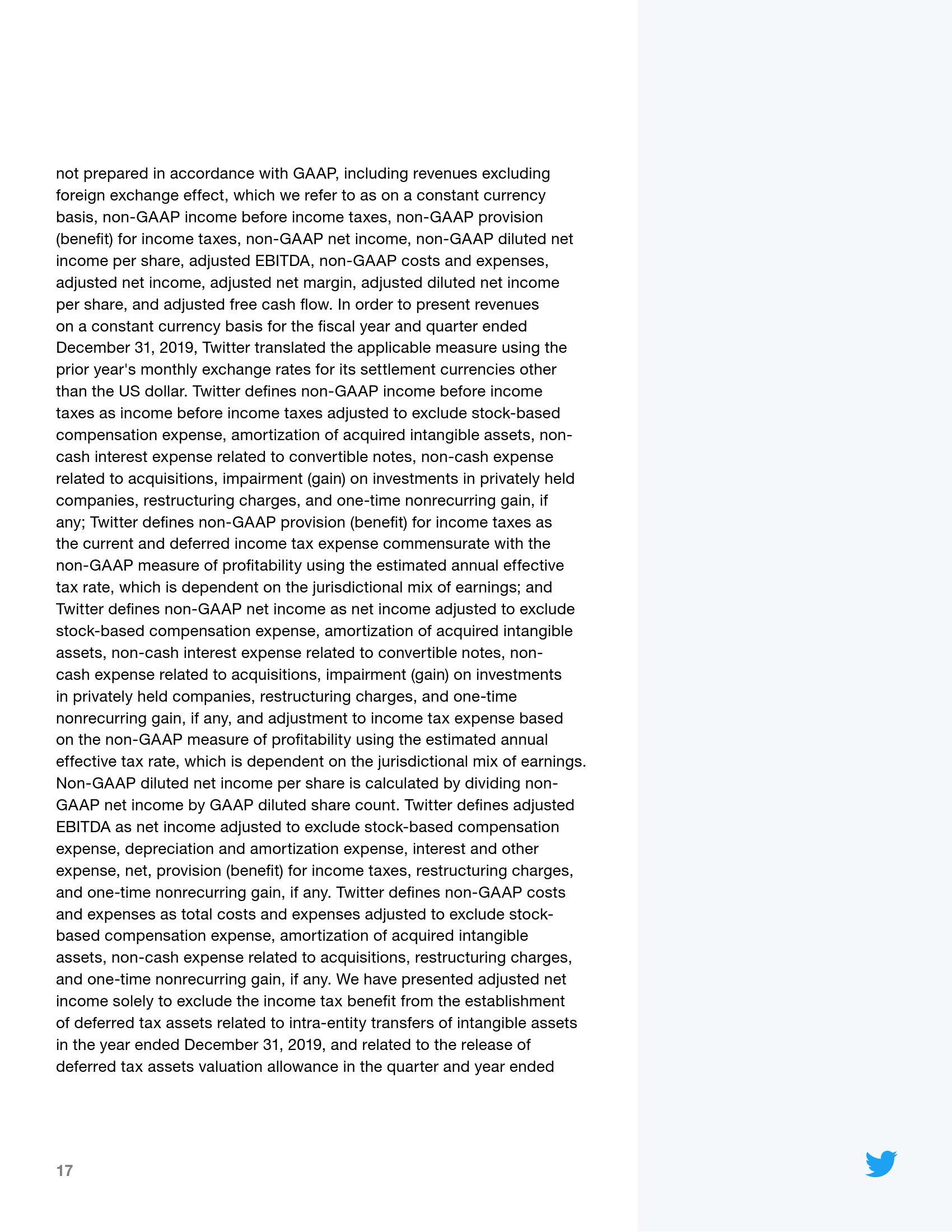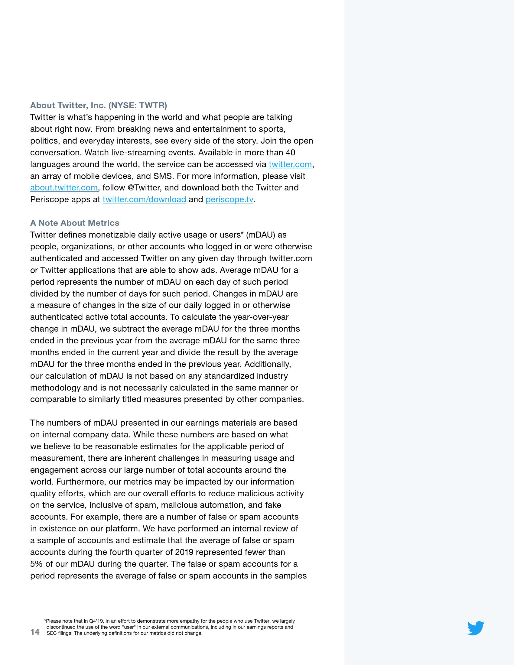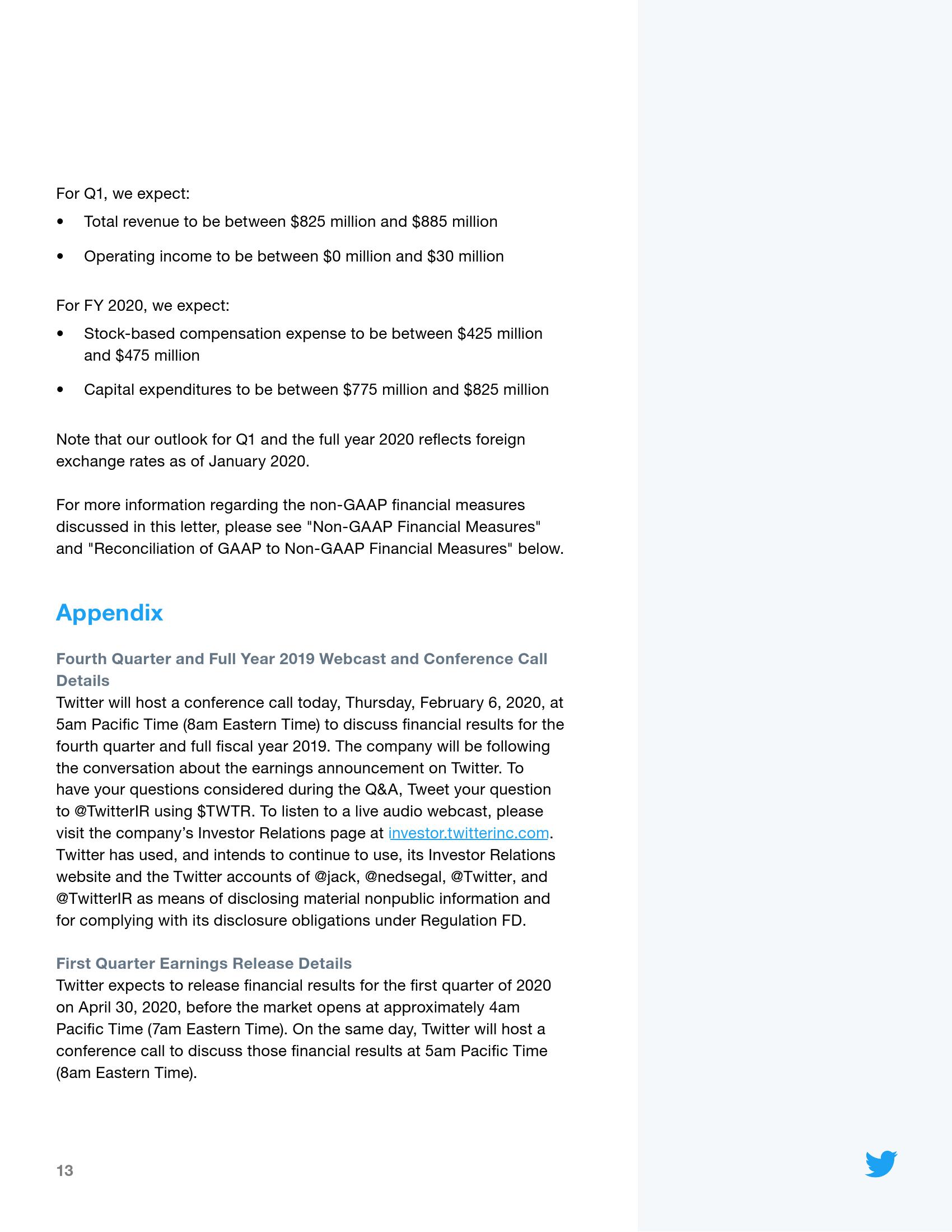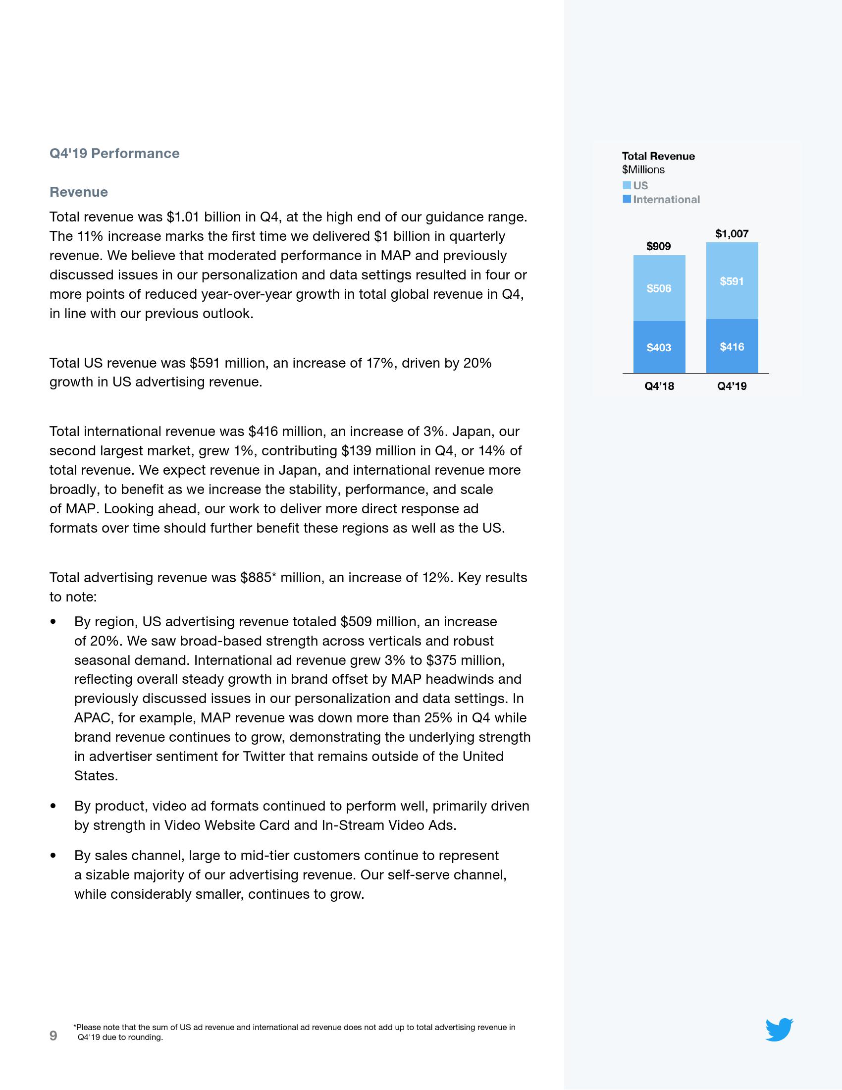 对于2020年第一季度,Twitter预计营收在8.25亿-8.85亿美元,分析师预期为8.73亿美元。