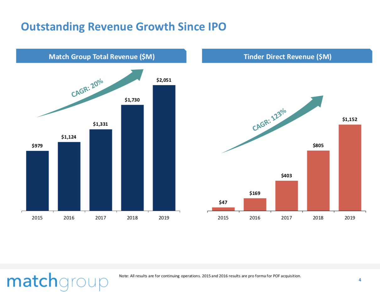 根据Match发布的4Q19财报,公司营收同比增长20%至5.47亿美元,2019年全年营收突破20亿美元,其中Tinder营收占一半以上,是营收增长的驱动力。