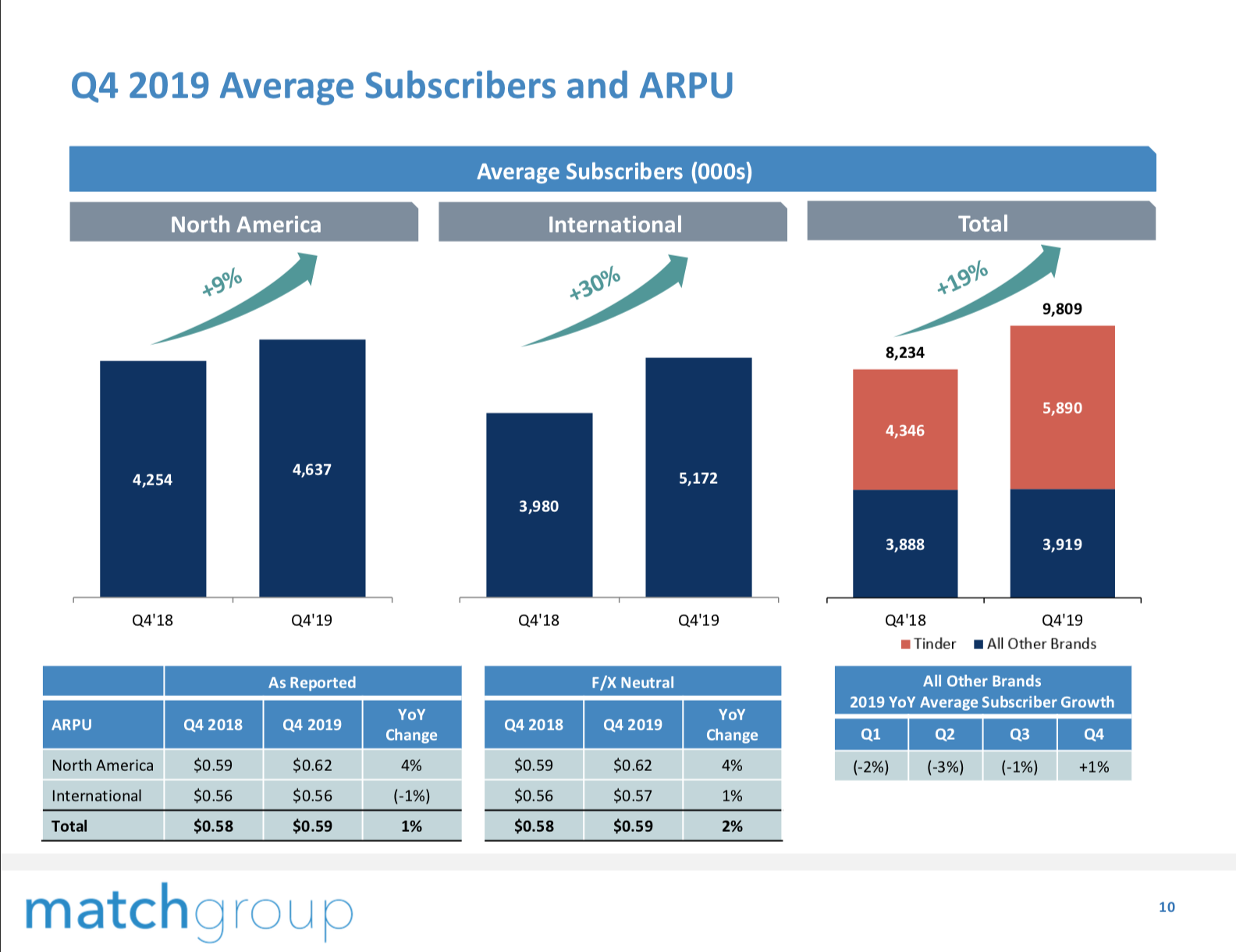 公司付费订阅会员达到981万人,同比增长19%;北美市场同比增长9%,国际市场同比增长30%;付费会员中Tinder占6成左右。