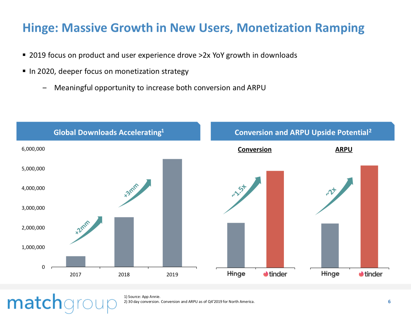 2019年主要是优化产品和体验,通过2个成功的广告活动实现用户下载翻倍,目前该产品在北美和英国都很有竞争力;收入增长4倍,对比tinder,Hinge的转化和arpu提升空间很大