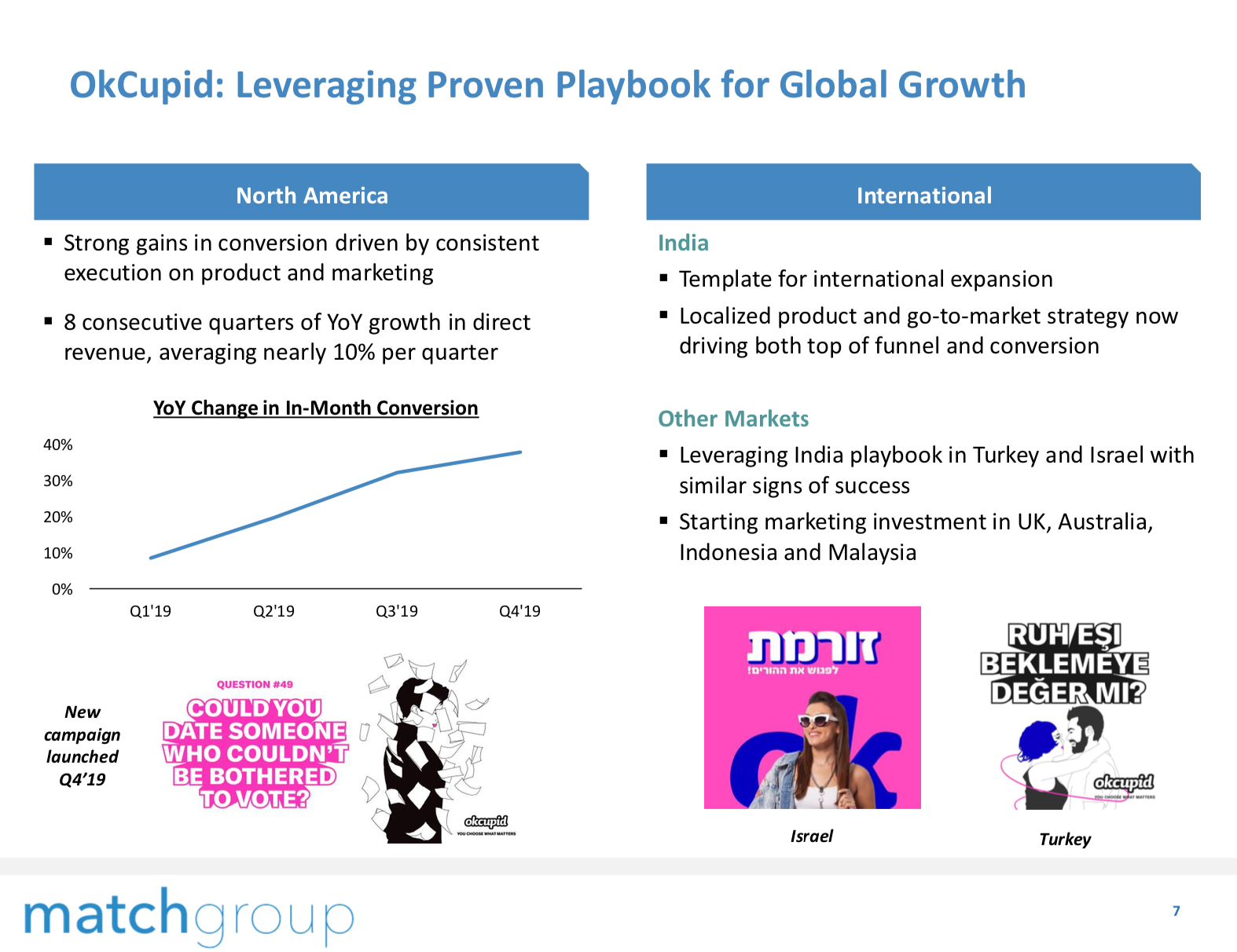 不仅在印度市场也在北美市场增长迅猛,已经连续保持8个季度年比年10%以上的增长,主要归功于专注产品的核心功能和创新的营销活动,这些营销活动再次引起人们对OkCupid的关注。印度市场的经验将会被扩大到其他地区,在土耳其和以色列已经在投资相应的计划。