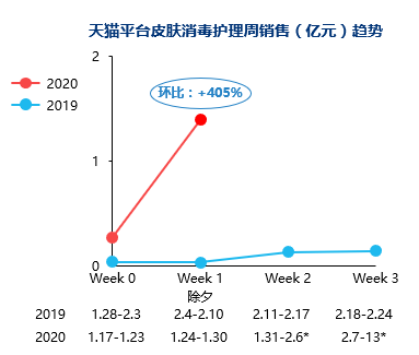 进一步观察分周销售表现,可看到在疫情升温后,消费者对于皮肤消毒护理产品(75%酒精喷雾剂、消毒液)需求提高,相似于防疫产品的供不应求现象,消毒相关产品未来几周的销售趋势仍待观察。