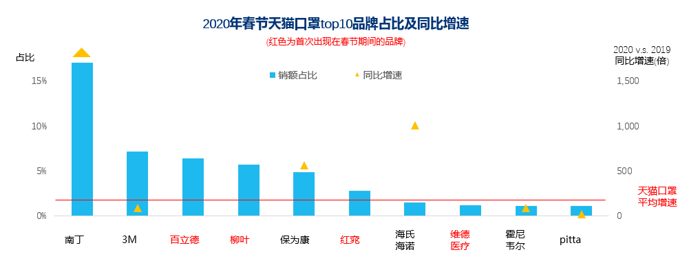 口罩头部品牌表现,南丁位居榜首,主要销售婴童口罩,且春节期间仍发货成为品牌胜出的重要因素;百立德等4个国产品牌首次入榜春节档,由于库存备货问题3M、霍尼韦尔、pitta增长则不及天猫整体;特殊时期防护用品统筹调配,未来品牌格局仍待观察。