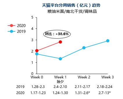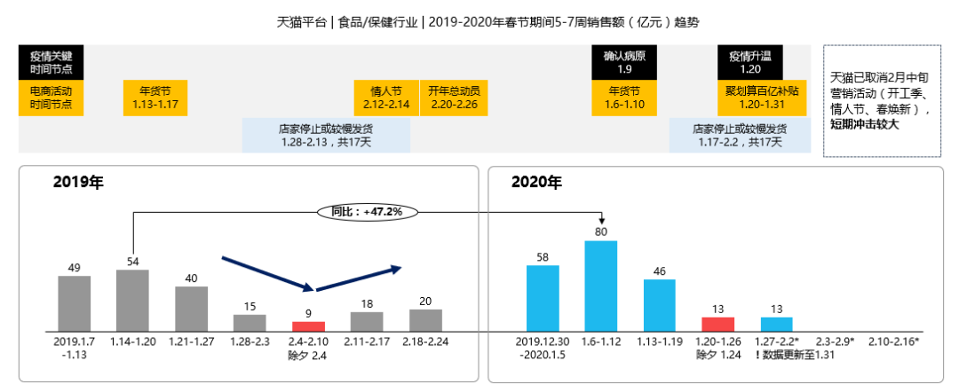 食品、母婴行业:2020年年货节发生在疫情升温前,整体食品行业保持高速双位数增长。今年天猫聚划算百亿补贴活动带动除夕当周销售提升,除夕后一周目前业绩持平;同时间因受物流限制,疫情升温后对于整体食品保健行业趋势影响暂时还无法判定。目前已知2月中旬既有营销活动取消,可预见短期或受较大冲击。