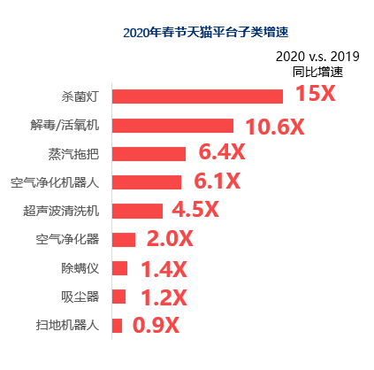 此次疫情对消费者的消费心理带来的影响,进一步发现带有“健康/杀菌/消毒属性”的生活电器持续走热,需求偏好进一步加强。即便是传统品类吸尘器、空气净化器、扫地机器人受品质生活影响,依旧热销;蒸汽拖把、解毒/活氧机等新兴品类有效解决疫情期间消毒需求,获得快速发展。另外,在功能性灯具(杀菌灯)同样迎来一波爆发,值得留意。