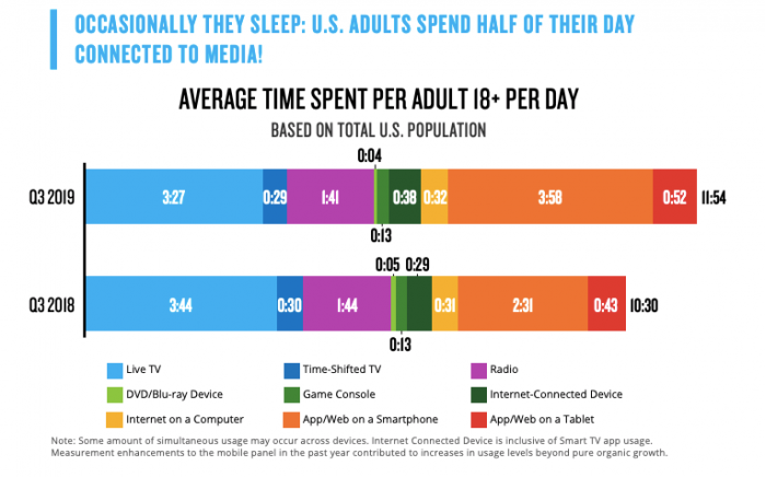 如今,美国消费者似乎比以往任何时候都更加沉迷于自己的设备,平均每天消费者花费11个小时54分钟与电视、智能手机、游戏机等进行互动。在大部分时间(3小时58分钟)中使用应用程序或通过智能手机访问网络,然后是观看直播电视(3小时27分钟)。与去年相比,美国消费者在数字媒体内容上多花费了近90分钟。