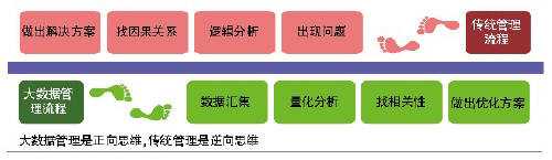 传统的企业管理流程是出现问题、逻辑分析、找出因果关系、提出解决方案,使问题企业成为优秀企业,这是逆向思维模式。大数据竞争战略咨询流程是收集数据、量化分析、找出相互关系、提出优化方案,使企业从优秀到卓越,是正向思维模式。