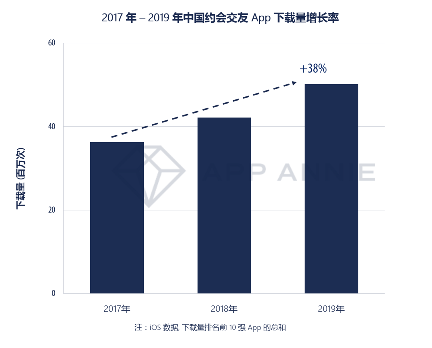 移动数据分析领导者 App Annie 的数据显示,从 2017 年到 2019 年,中国 iOS 市场约会交友 App 的下载量呈现逐年攀升的态势,涨幅接近 40%。这意味着越来越多的人们开始尝试使用 App 寻找真爱。