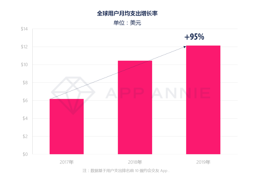 约会交友 App 的渐趋火爆不仅仅局限于中国市场。自 2012 年起,全球 iOS 和 Google Play 上交友类 App 的下载量累计达到 17 亿次。与此同时,在 2019 年,交友类 App 的全球用户支出达到了 22 亿美元,与 2 年前相比翻了一倍。同样的增长情况也体现在单一用户身上,我们发现相比于 2017 年,2019年的全球月均用户支出增长率高达 95%。