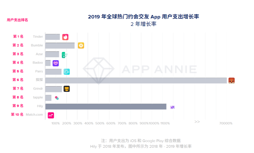 在亚洲地区,来自日本市场的 Pairs 和 Tapple 分别在全球盈利能力方面排名第 5 位和第 8 位,韩国应用 Azar 在全球用户支出排行榜中位居第 3 名。值得注意的是,来自中国市场的探探位居第 6 名,但其从 2017 年到 2019 年增幅约为 70,000%,增长跨度全球最大。这些 App 专注于打造更适应亚洲用户情感需求和文化特点的体验,可与传统公司在发展和盈利能力方面相抗衡。