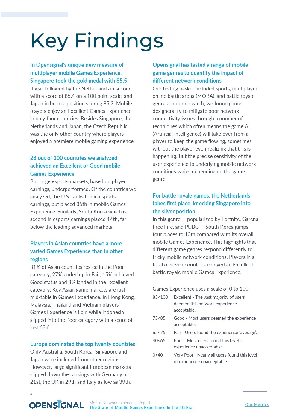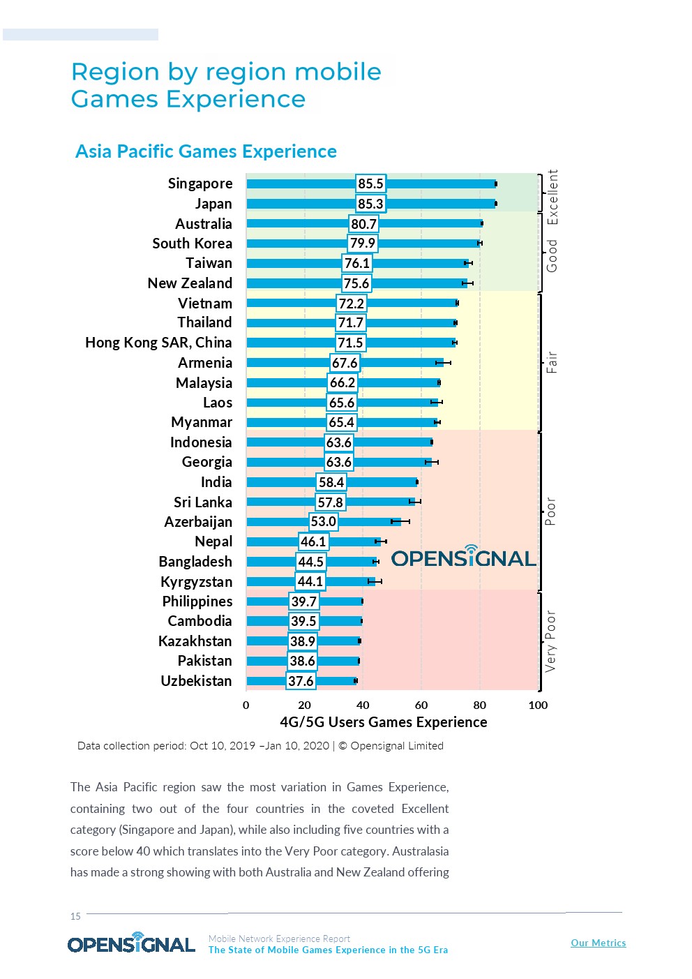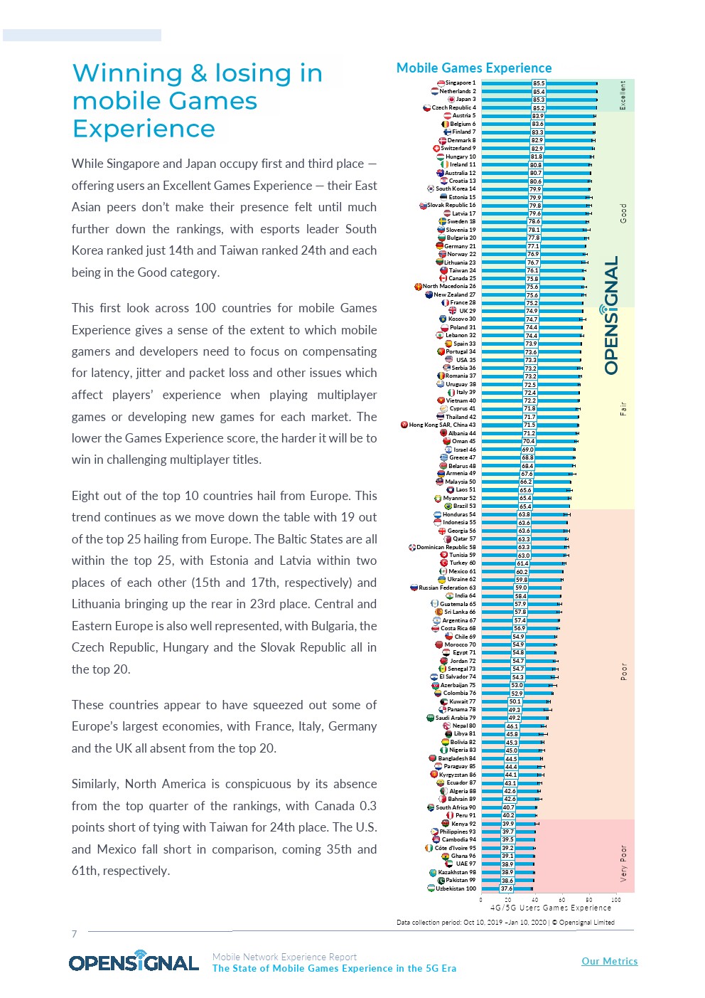 Opensignal发布了新报告“5G时代的移动游戏体验”。根据其手游体验新标准,新加坡以85.5分排在首位。