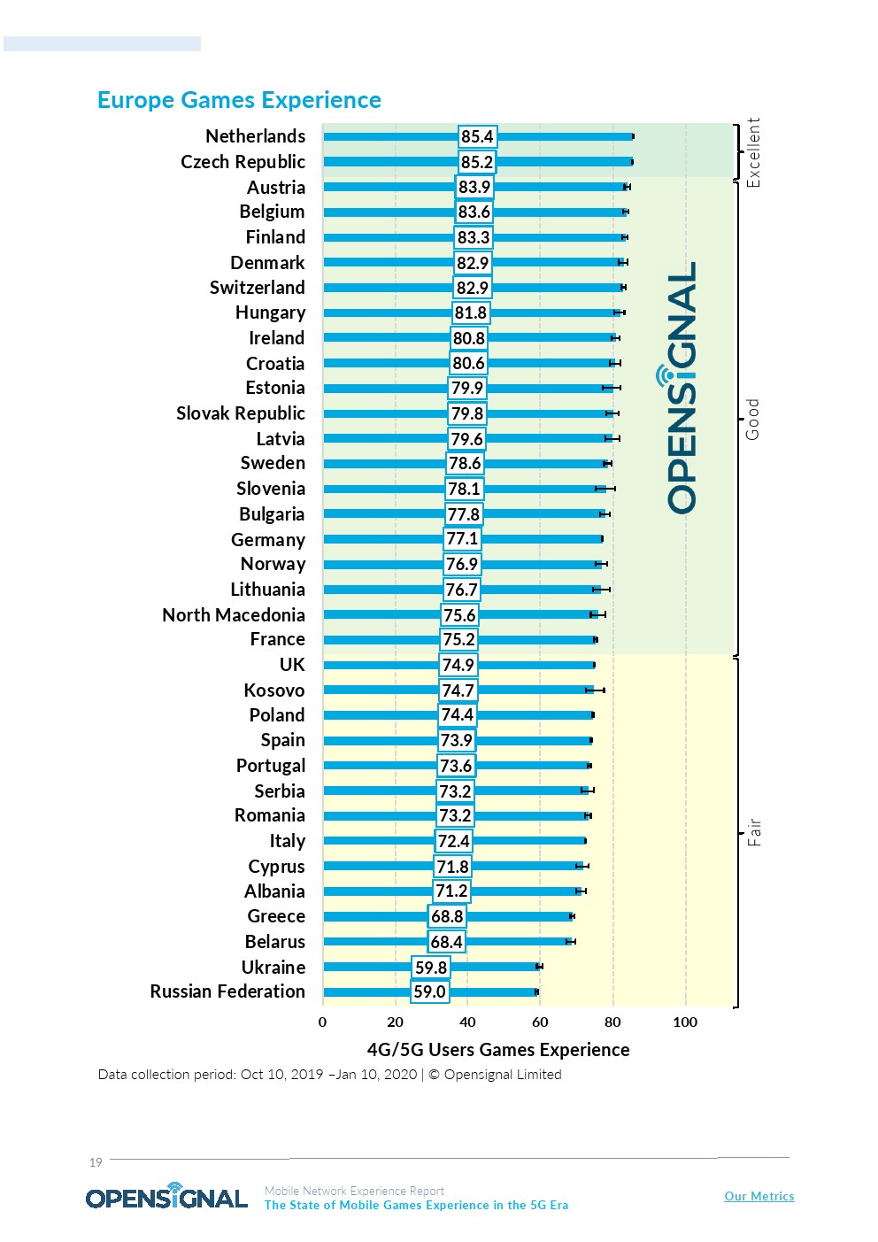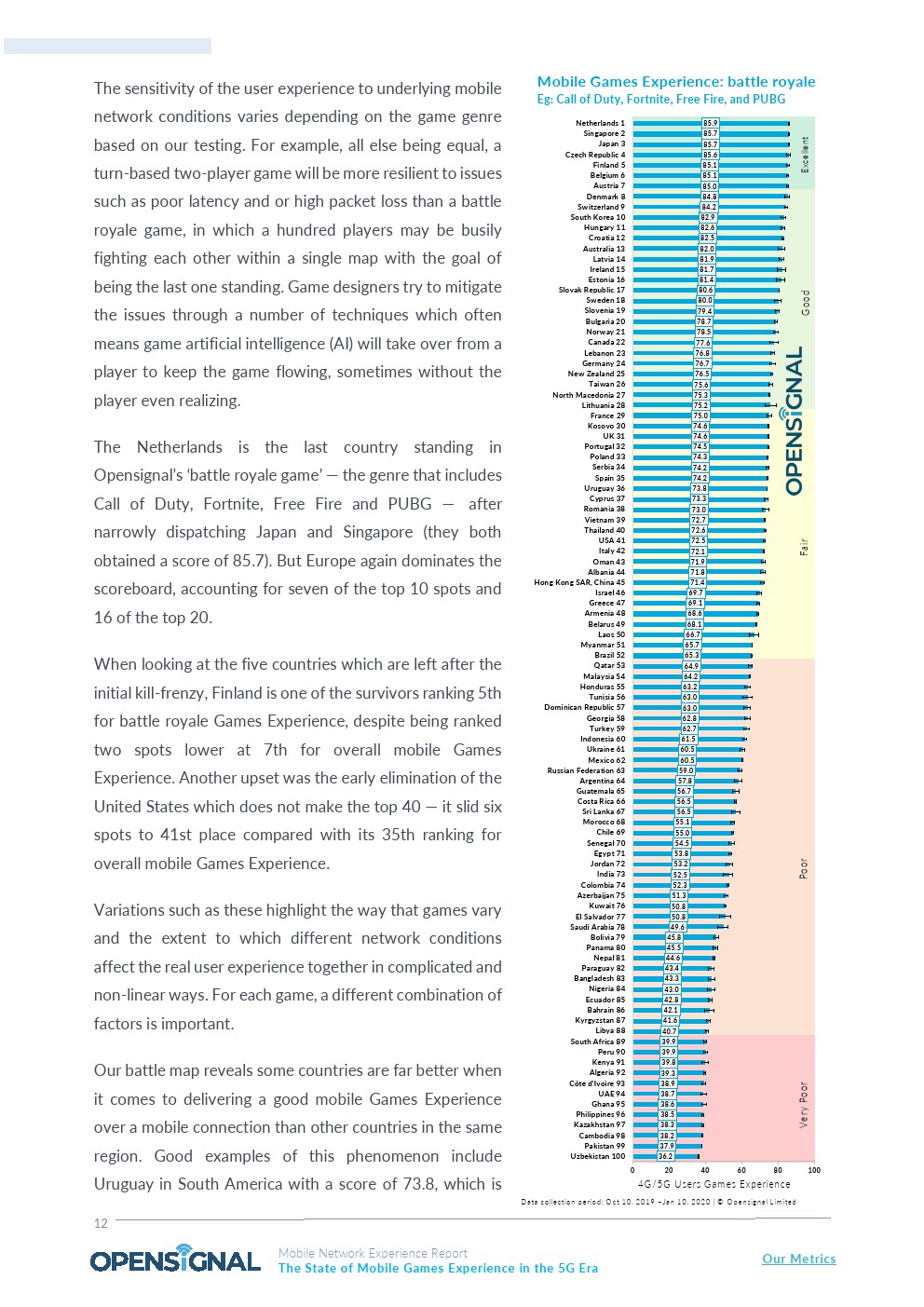 OpenSignal测试了一系列手机游戏类型,以量化不同网络条件的影响。荷兰在皇家战役游戏体验方面排名第一,新加坡排名第二。