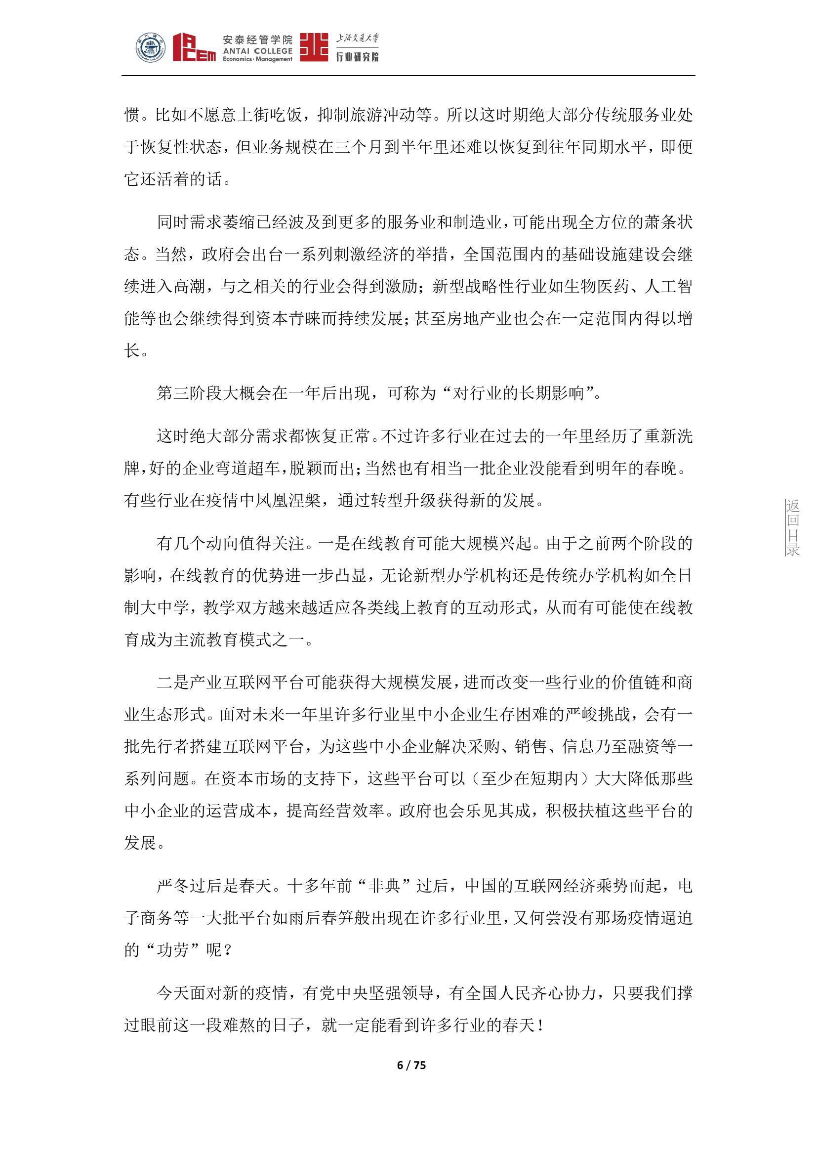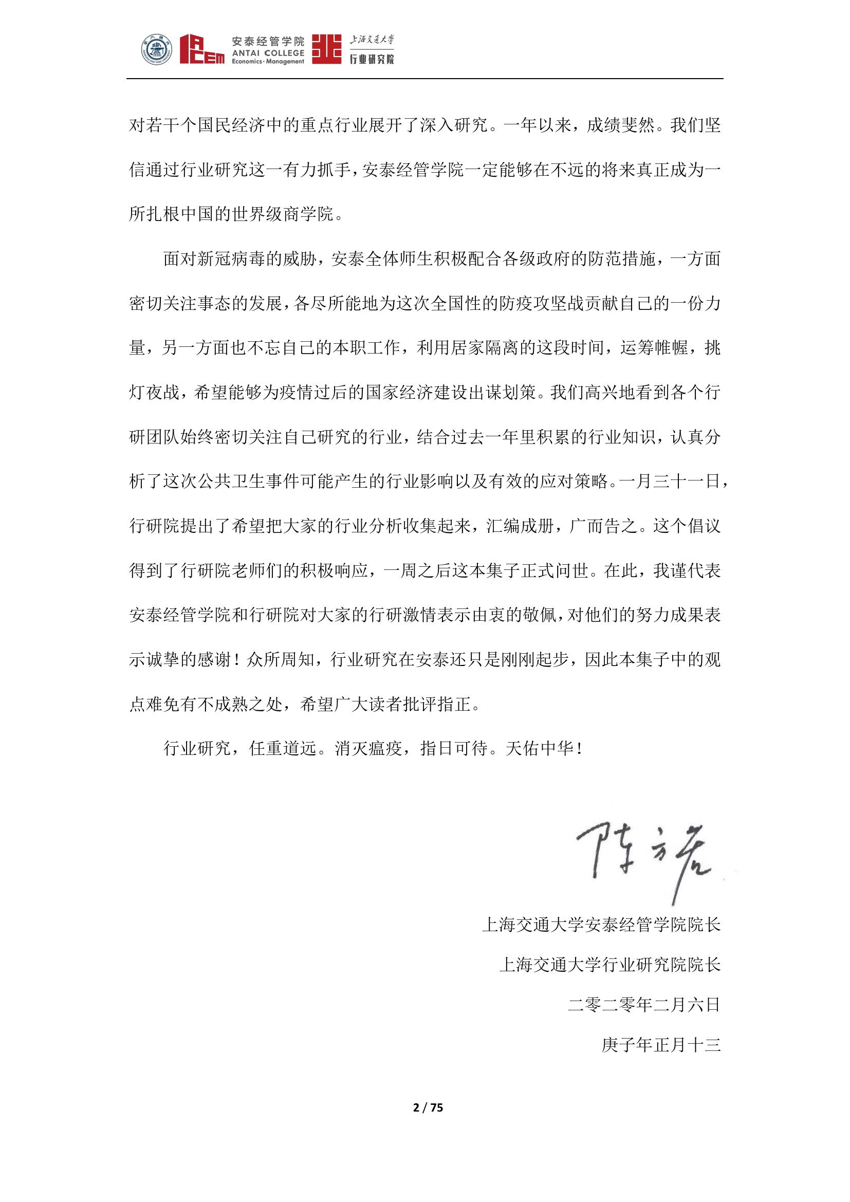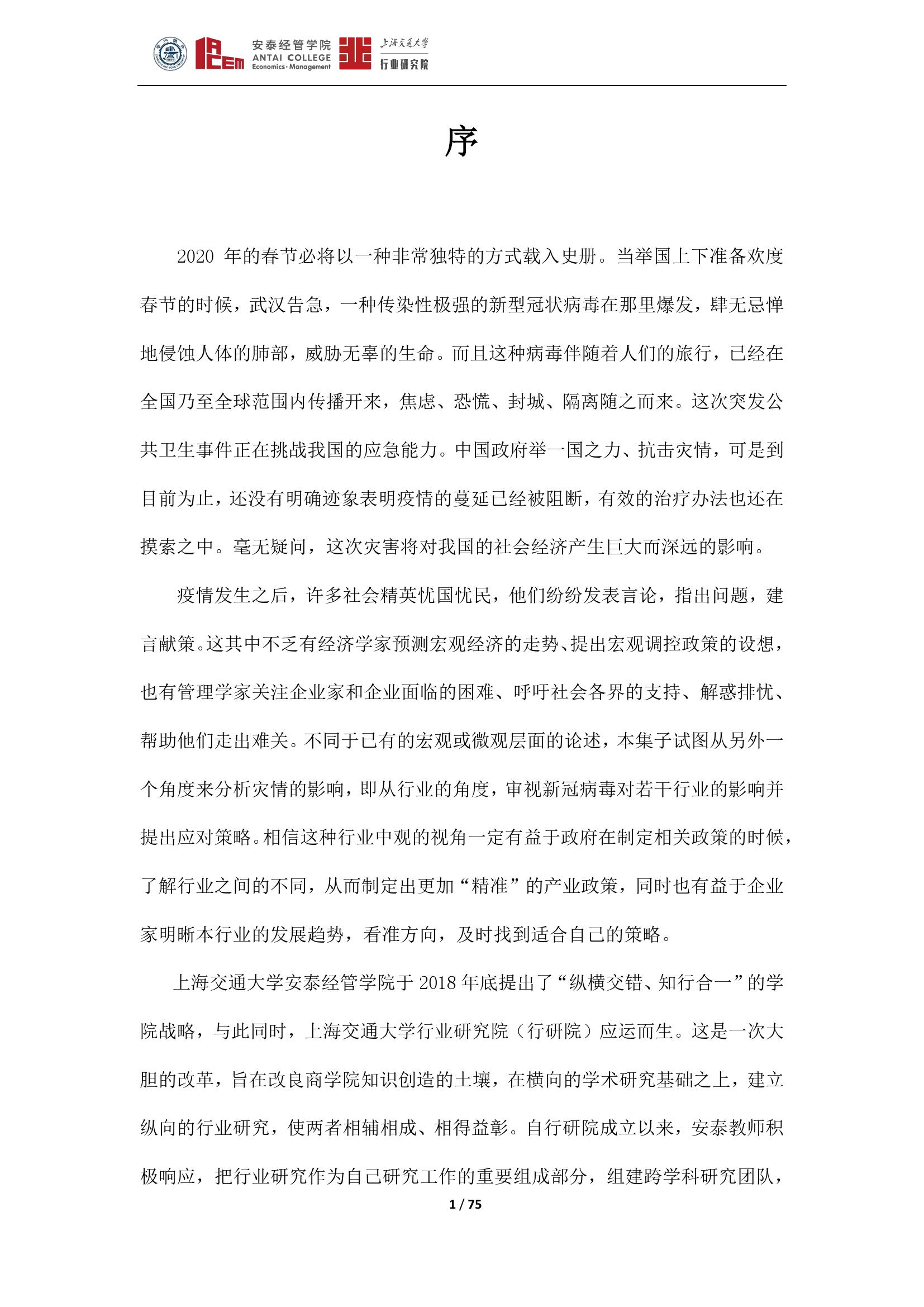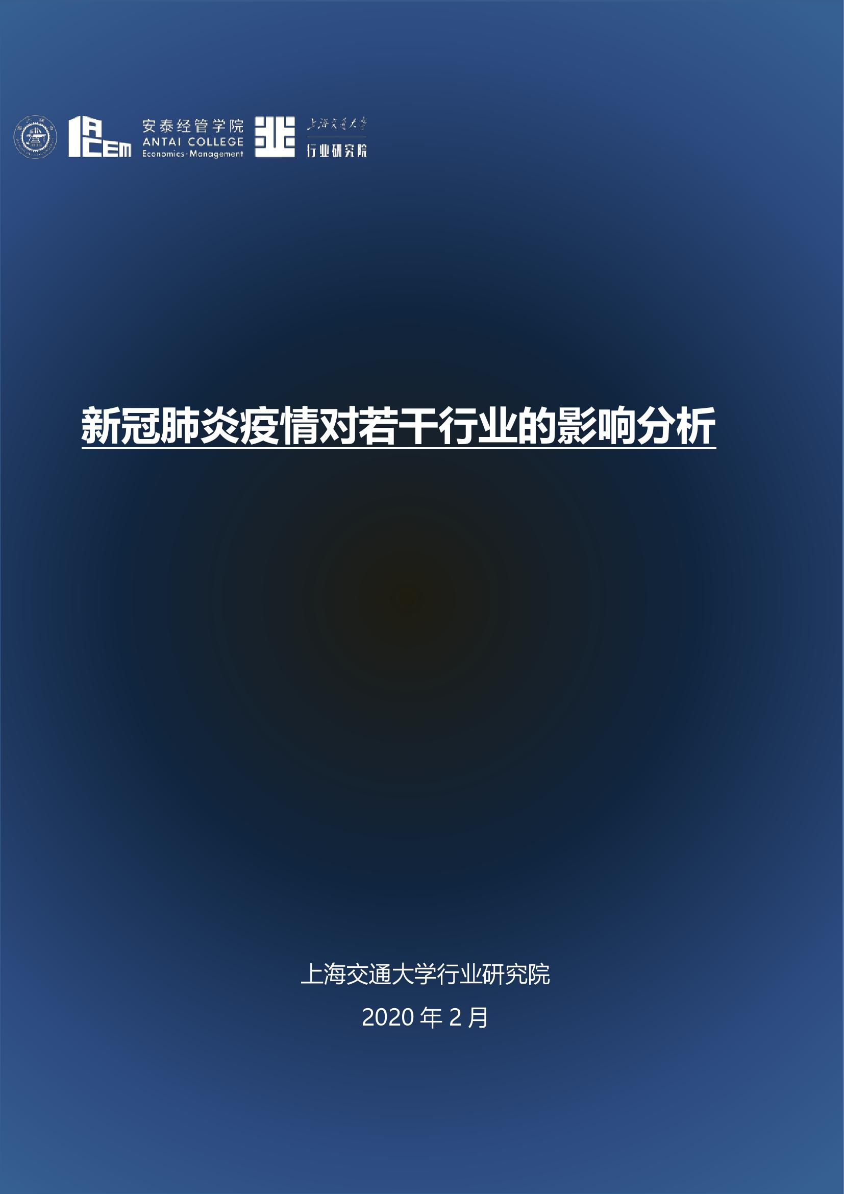 日前,由上海交通大学行业研究院院长、安泰经管学院院长陈方若带头,上海交通大学行业研究院发布了囊括19个行业的《新冠肺炎疫情对若干行业的影响分析》。该观点集展现了此次疫情对各行业的影响和一些应对策略,希望对疫后经济发展有所帮助。